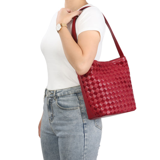 Woven Leather Shoulder Bag with Structured Bucket Silhouette