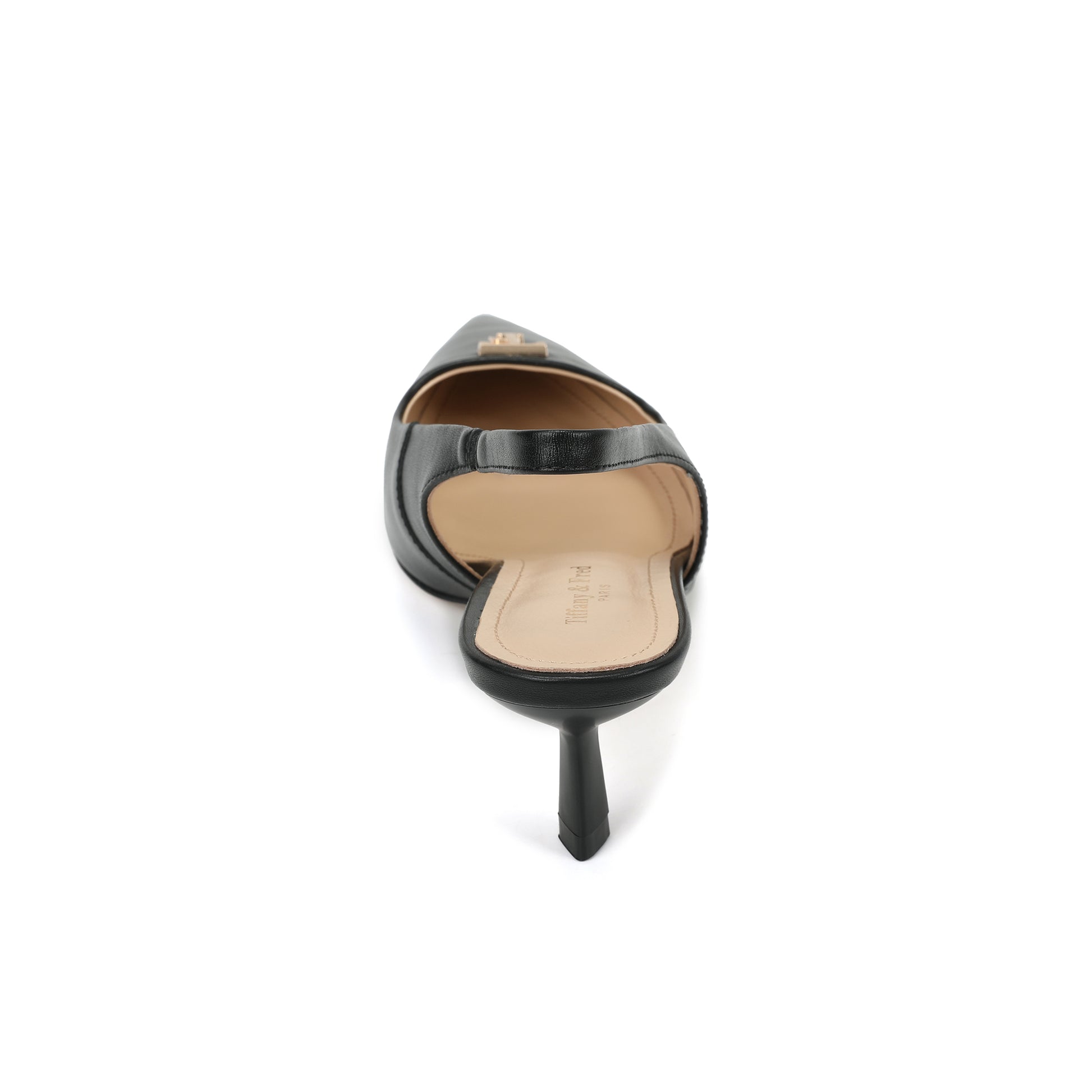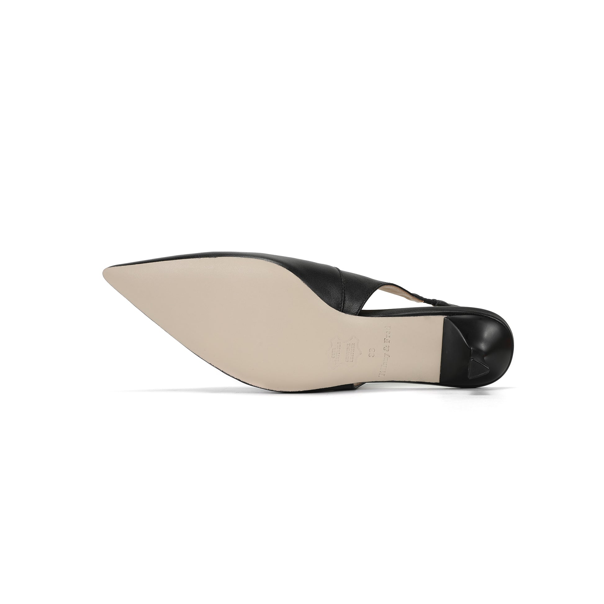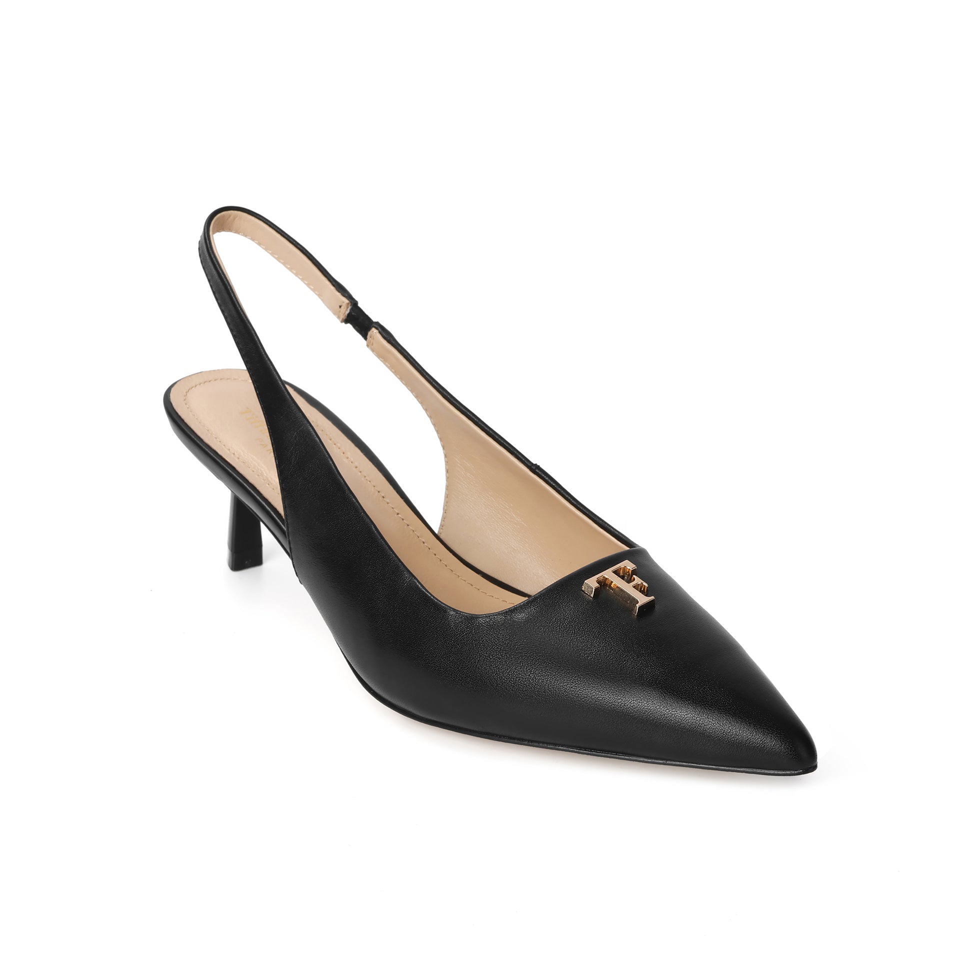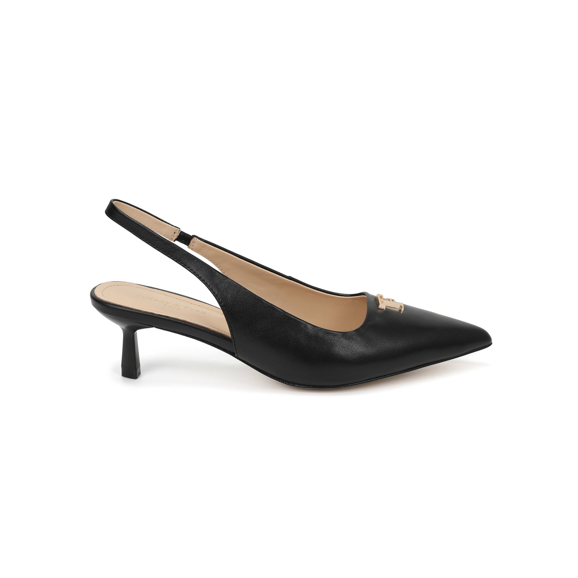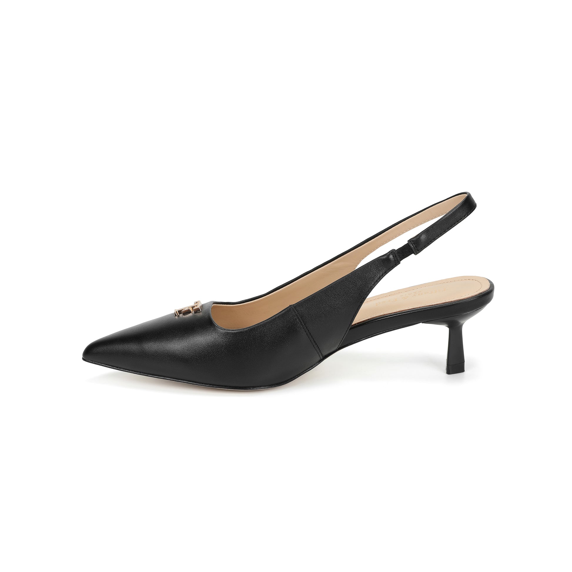 Black Leather Slingback Kitten Heels with TF Accent