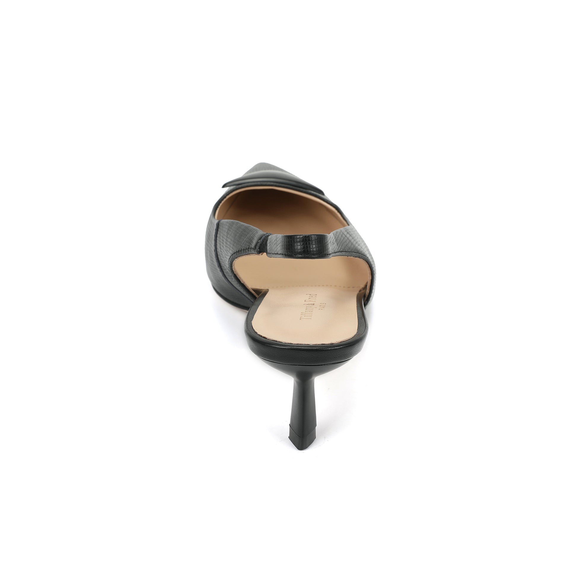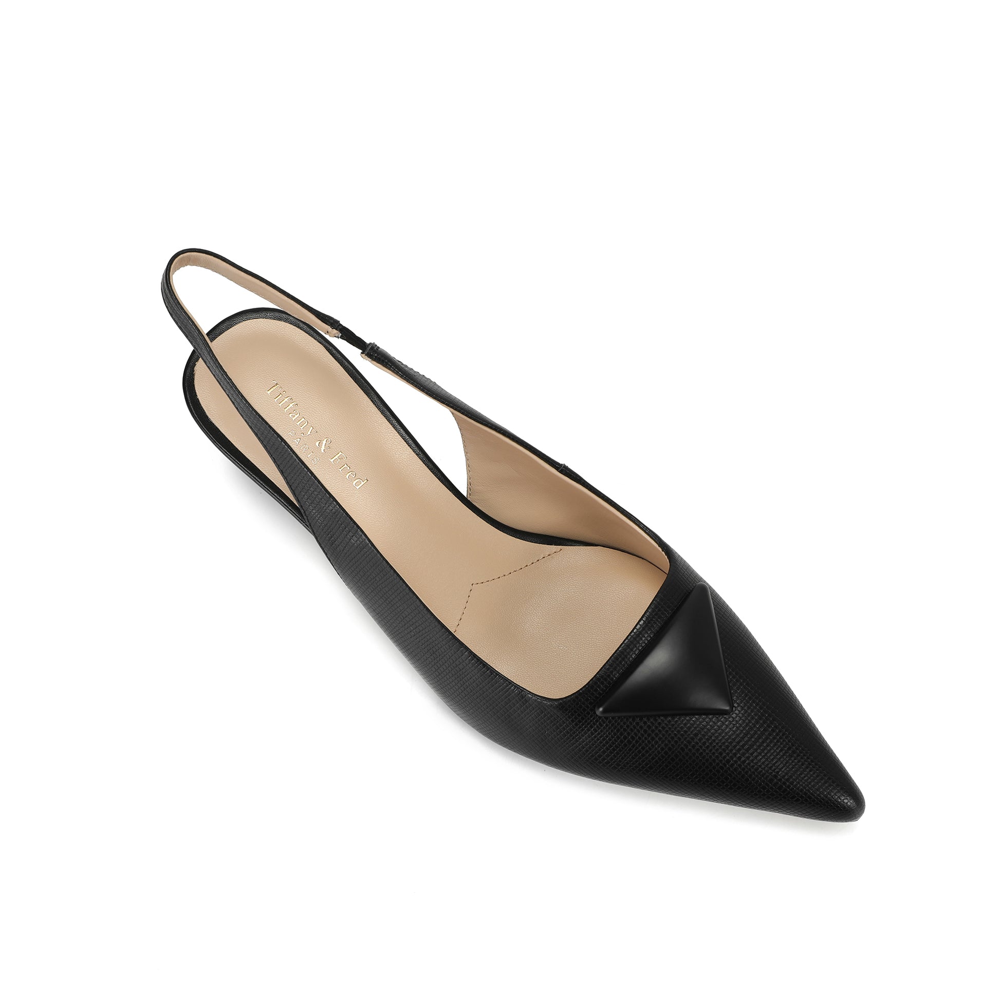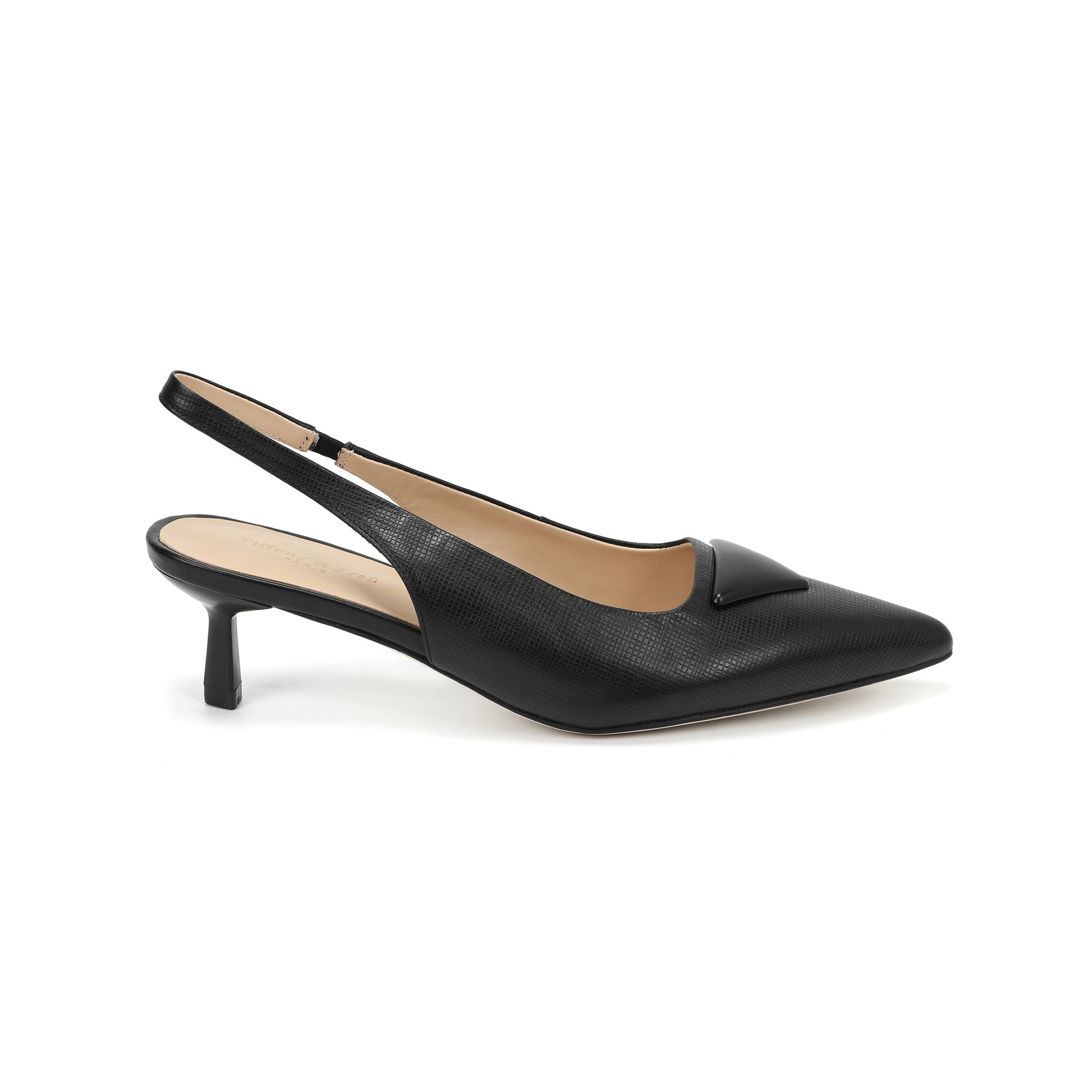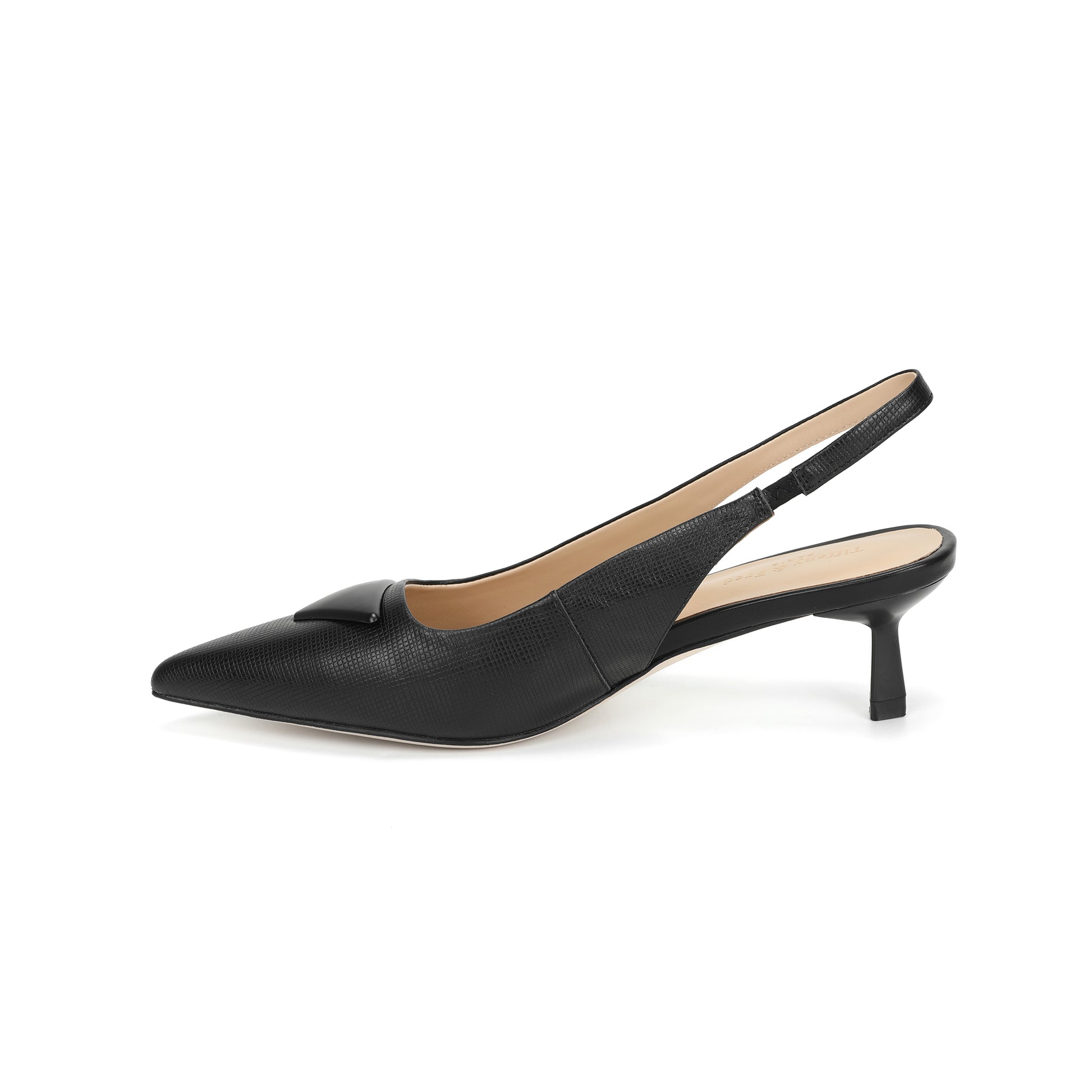 Black Leather Slingback Triangular Hardware Kitten Heels