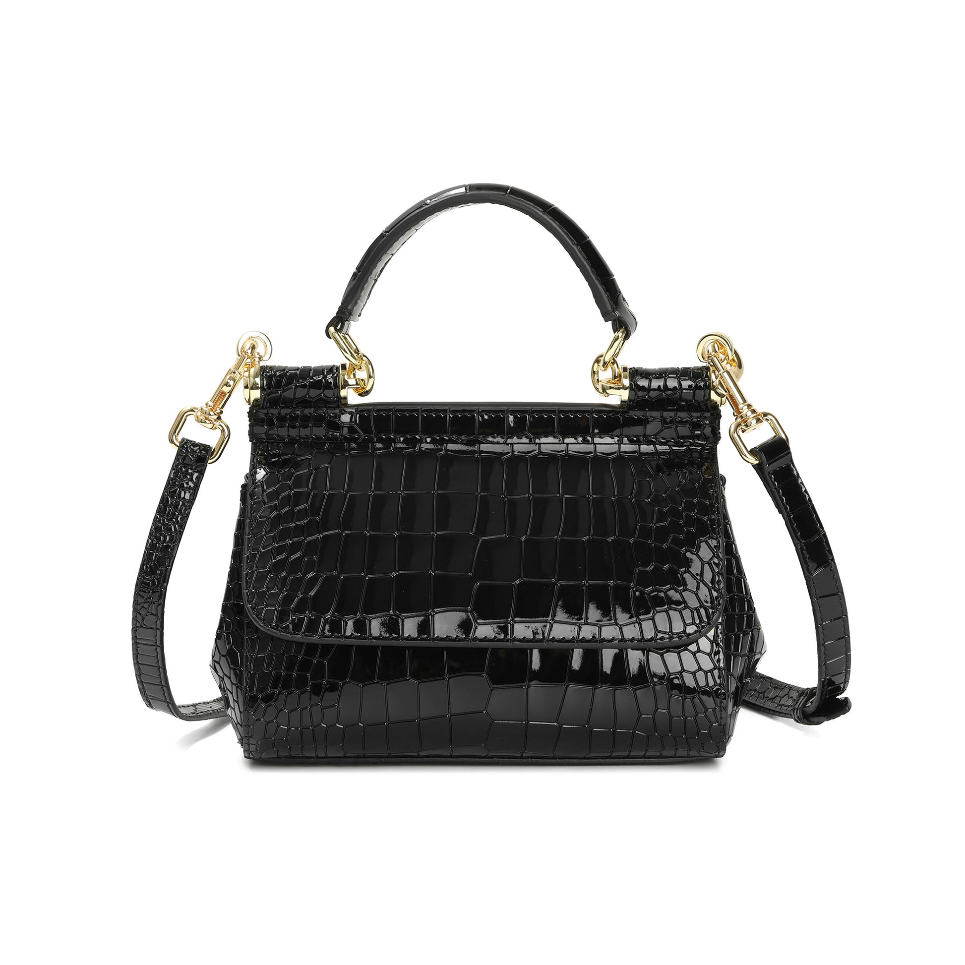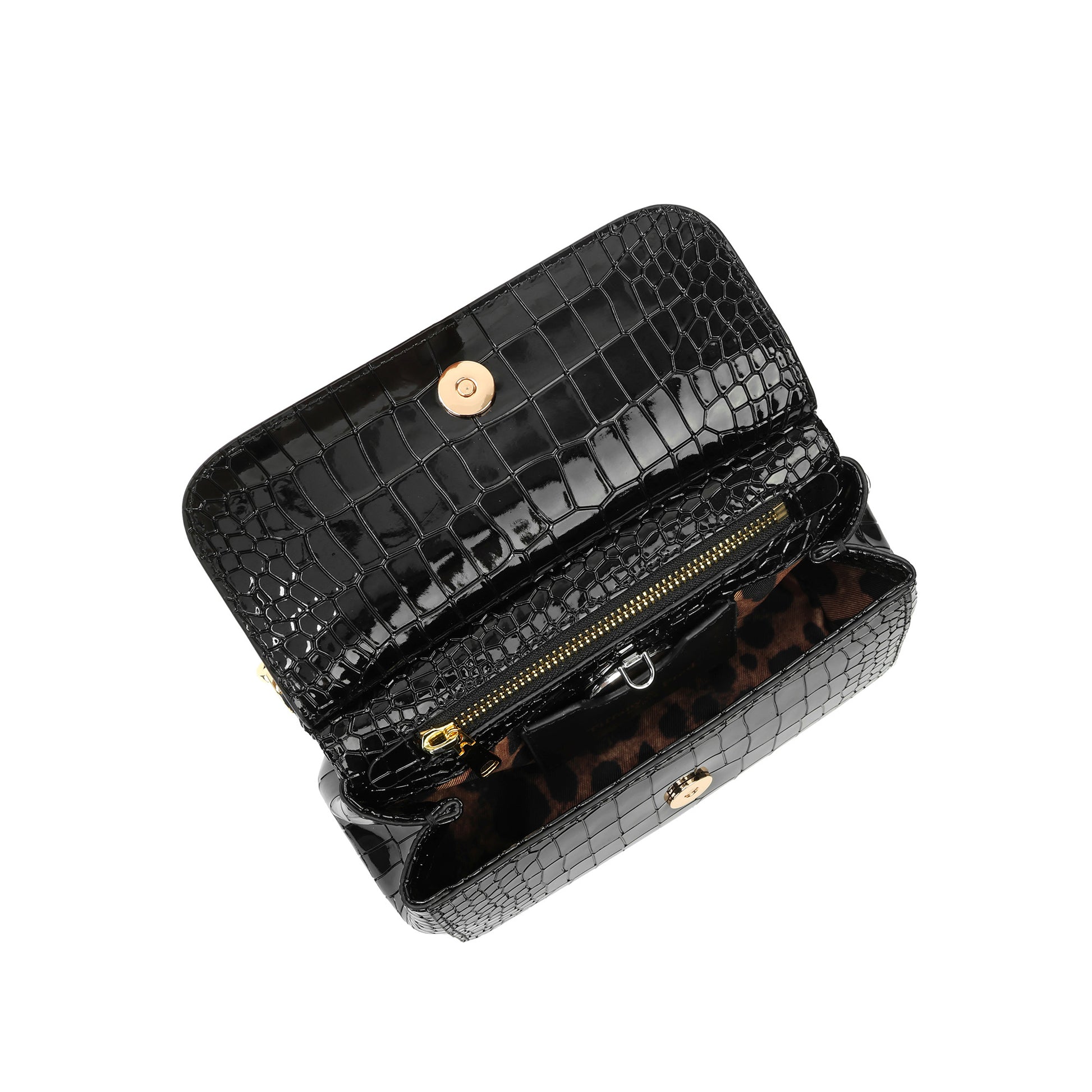 Make a bold statement with this croc-embossed leather mini satchel, a sleek piece that combines structured elegance with everyday versatility. Featuring a glossy crocodile-embossed finish, this bag offers a modern, fashion-forward look. It comes with a sturdy top handle and an adjustable, detachable crossbody strap for versatile styling. The magnetic flap closure opens to a well-organized interior with multiple compartments and a secure zip pocket, making it both chic and practical. Finished with gold-tone hardware and a leopard-print lining, it’s the perfect balance of glamour and utility.