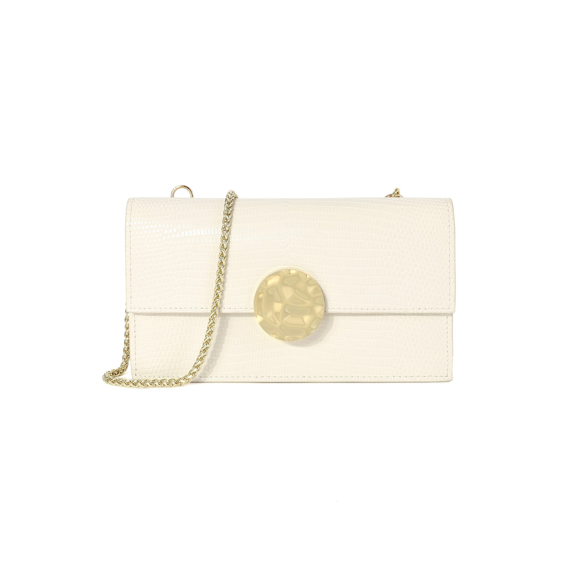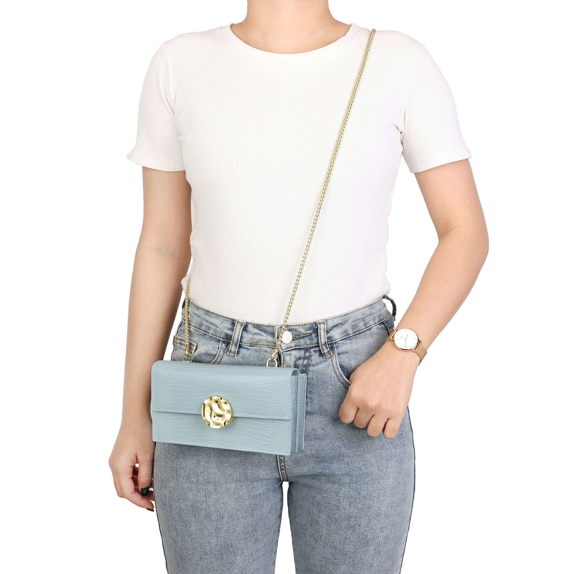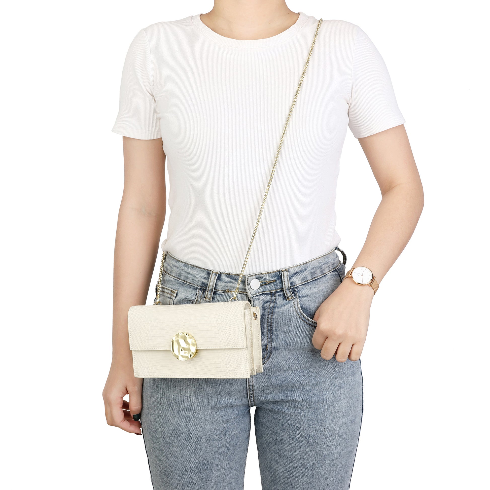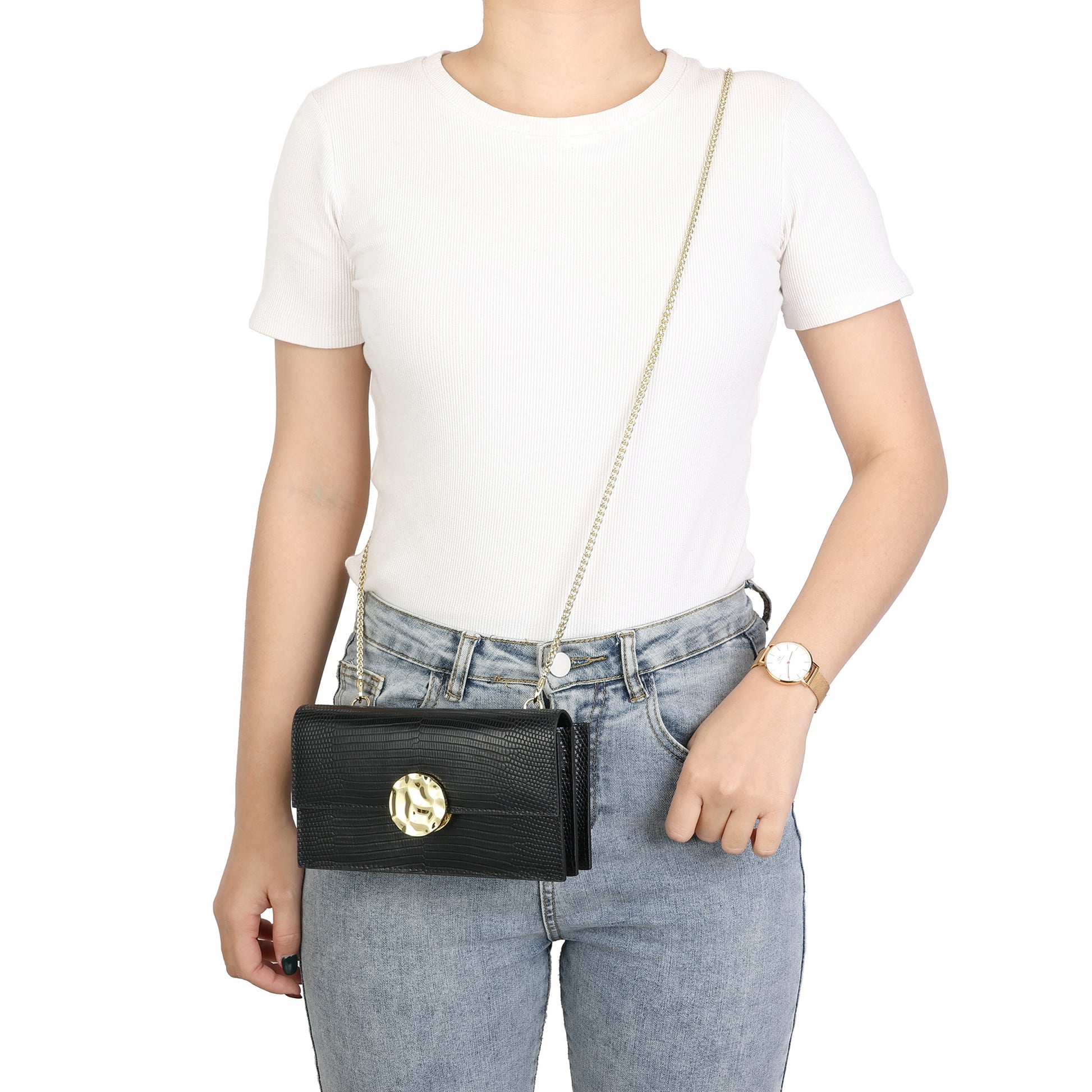 A sophisticated croc-embossed leather shoulder bag that effortlessly combines timeless design with modern elegance. Featuring a gold-tone chain strap and a bold circular hardware clasp, this bag is perfect for day-to-night versatility. With its structured silhouette and multiple compartments, it is both practical and stylish.