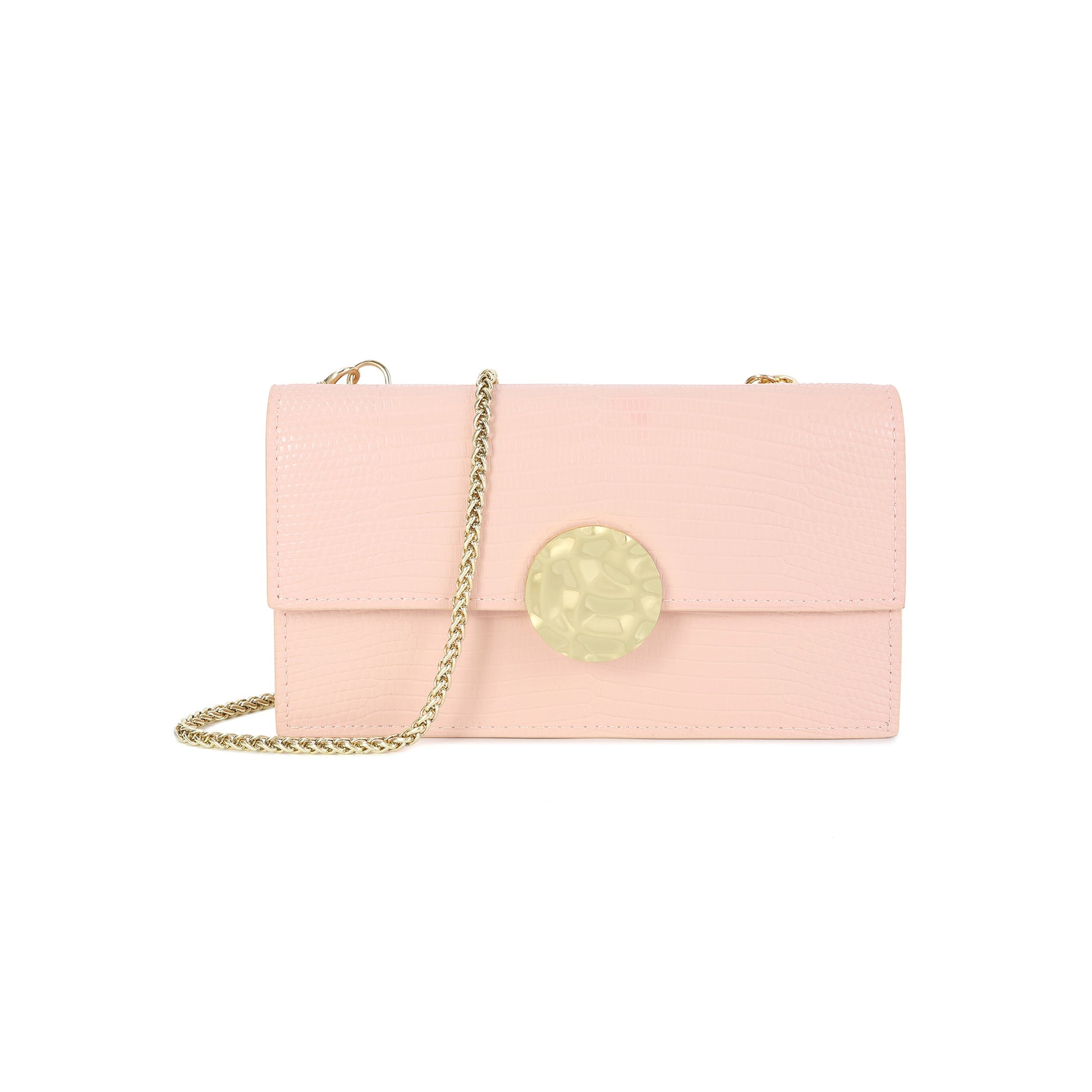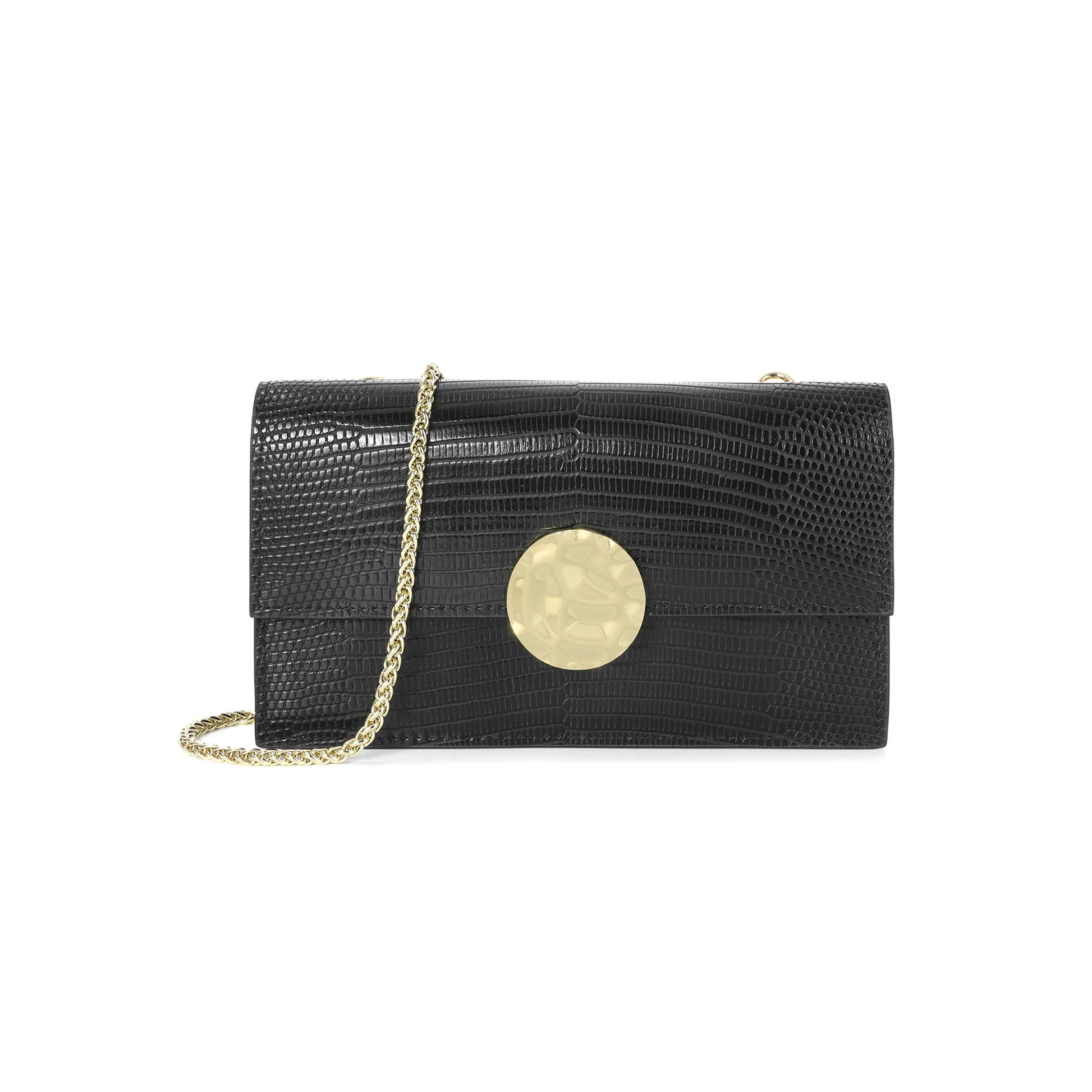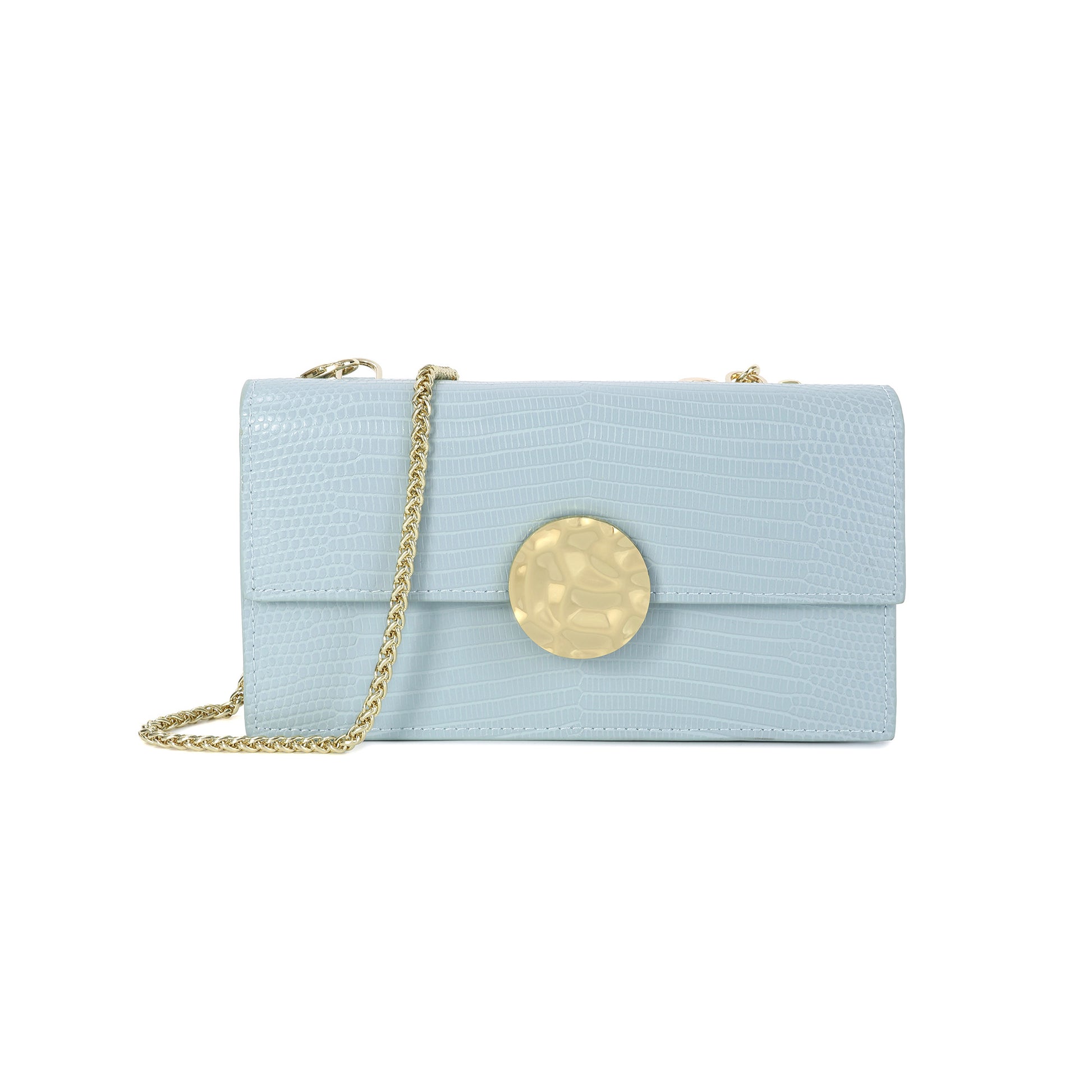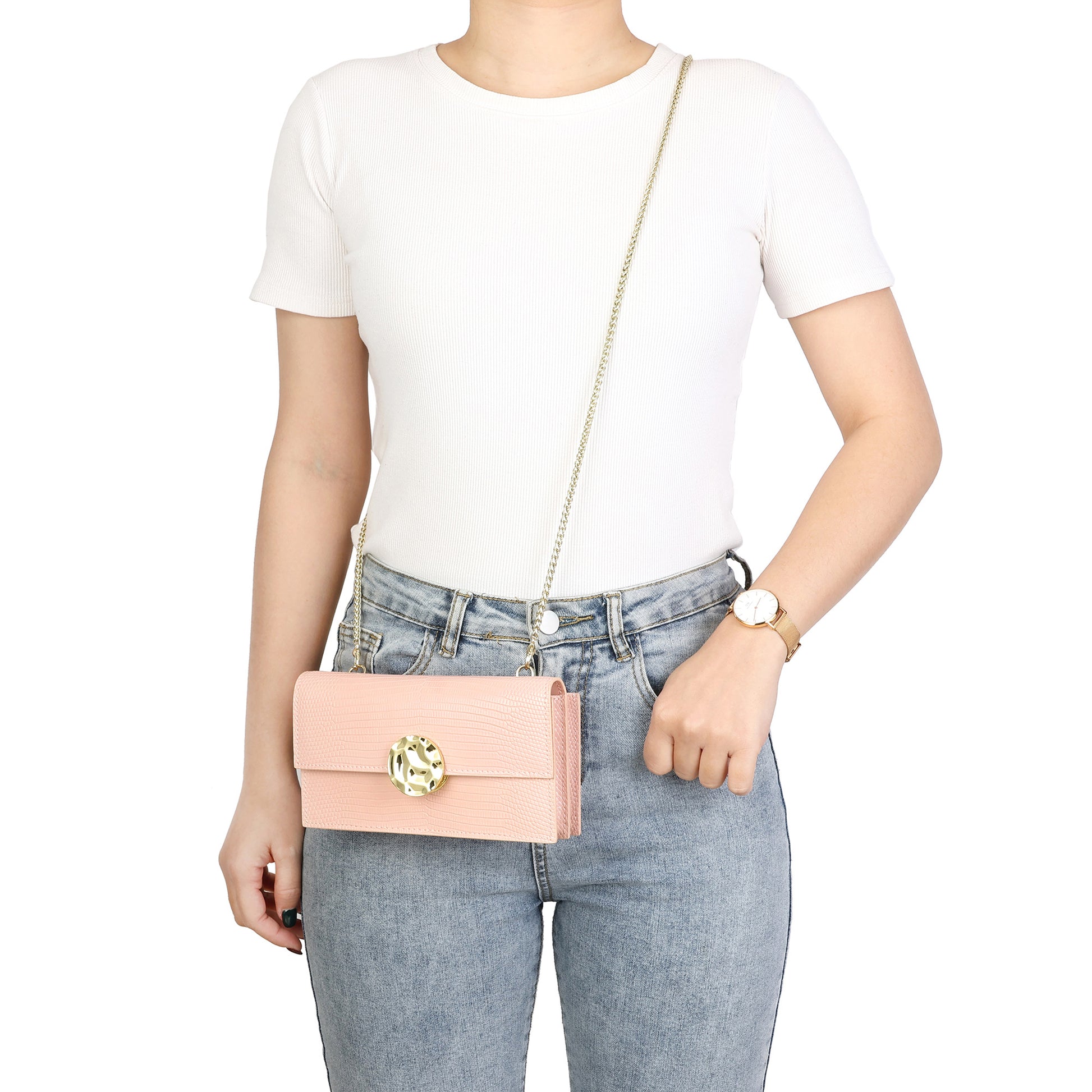 A sophisticated croc-embossed leather shoulder bag that effortlessly combines timeless design with modern elegance. Featuring a gold-tone chain strap and a bold circular hardware clasp, this bag is perfect for day-to-night versatility. With its structured silhouette and multiple compartments, it is both practical and stylish.