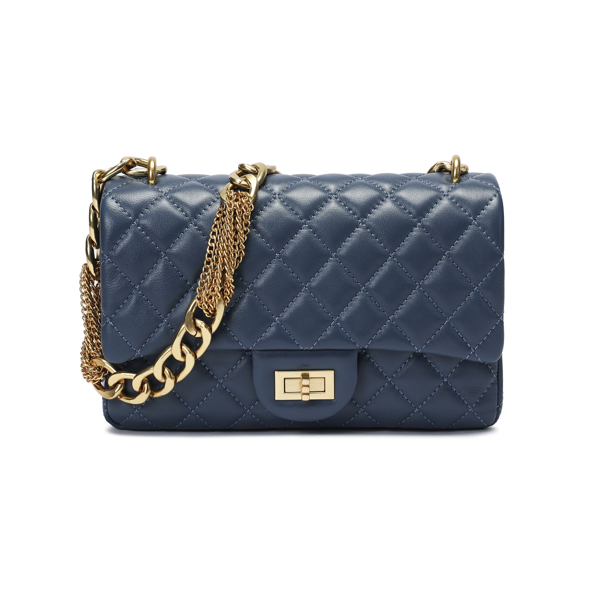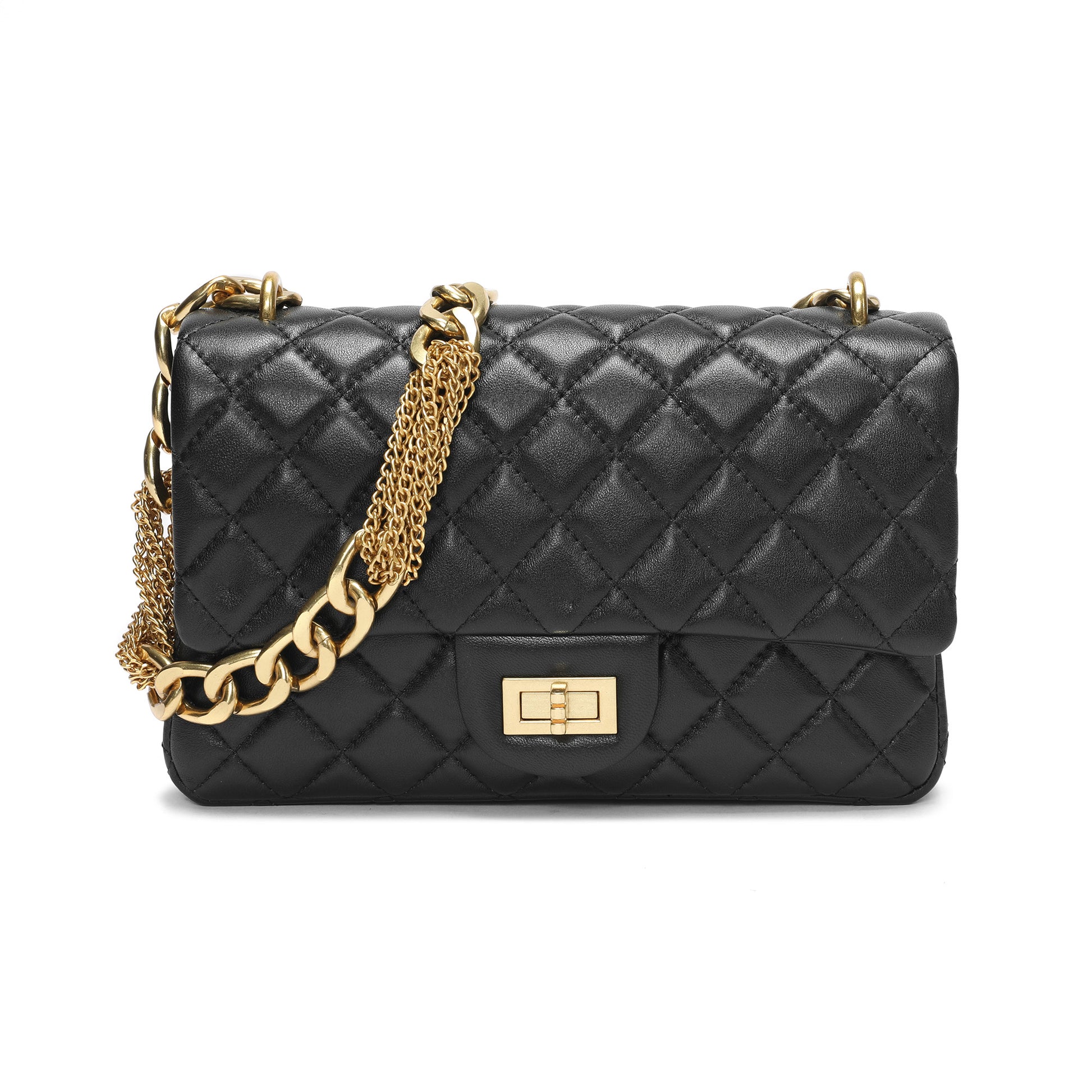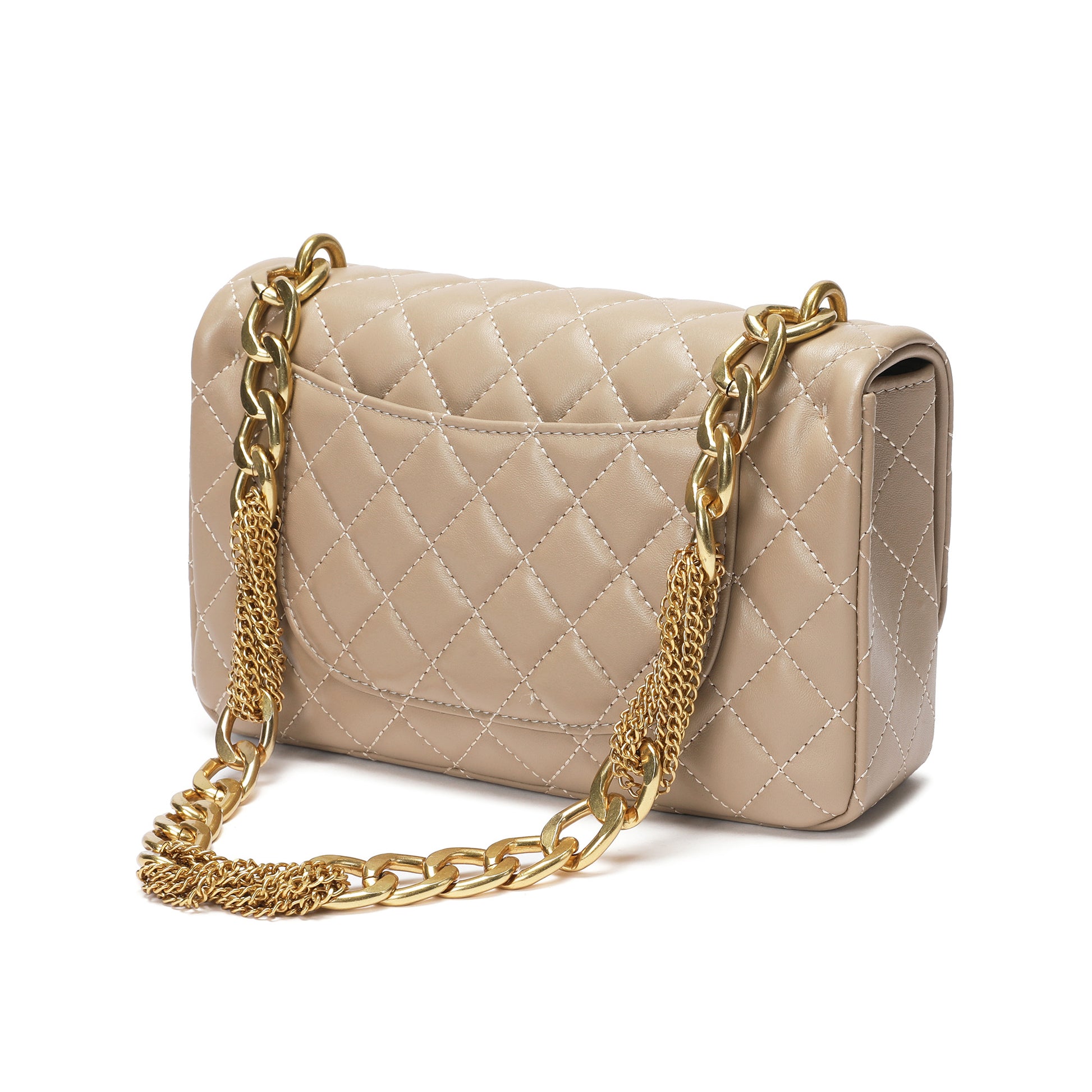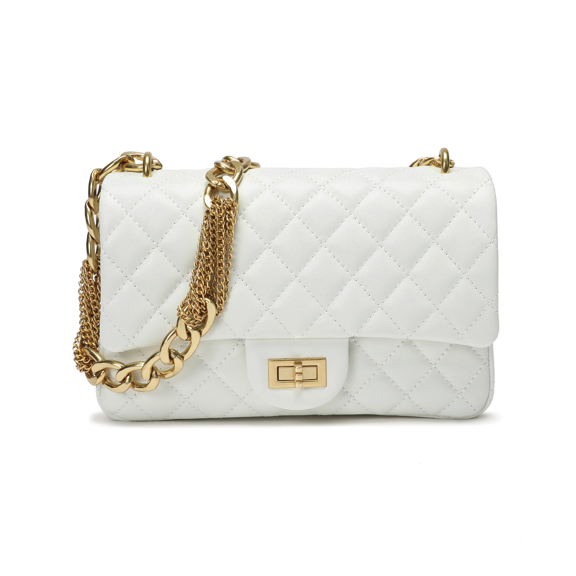 This luxurious quilted shoulder bag is the perfect combination of elegance and functionality. Made from premium leather, the bag features a timeless quilted design, enhanced by its gold-tone turn-lock closure and a stylish chain strap. The chain strap is designed with dual textures—sleek metal and layered chain—to add a touch of sophistication. Its structured interior is spacious enough to hold your essentials, while a secure inner zip pocket keeps smaller valuables safe.