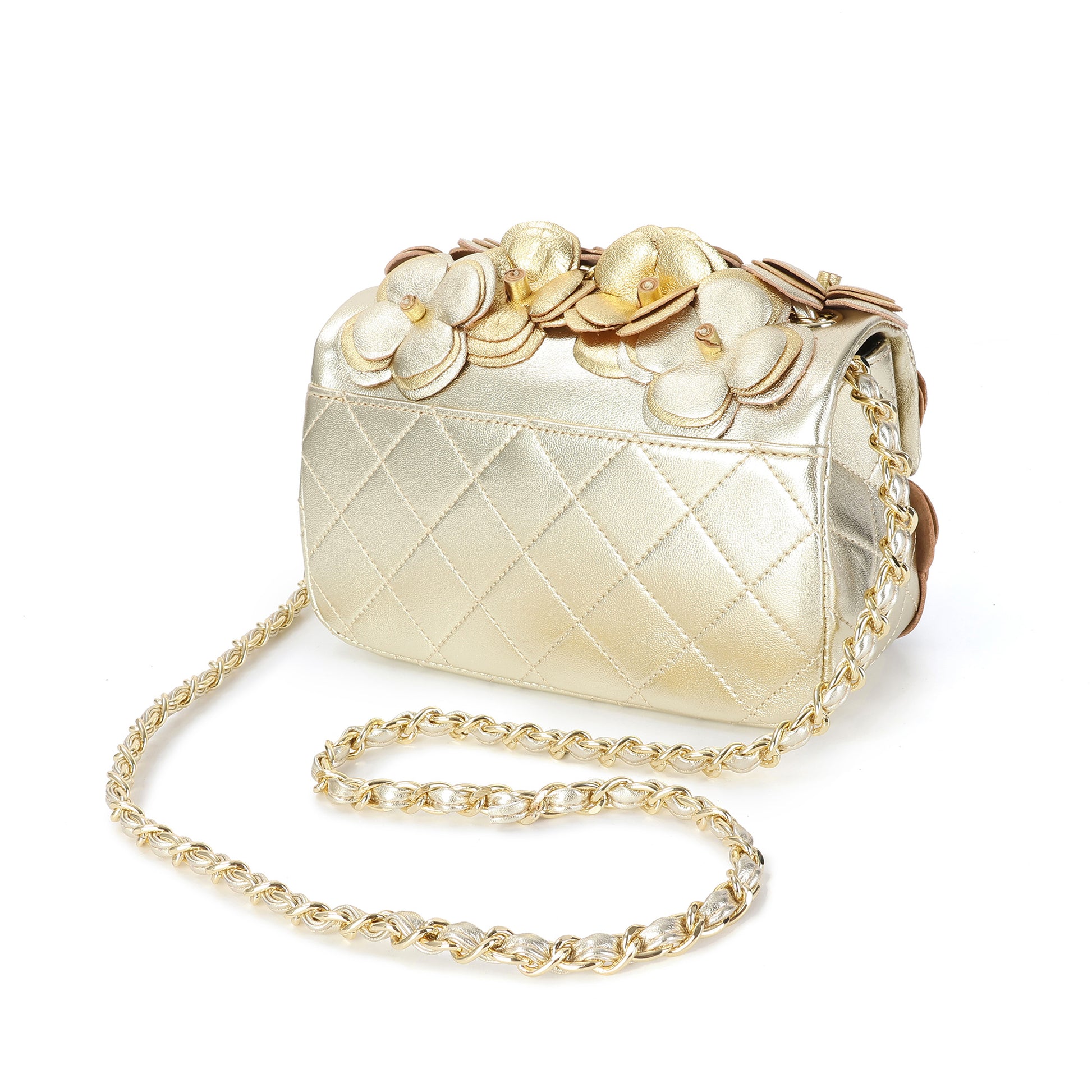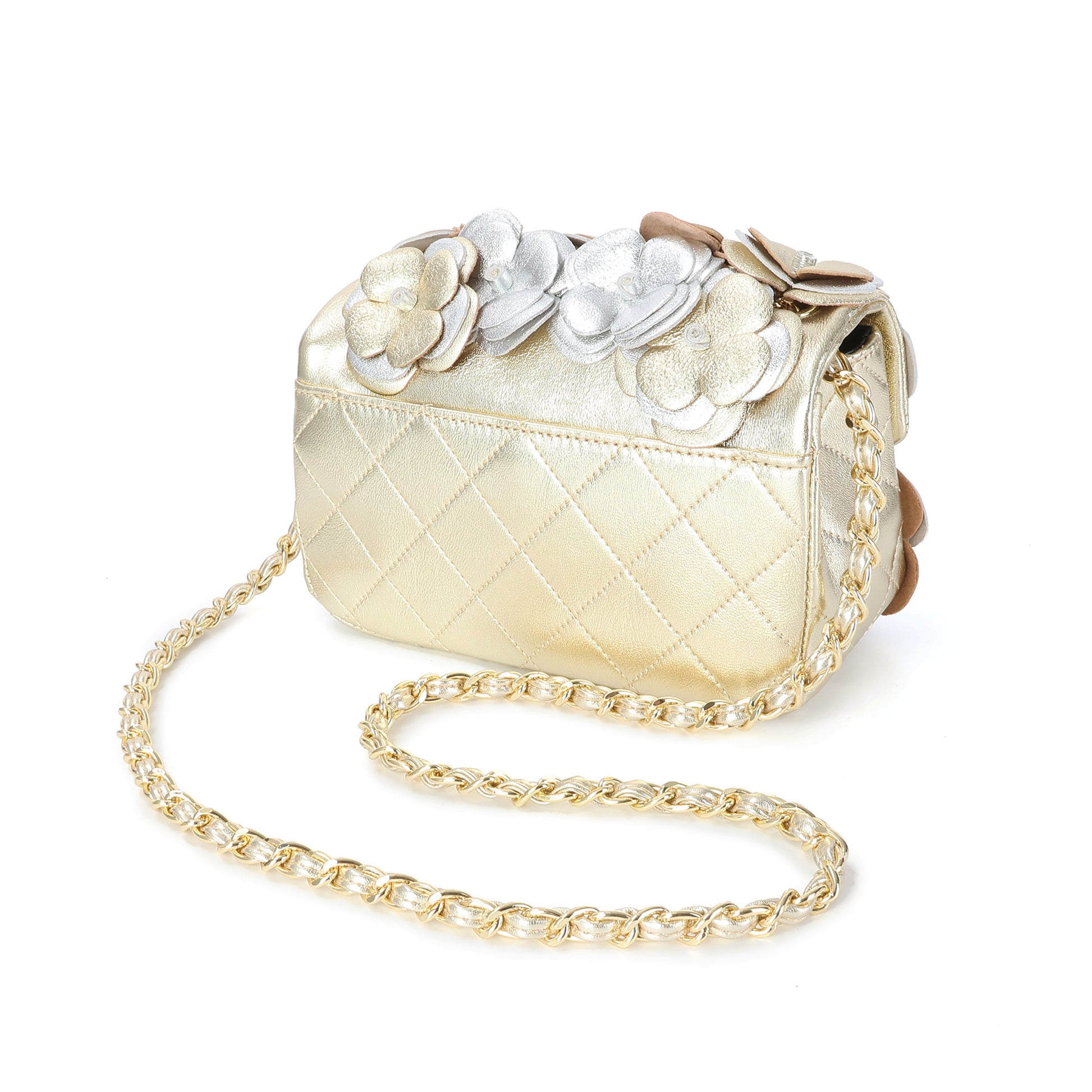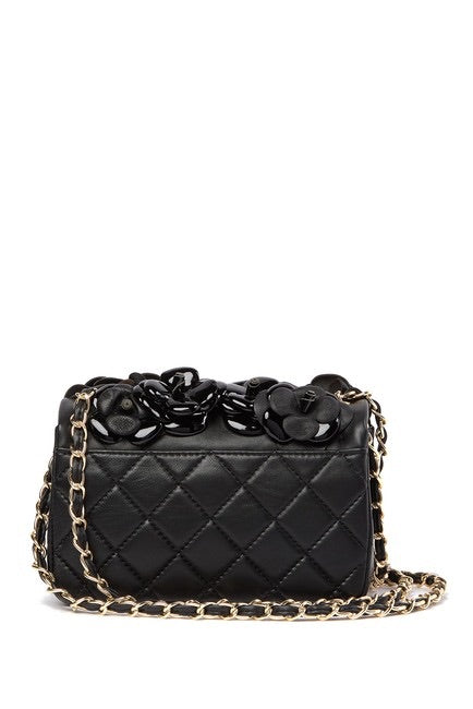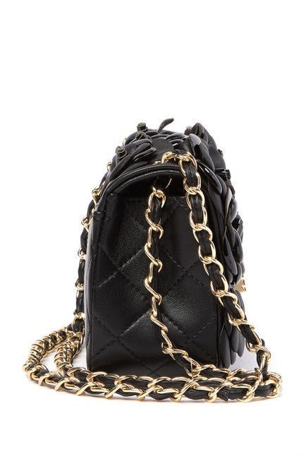 Floral appliques add pops of color to a quilted leather crossbody that is finished with a woven chain strap.