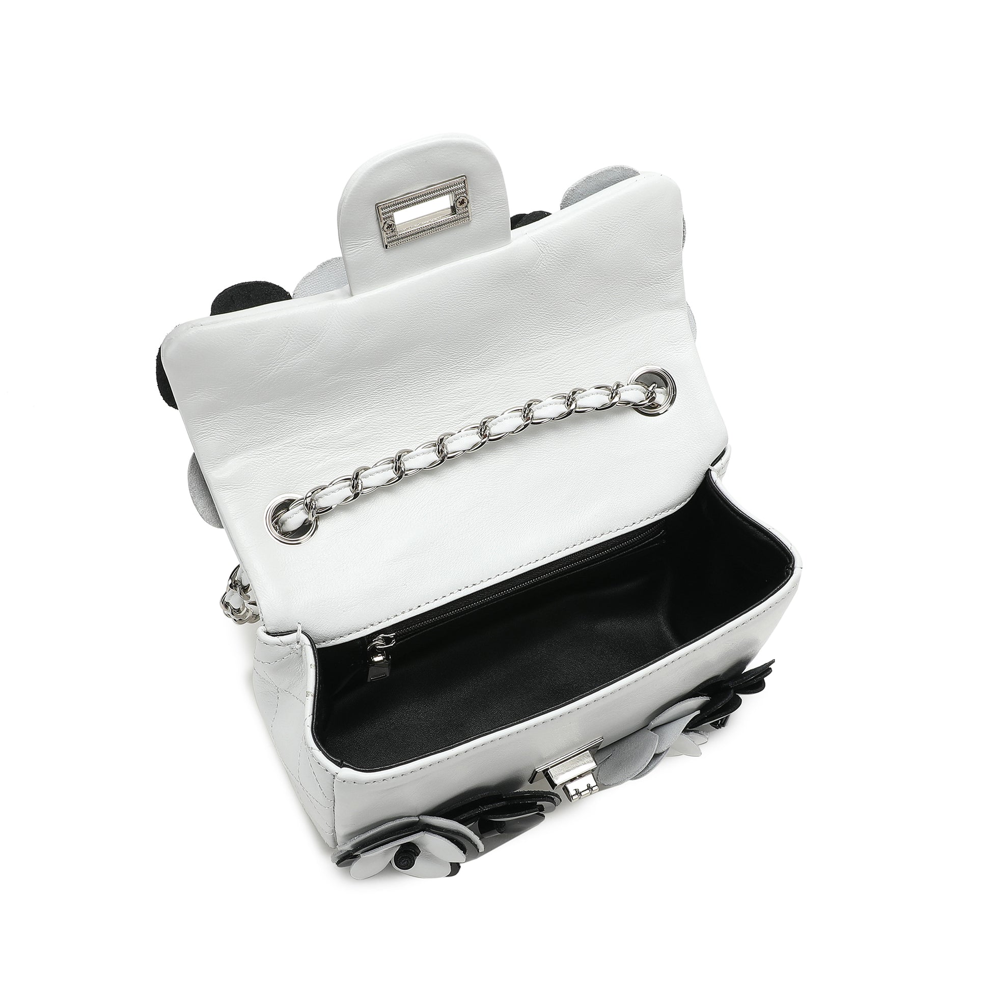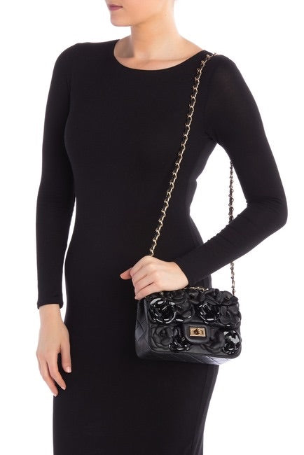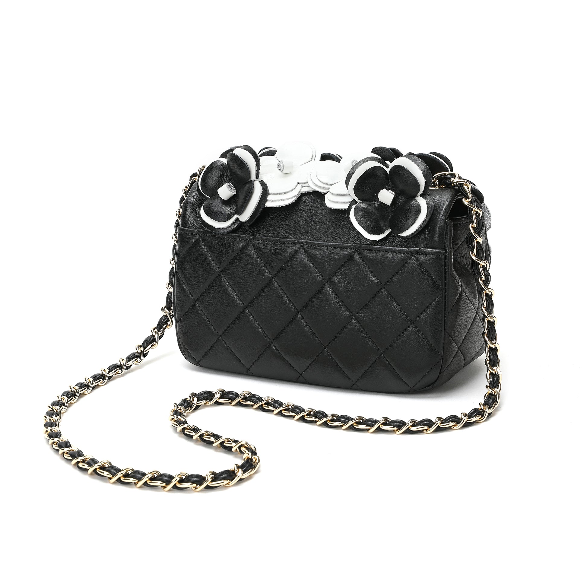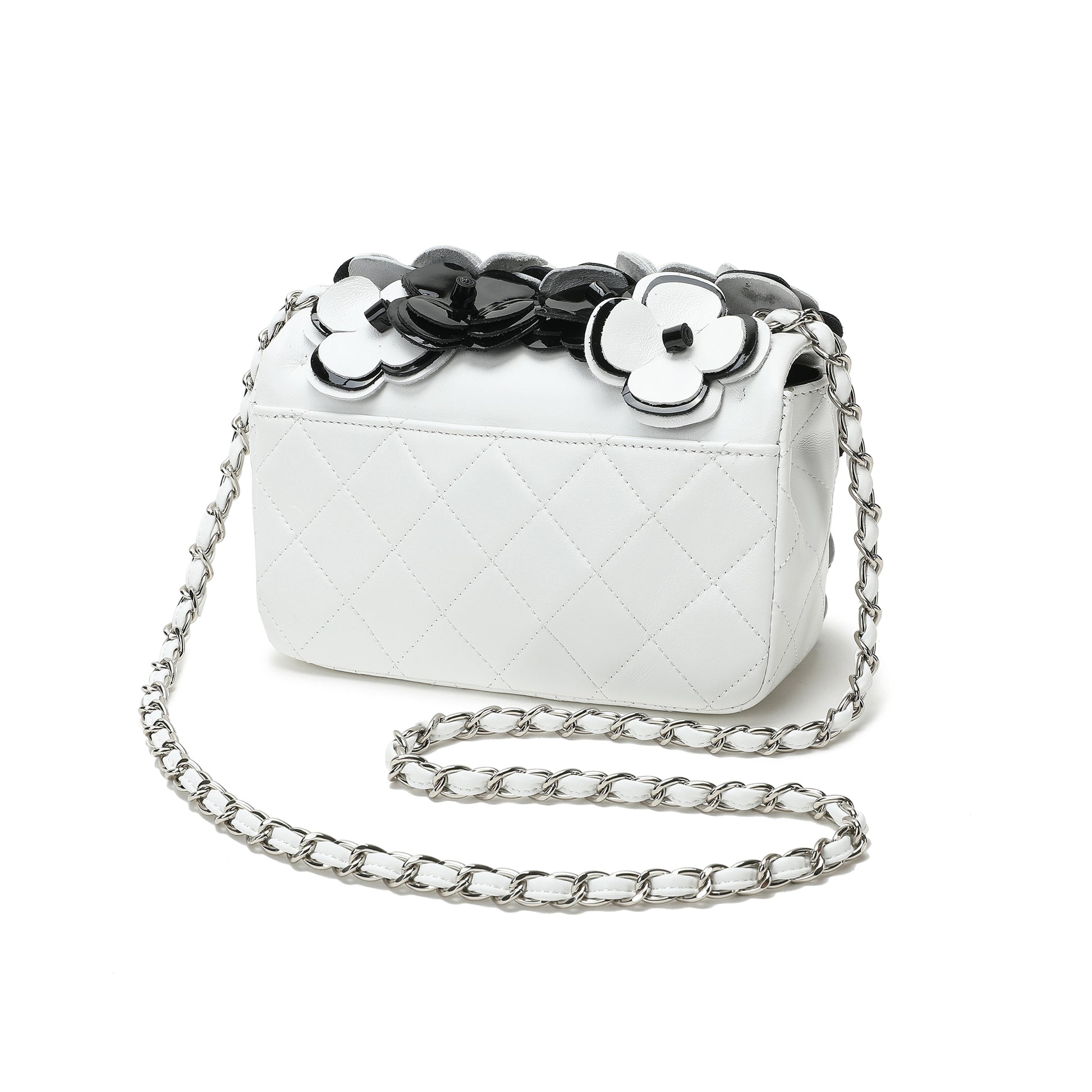 Floral appliques add pops of color to a quilted leather crossbody that is finished with a woven chain strap.