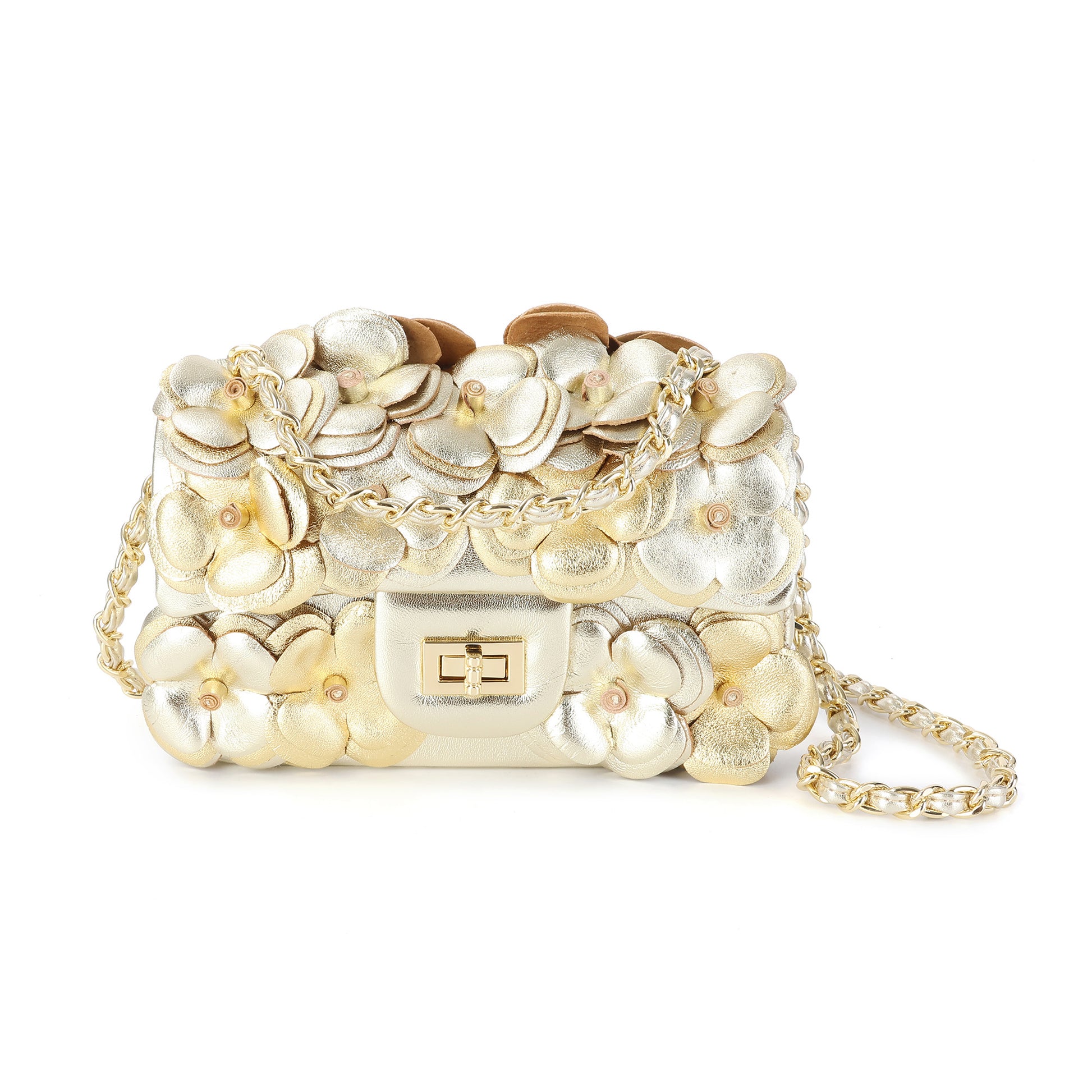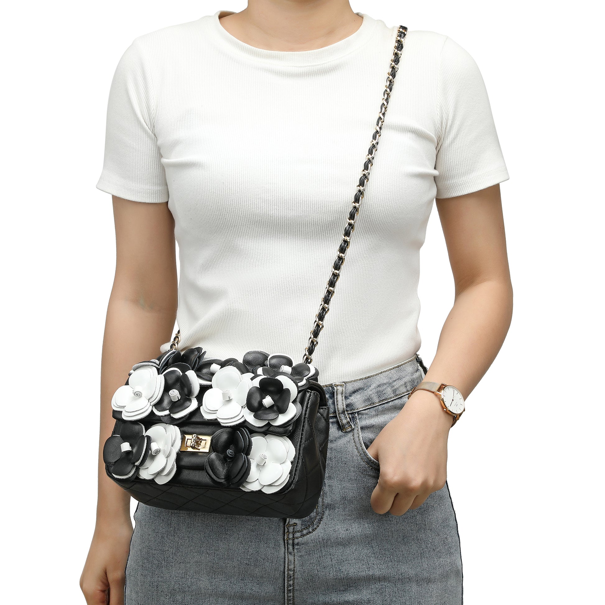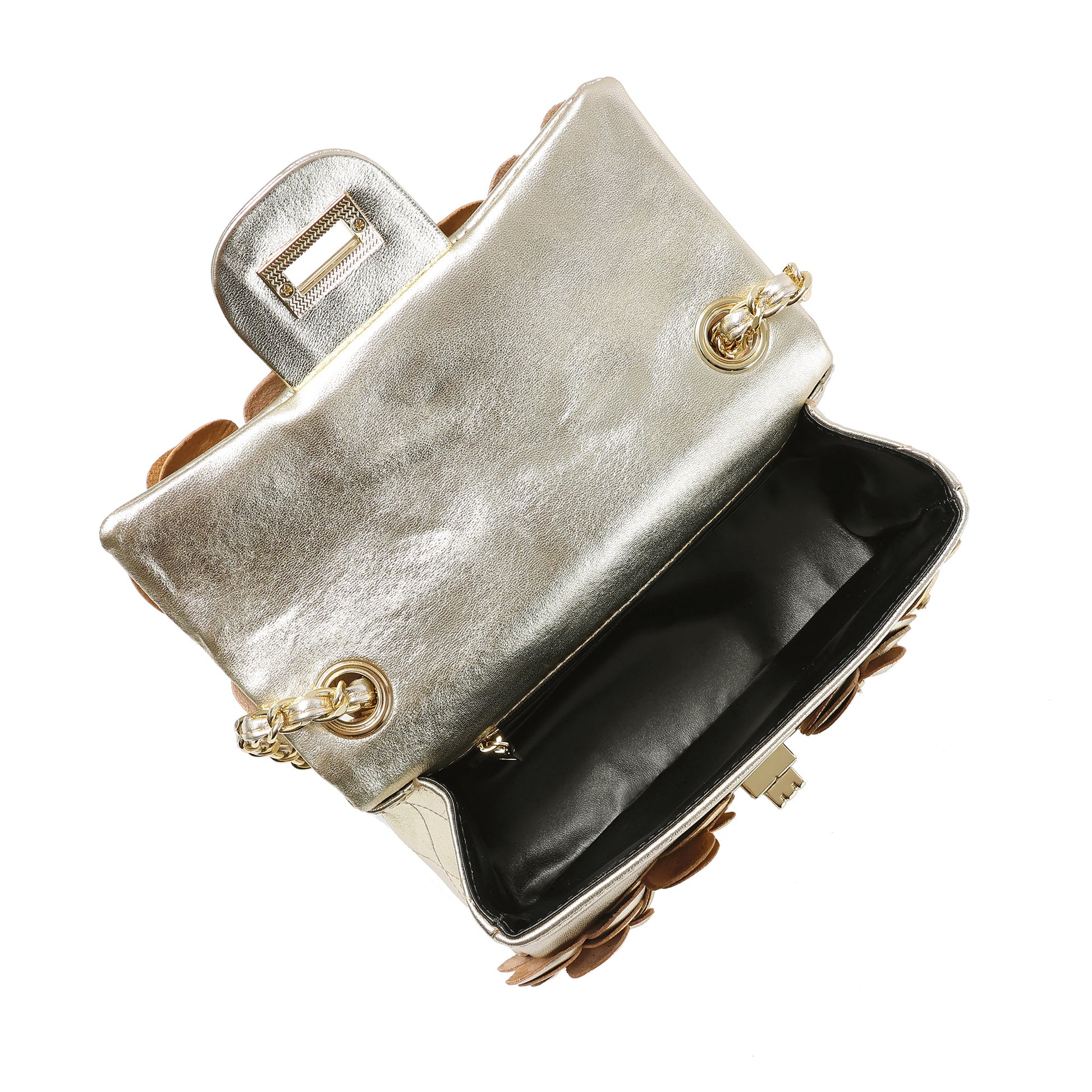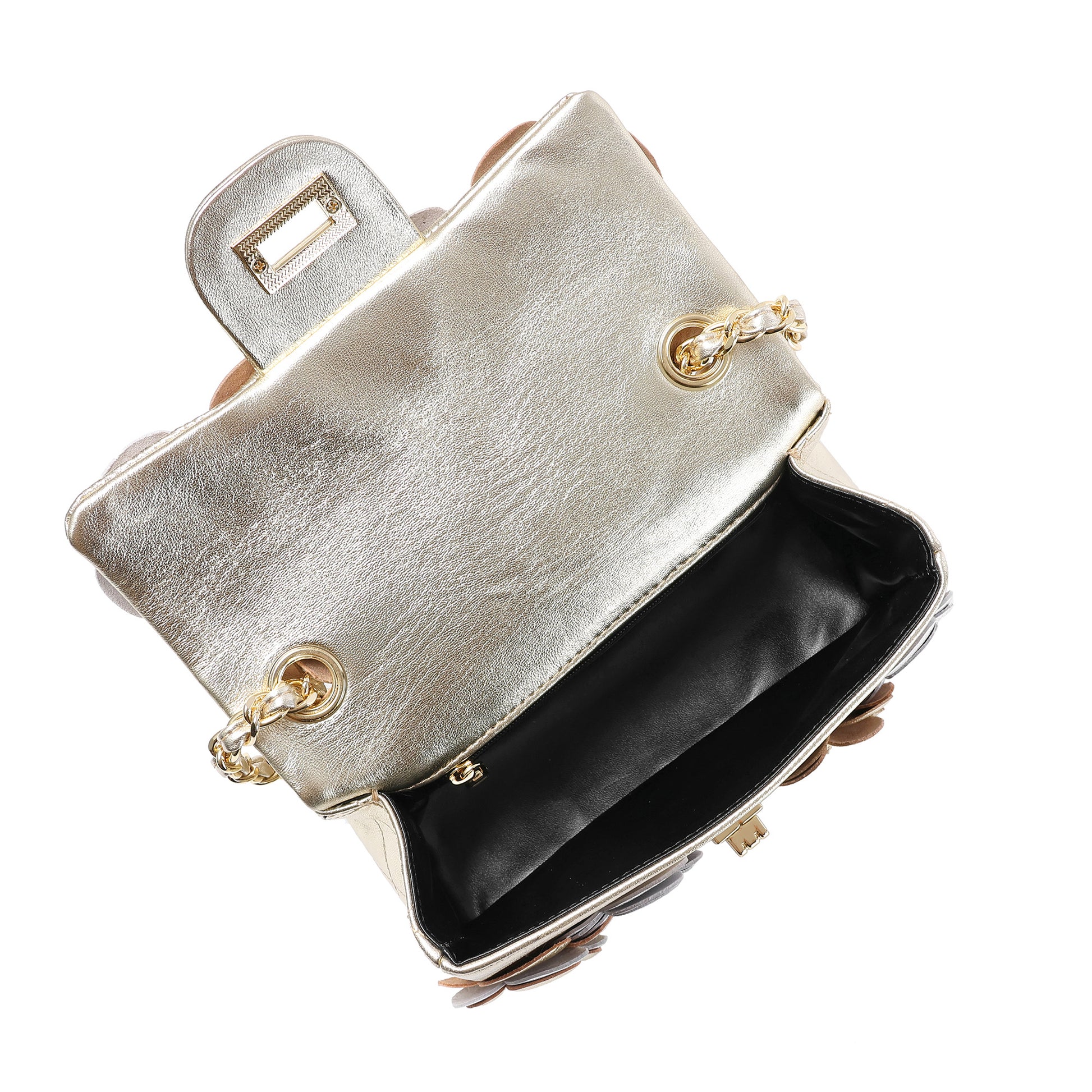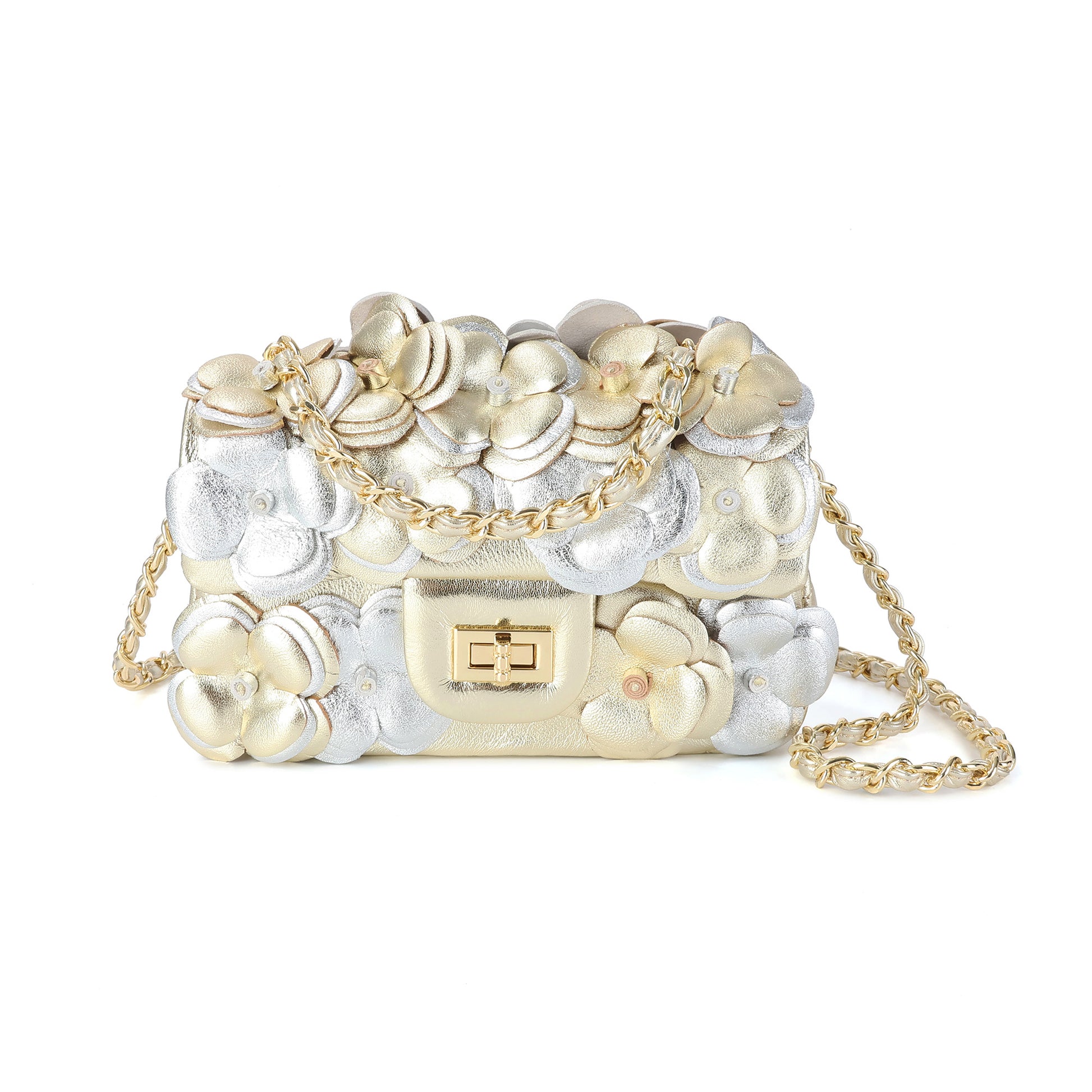 Details: Woven chain shoulder strap, Beautiful flower design, Foldover front flap with turn-lock closure