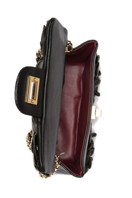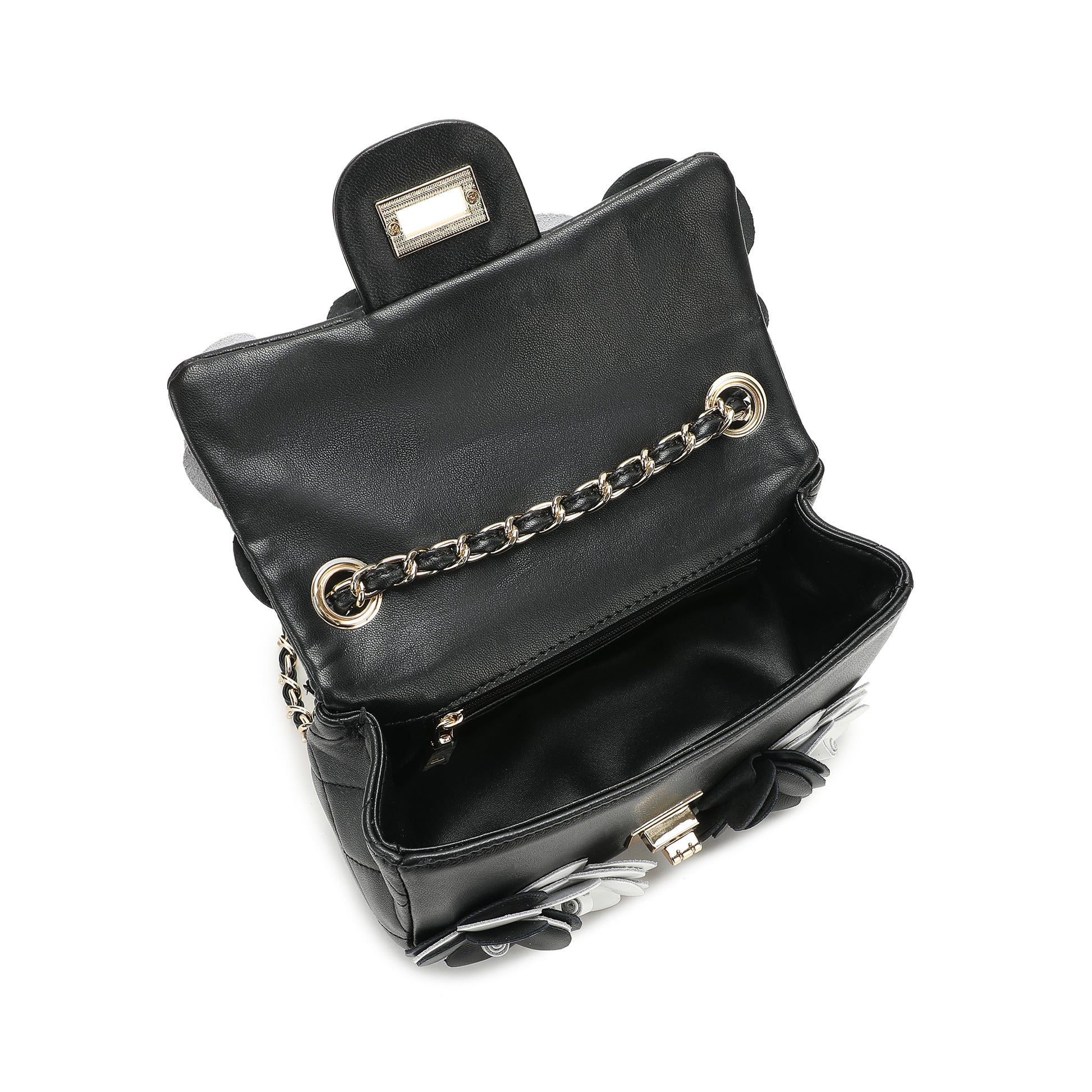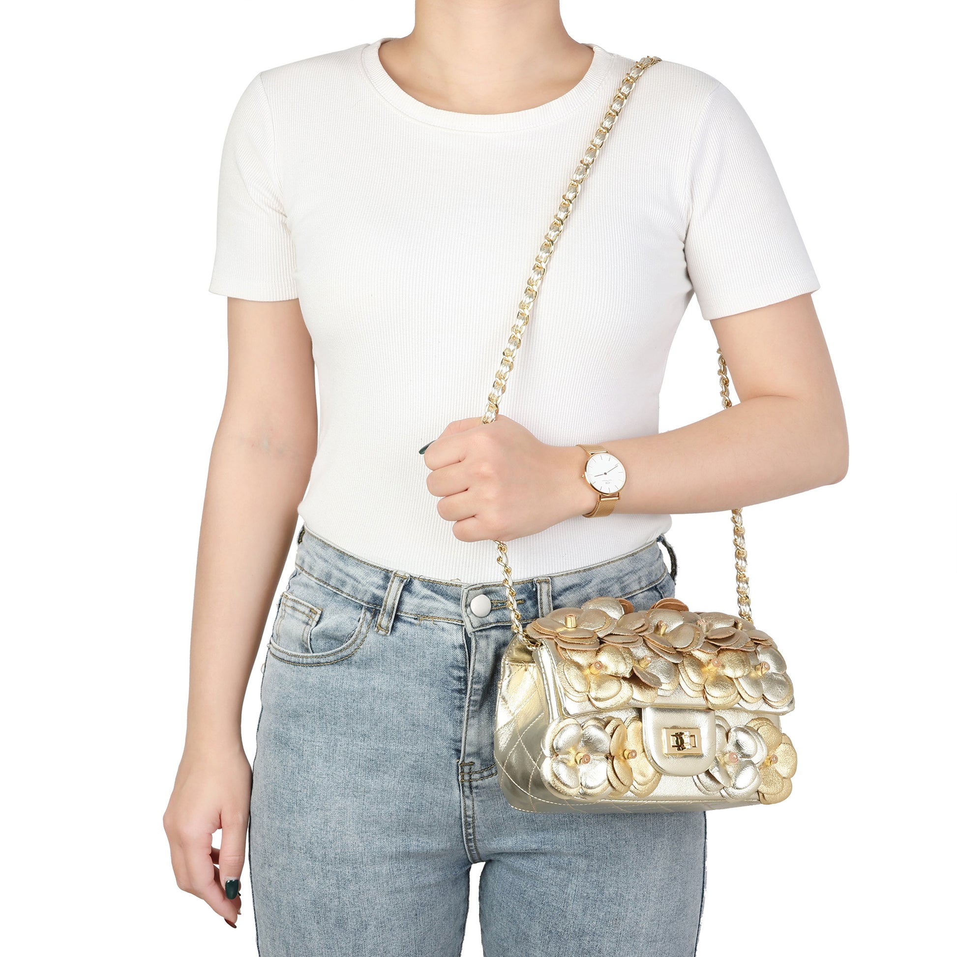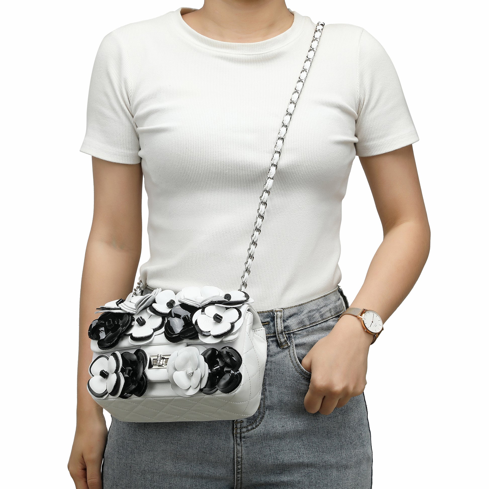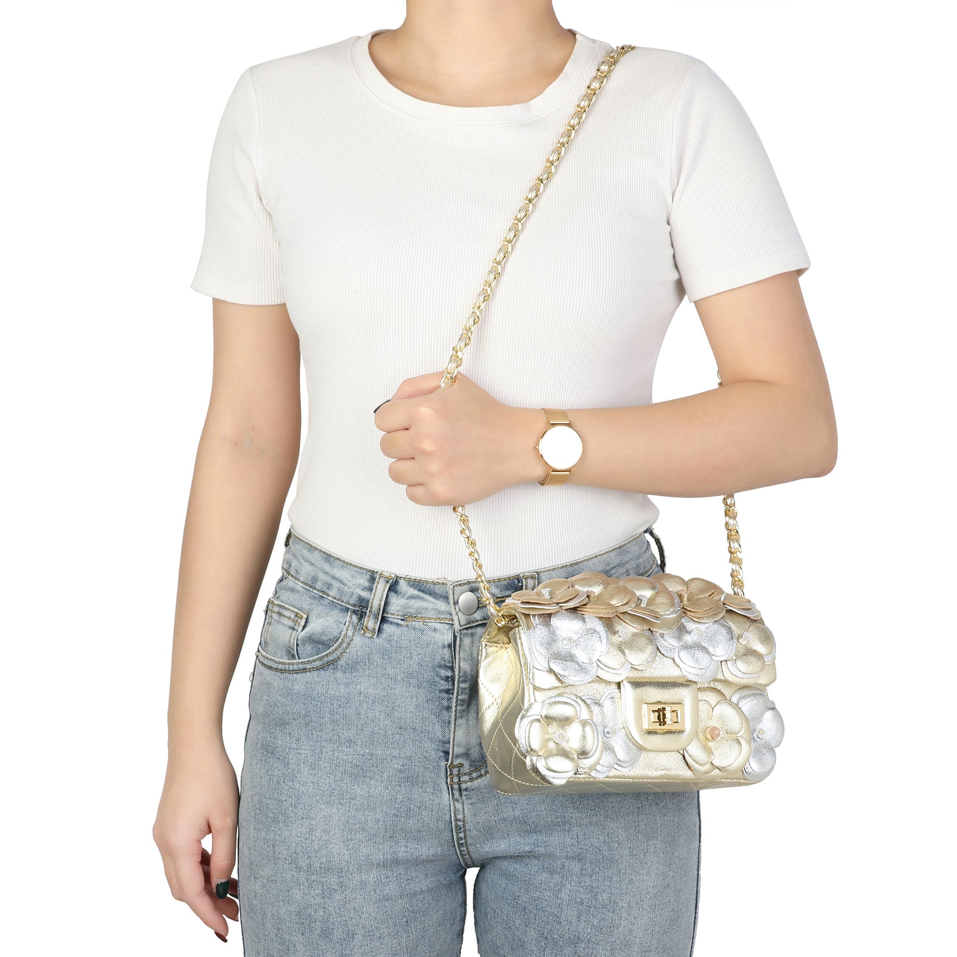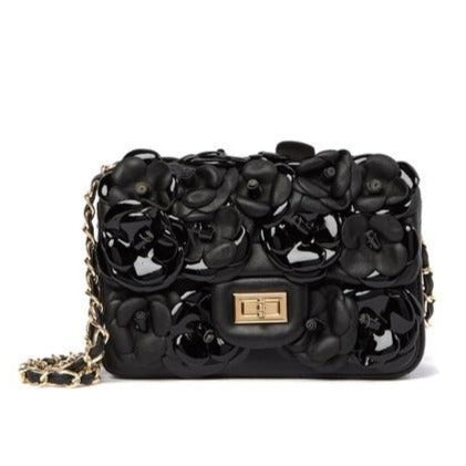 Details: Woven chain shoulder strap, Beautiful flower design, Foldover front flap with turn-lock closure