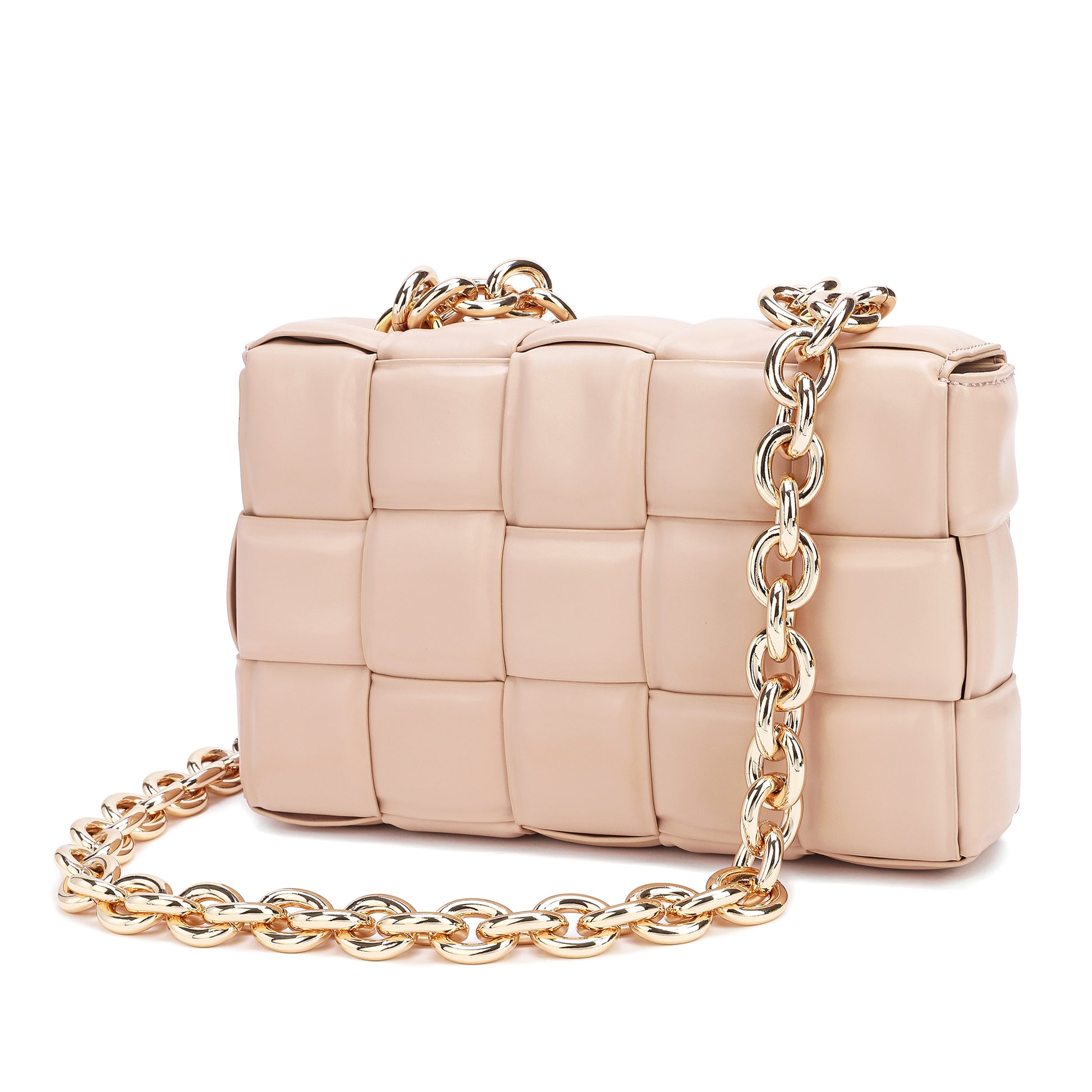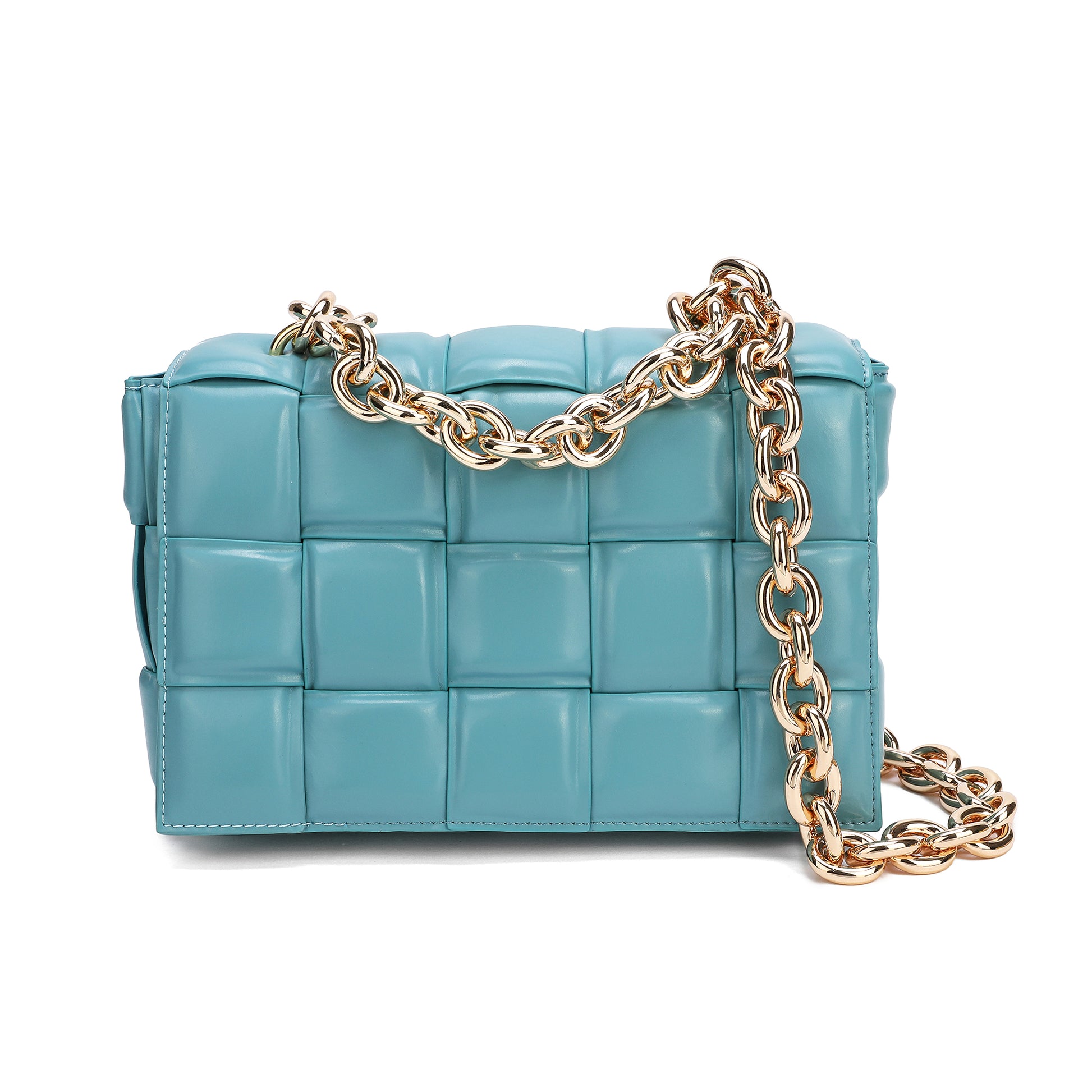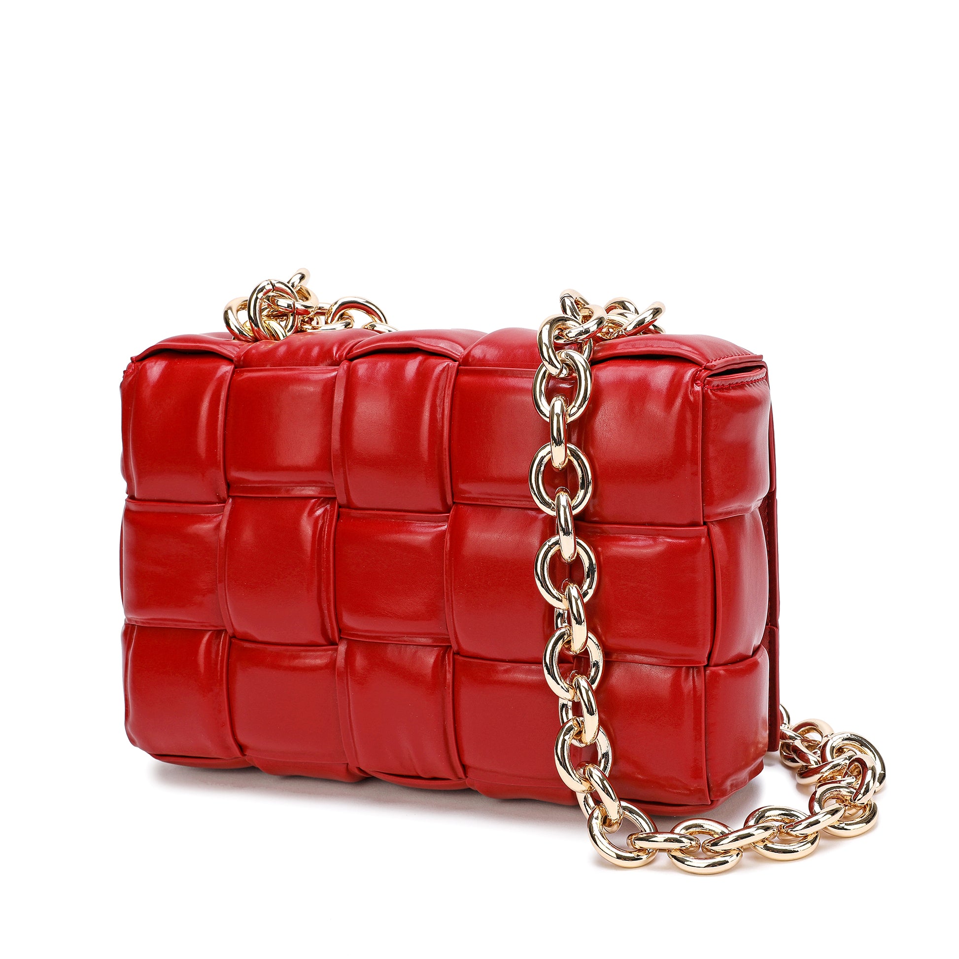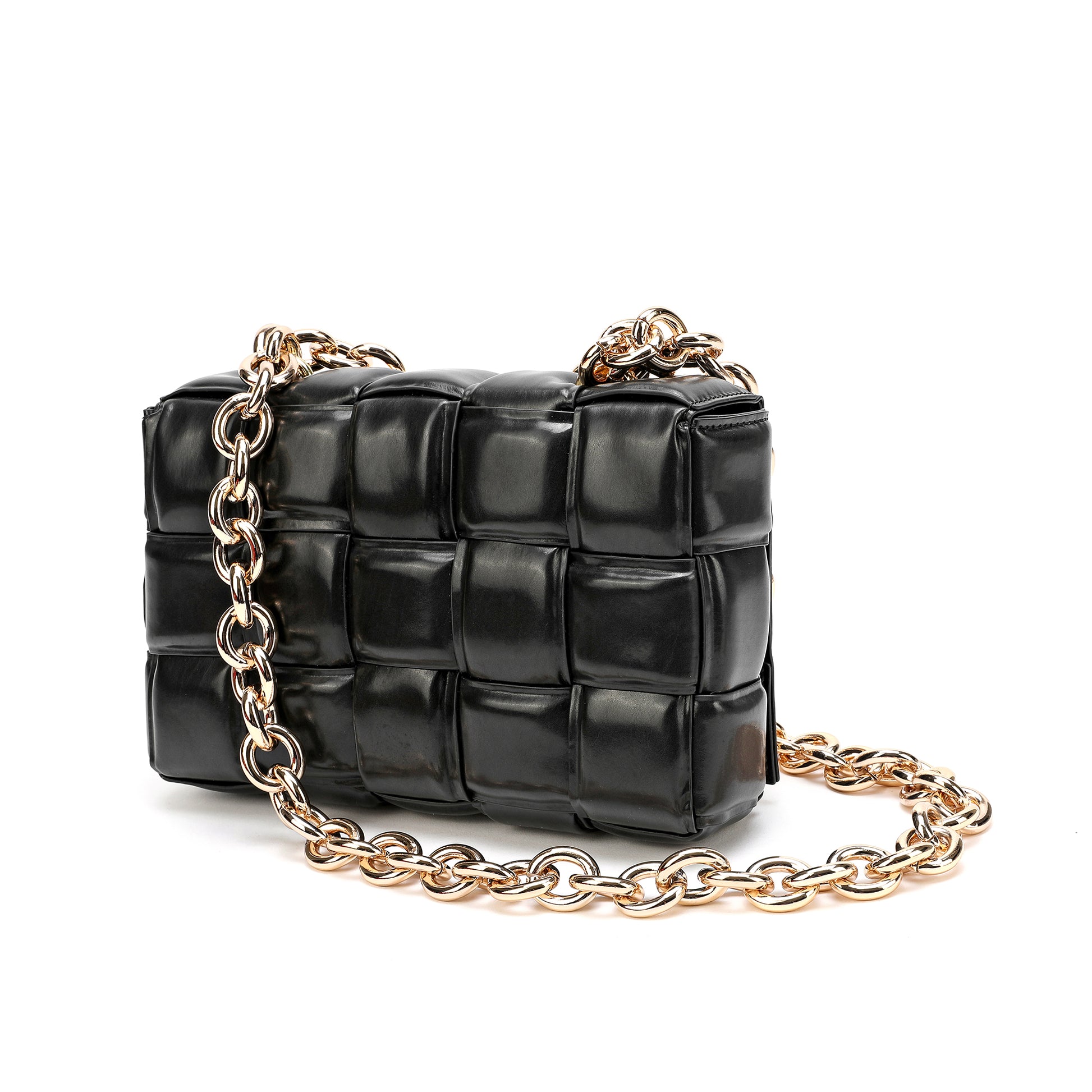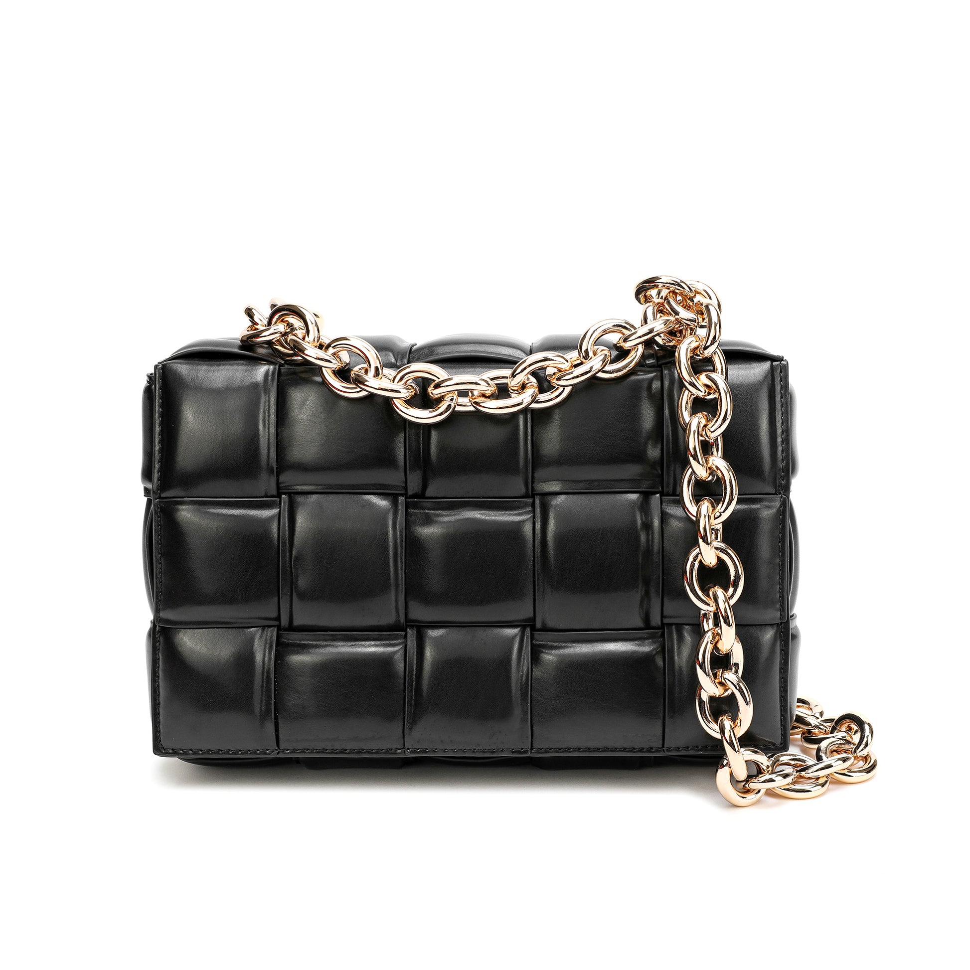 Exterior Features: Beautiful Puffer Smooth Leather Woven construction Shoulder Bag adorned with a golden-tone Chain