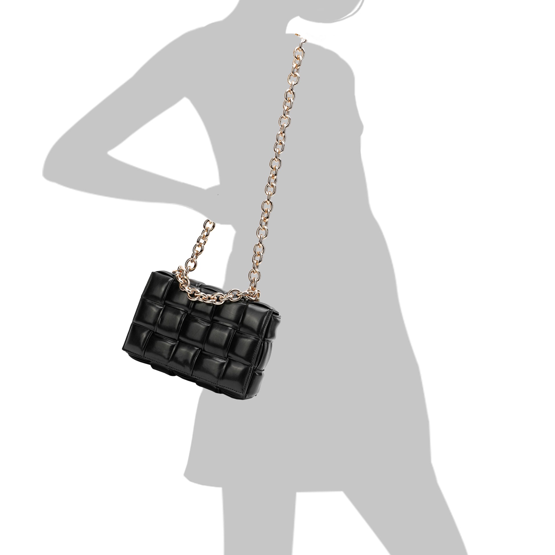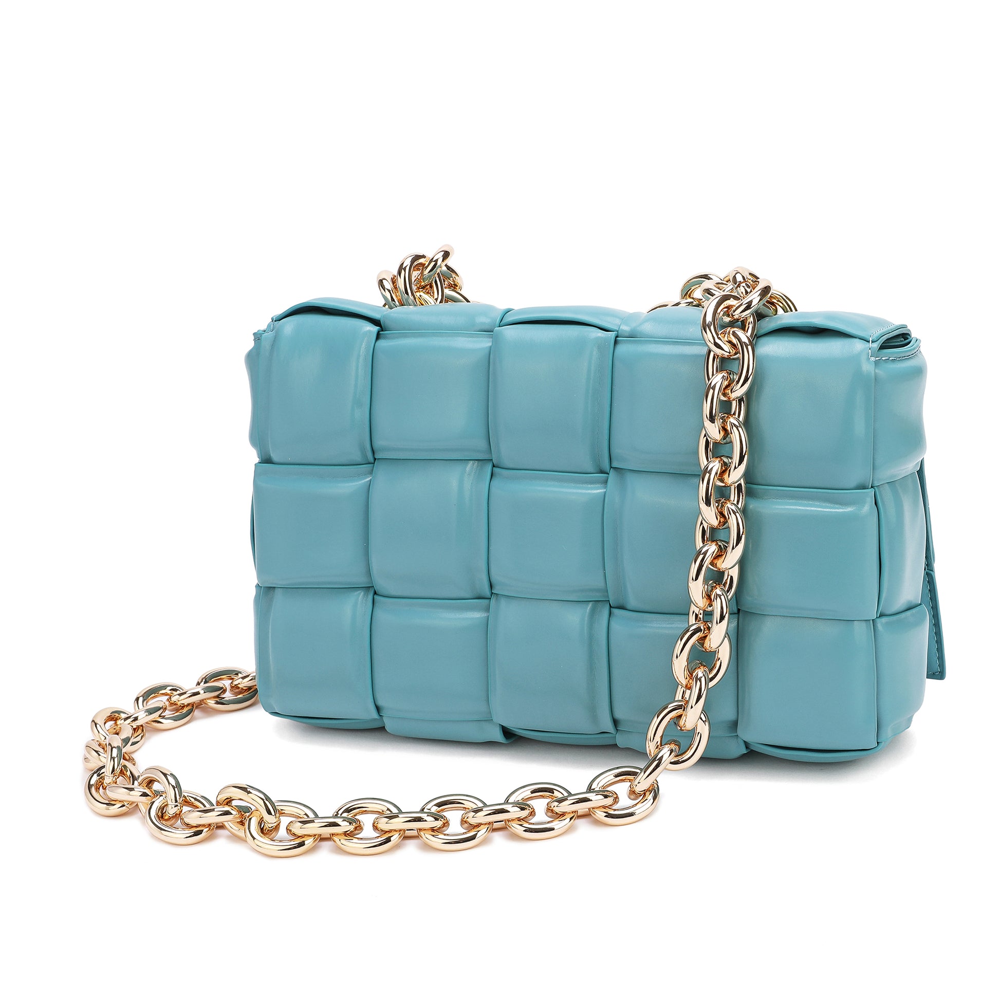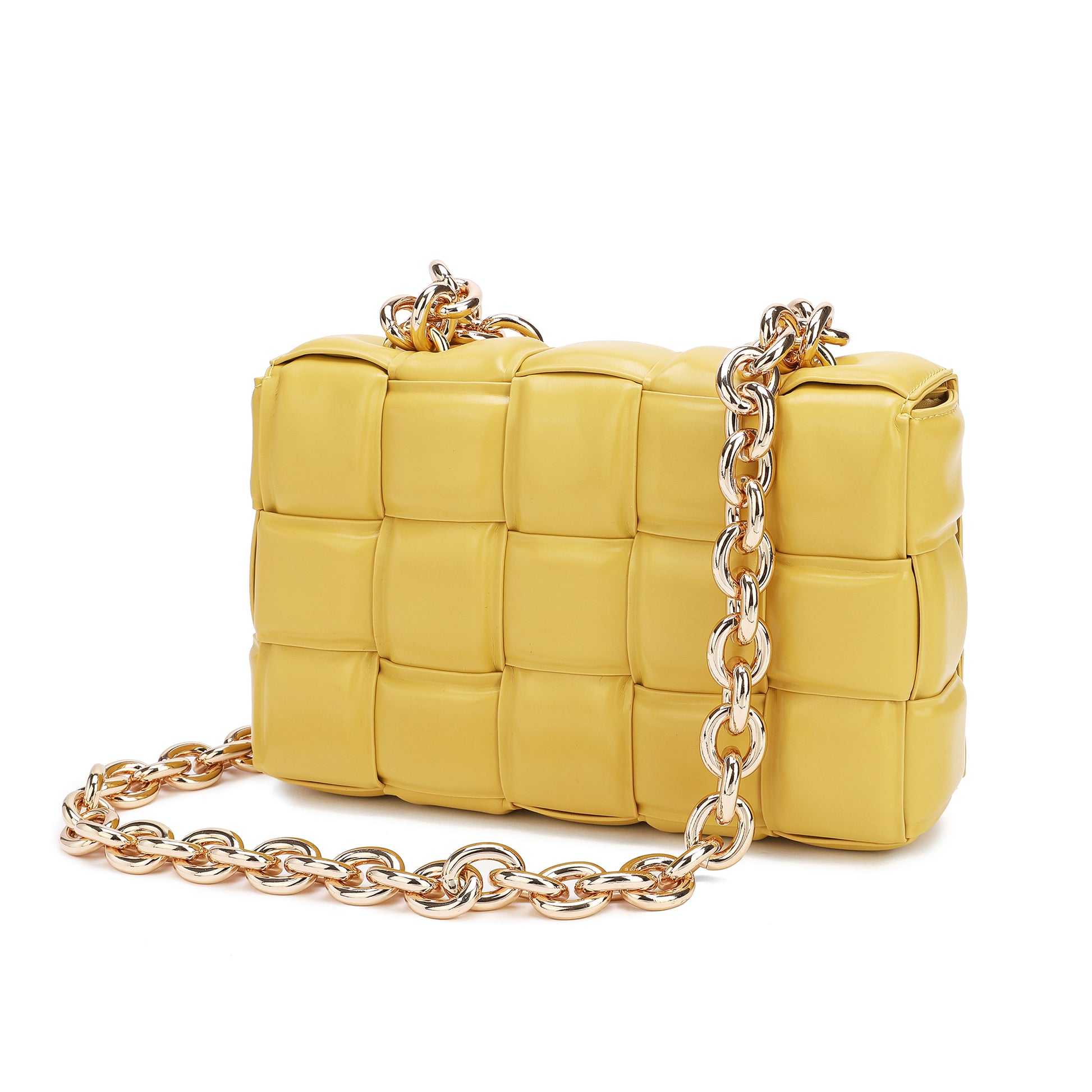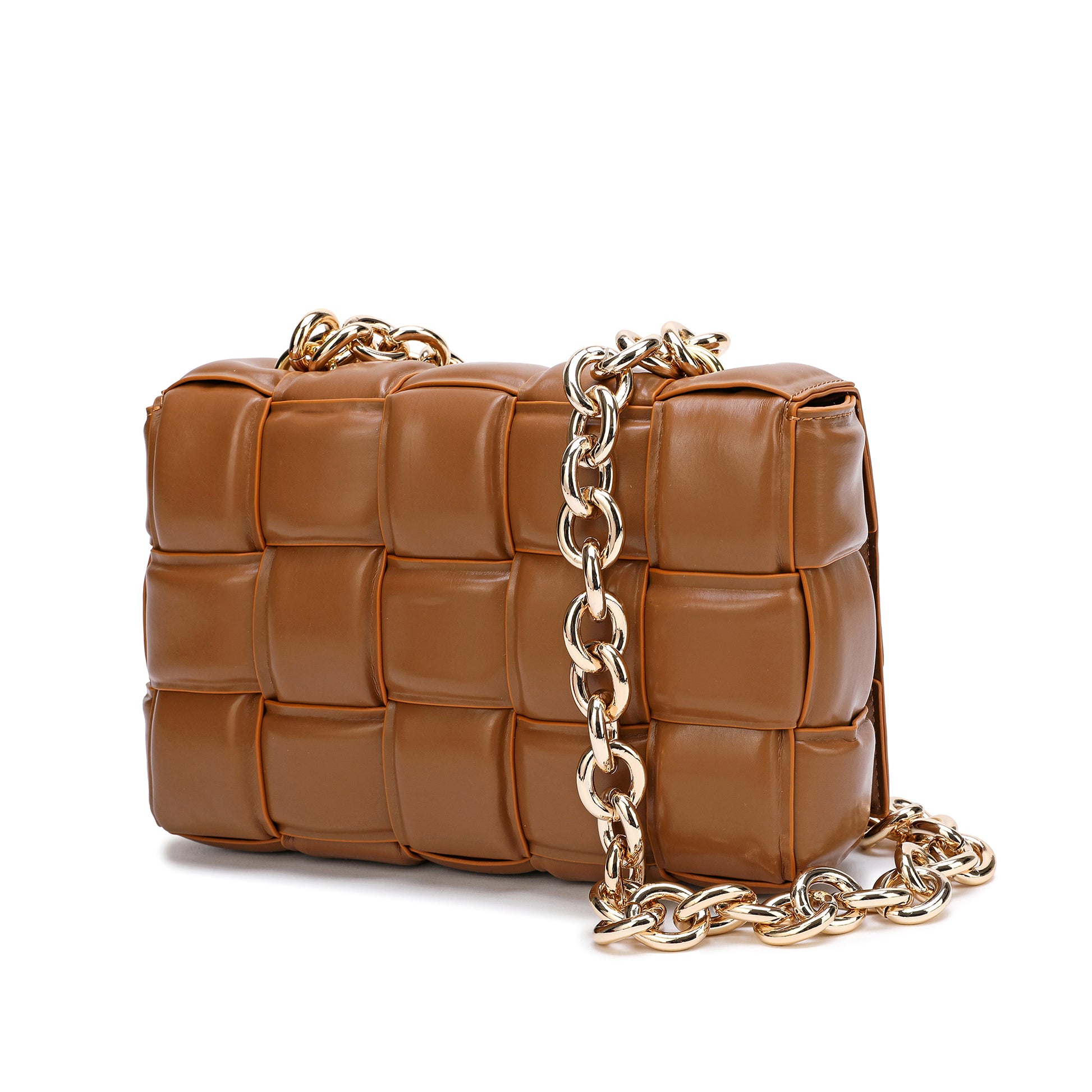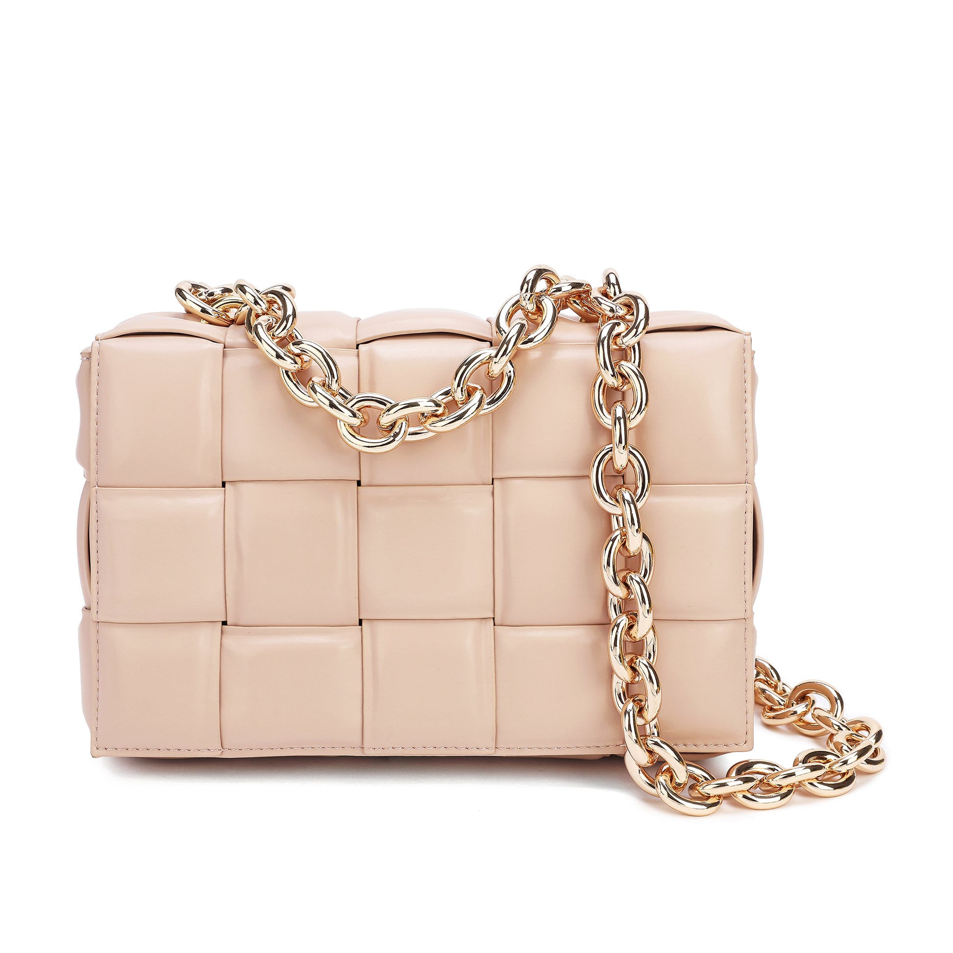 Exterior Features: Beautiful Puffer Smooth Leather Woven construction Shoulder Bag adorned with a golden-tone Chain