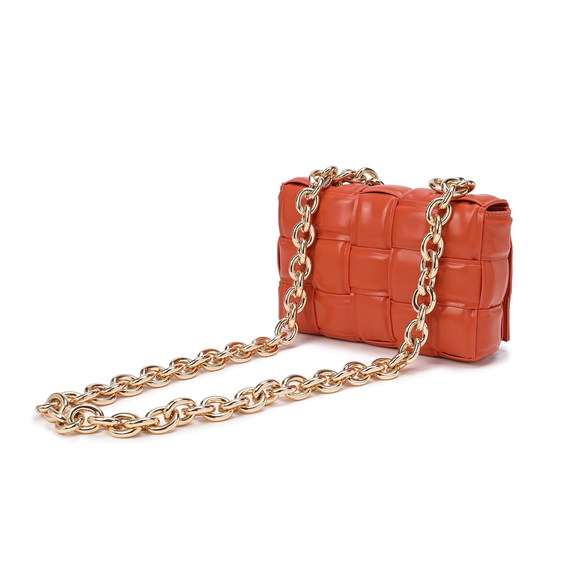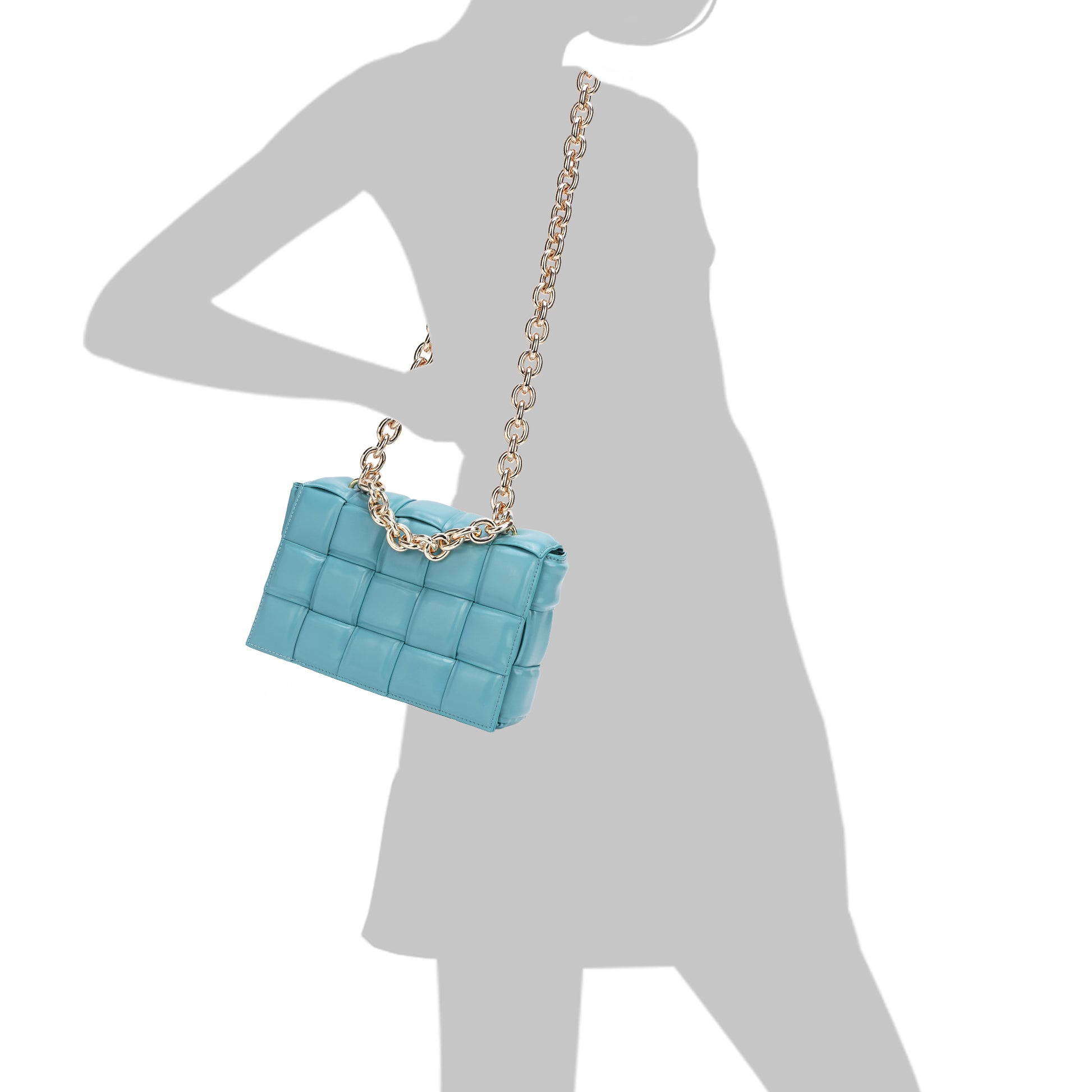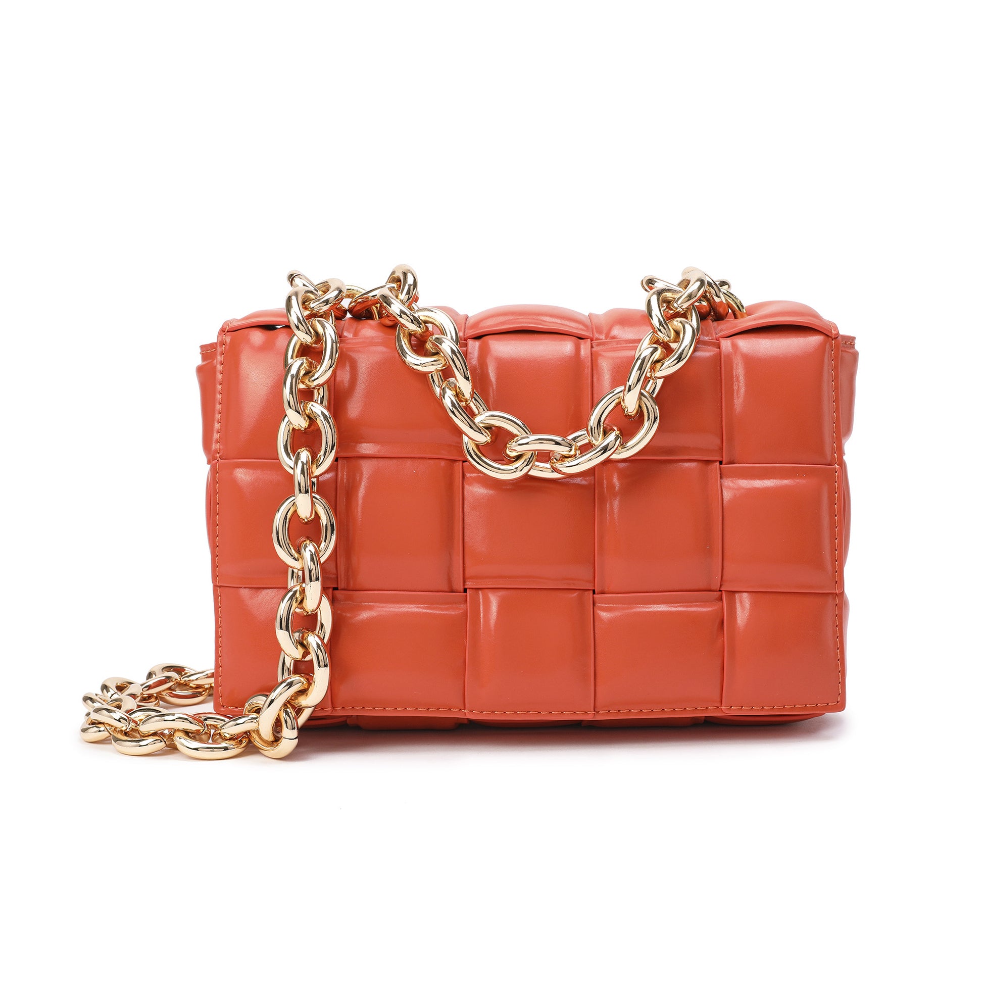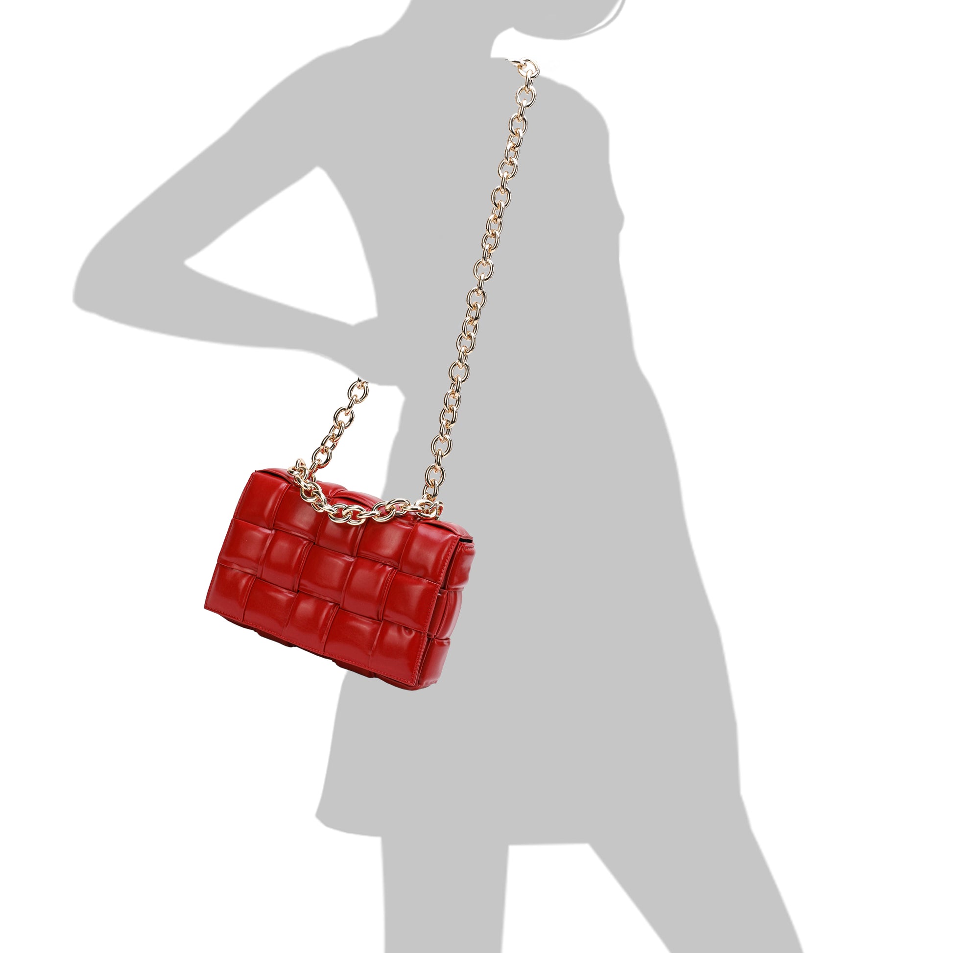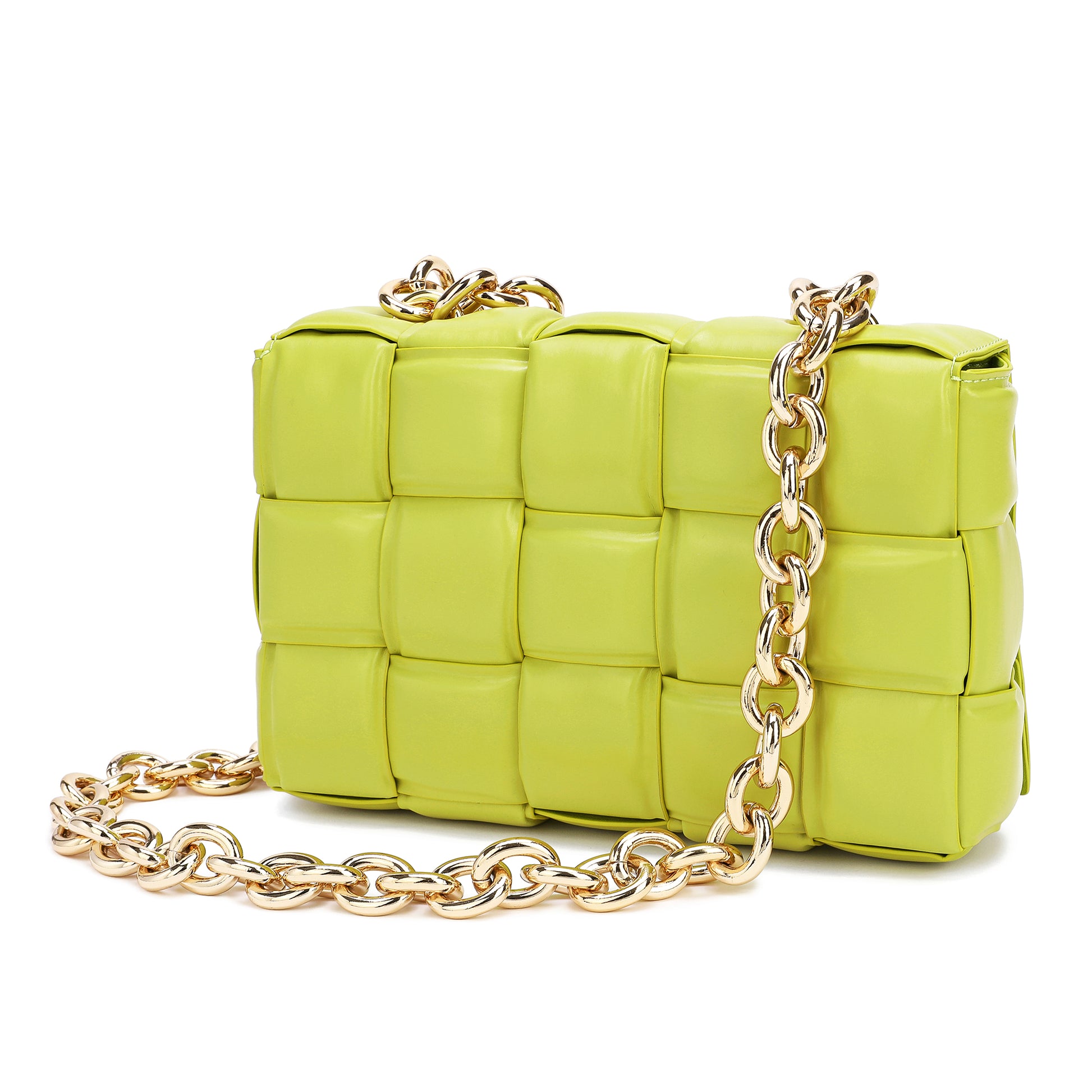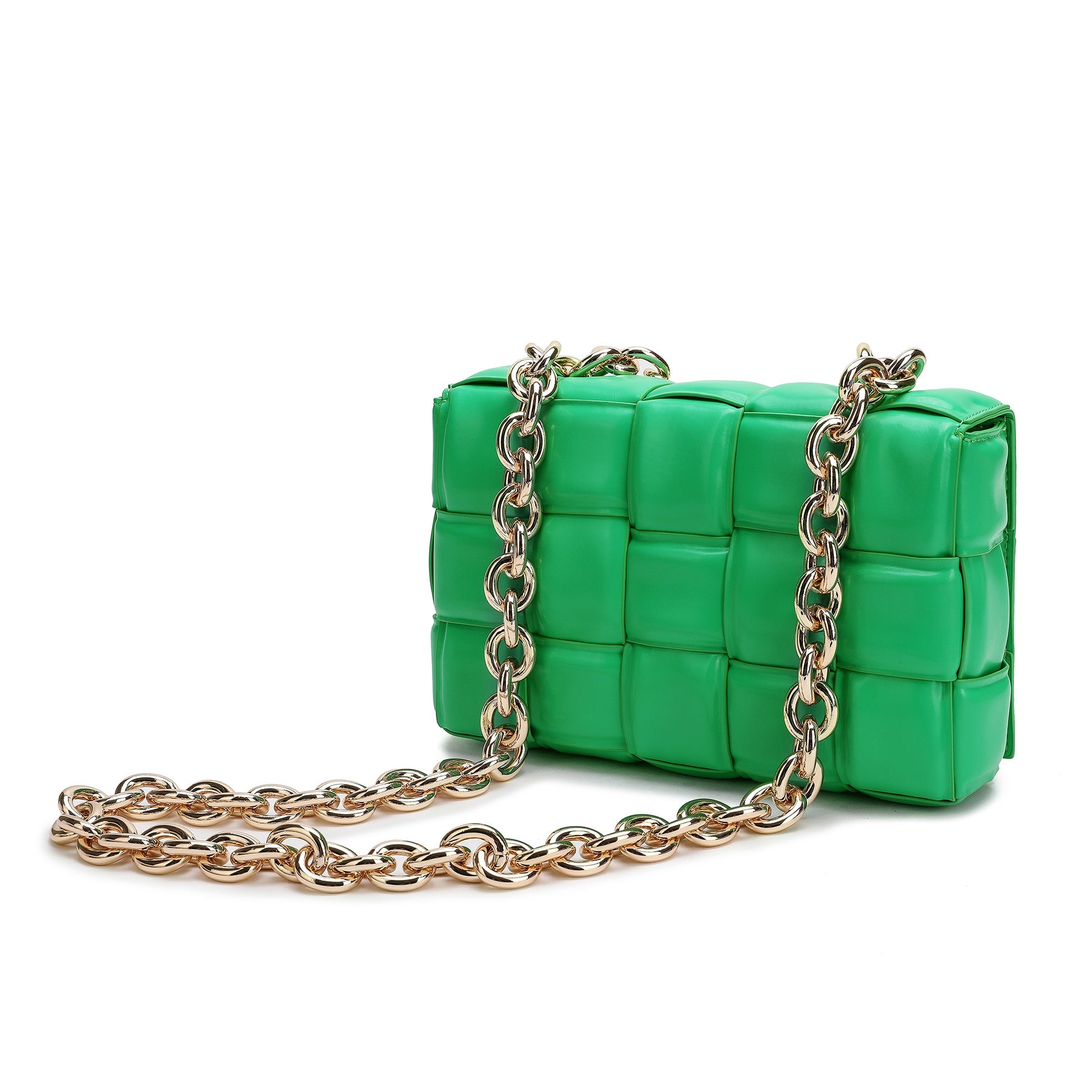 Exterior Features: Beautiful Puffer Smooth Leather Woven construction Shoulder Bag adorned with a golden-tone Chain