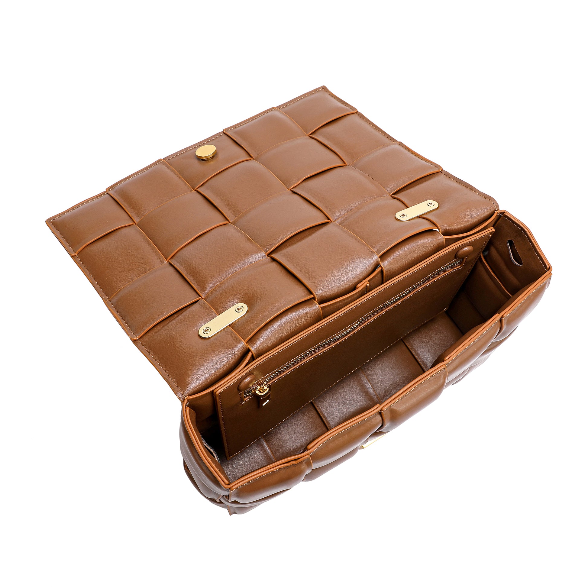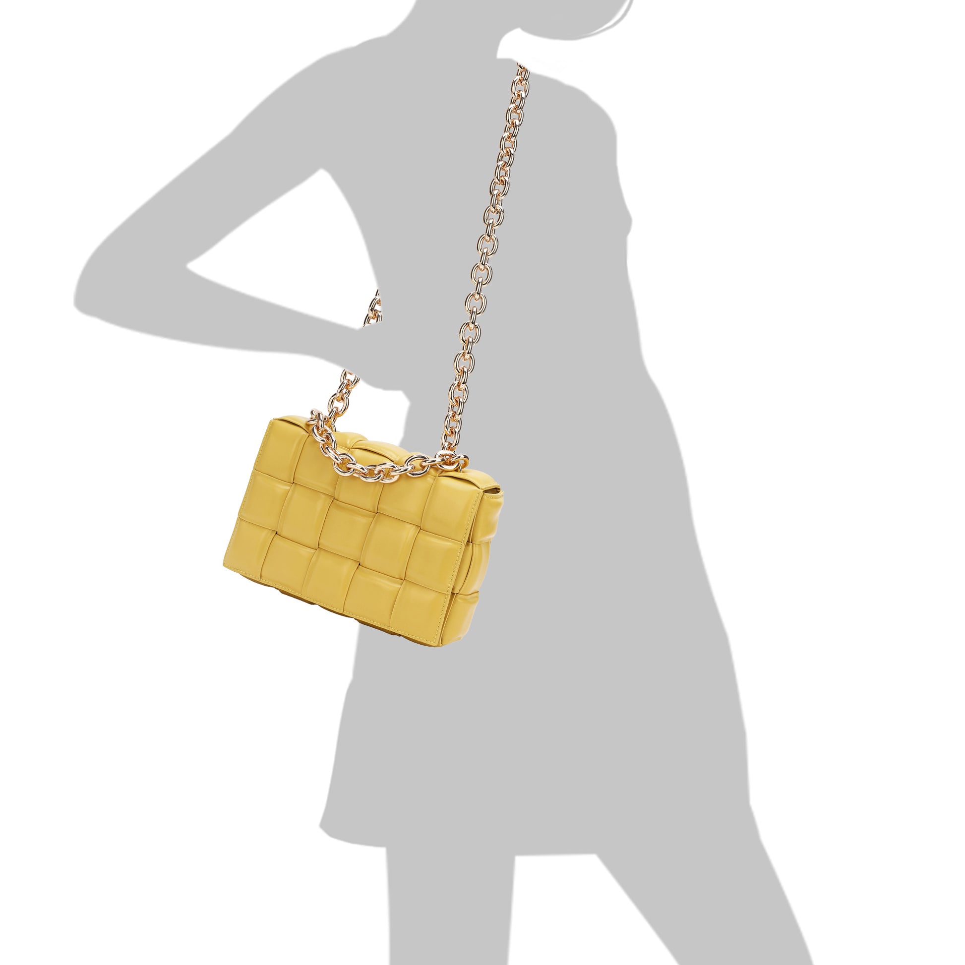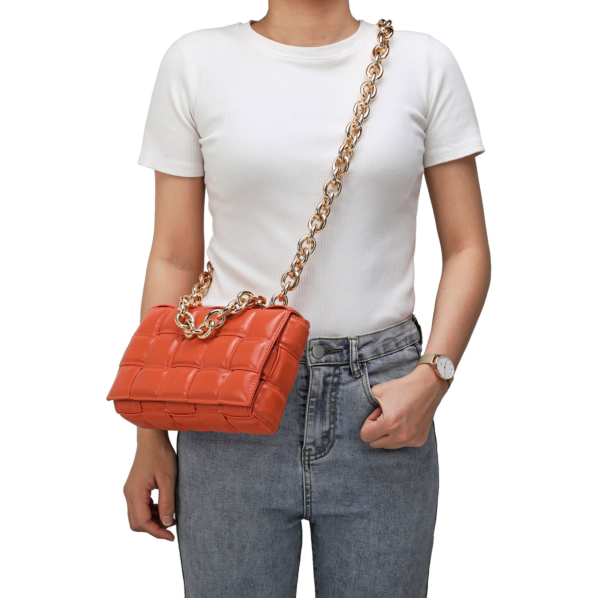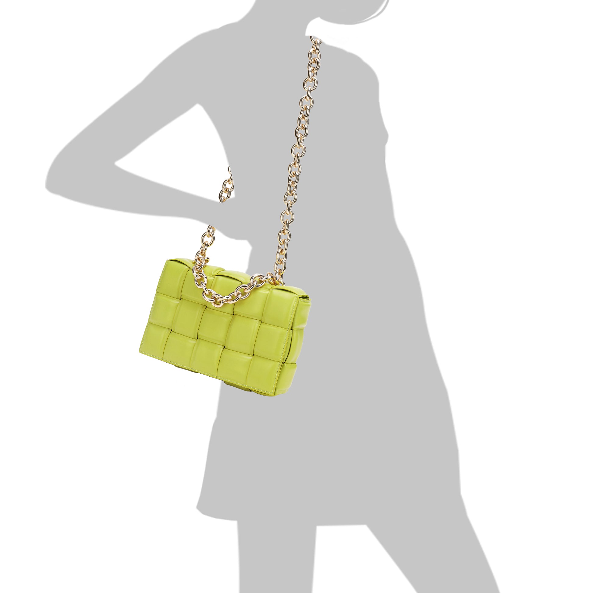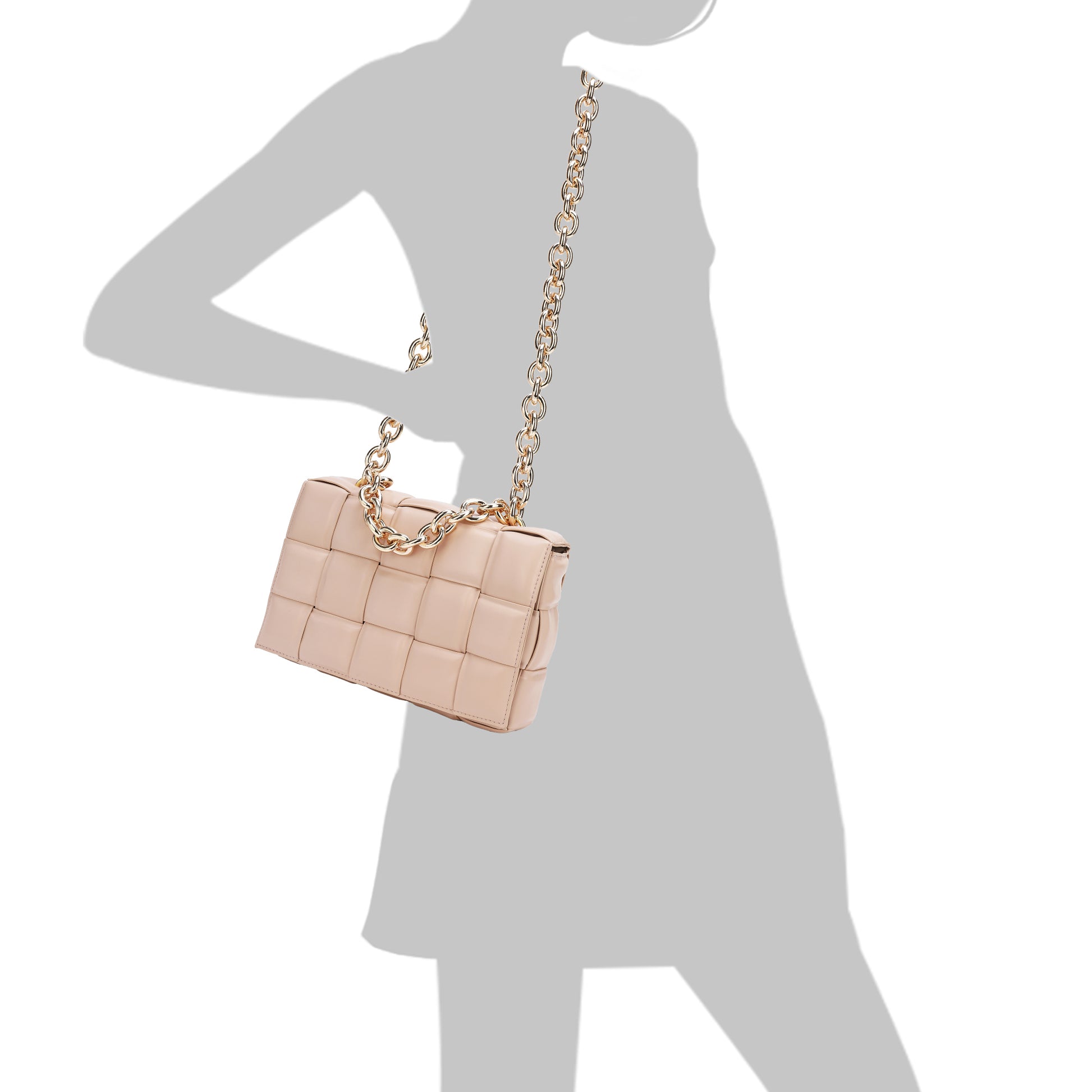 Exterior Features: Beautiful Puffer Smooth Leather Woven construction Shoulder Bag adorned with a golden-tone Chain