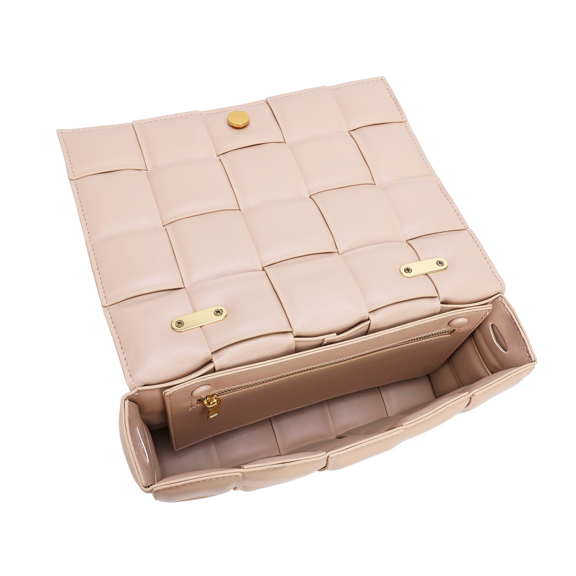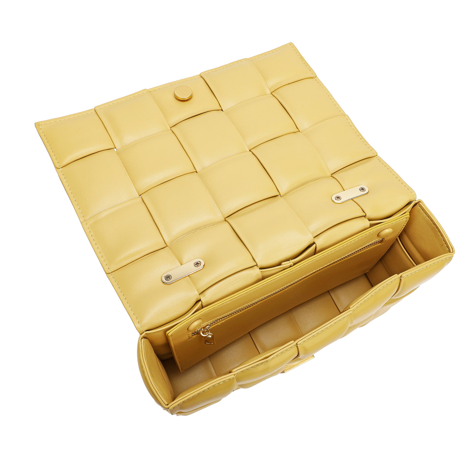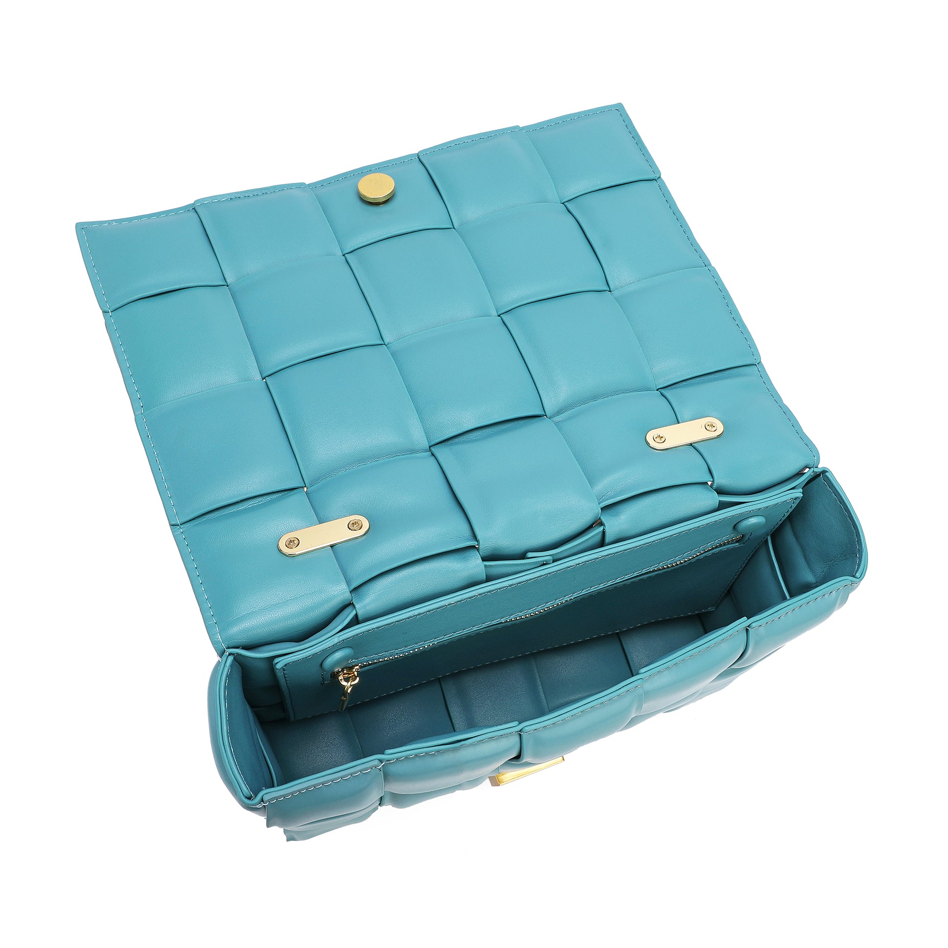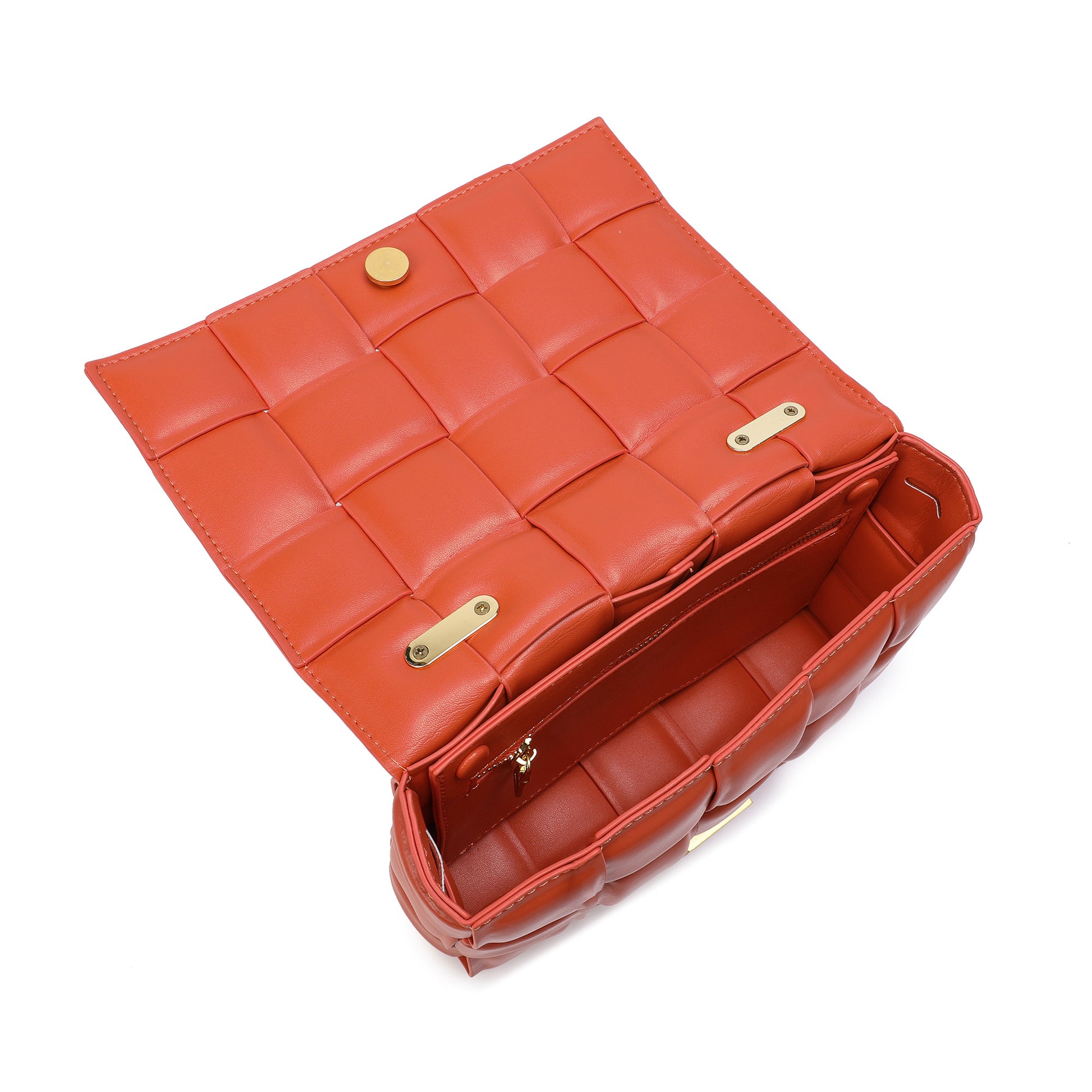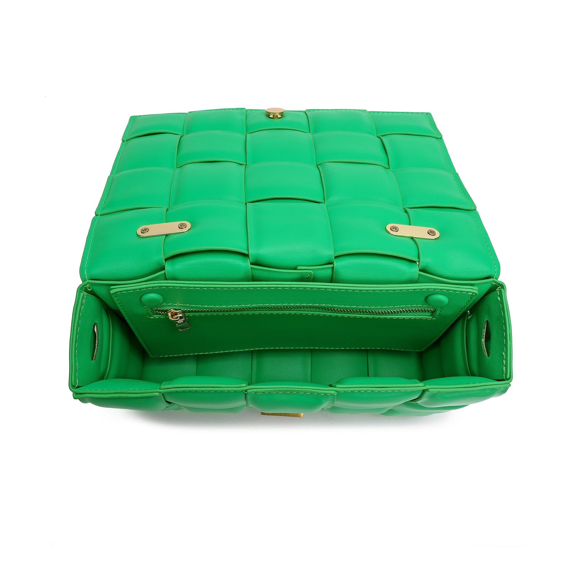 Exterior Features: Beautiful Puffer Smooth Leather Woven construction Shoulder Bag adorned with a golden-tone Chain
