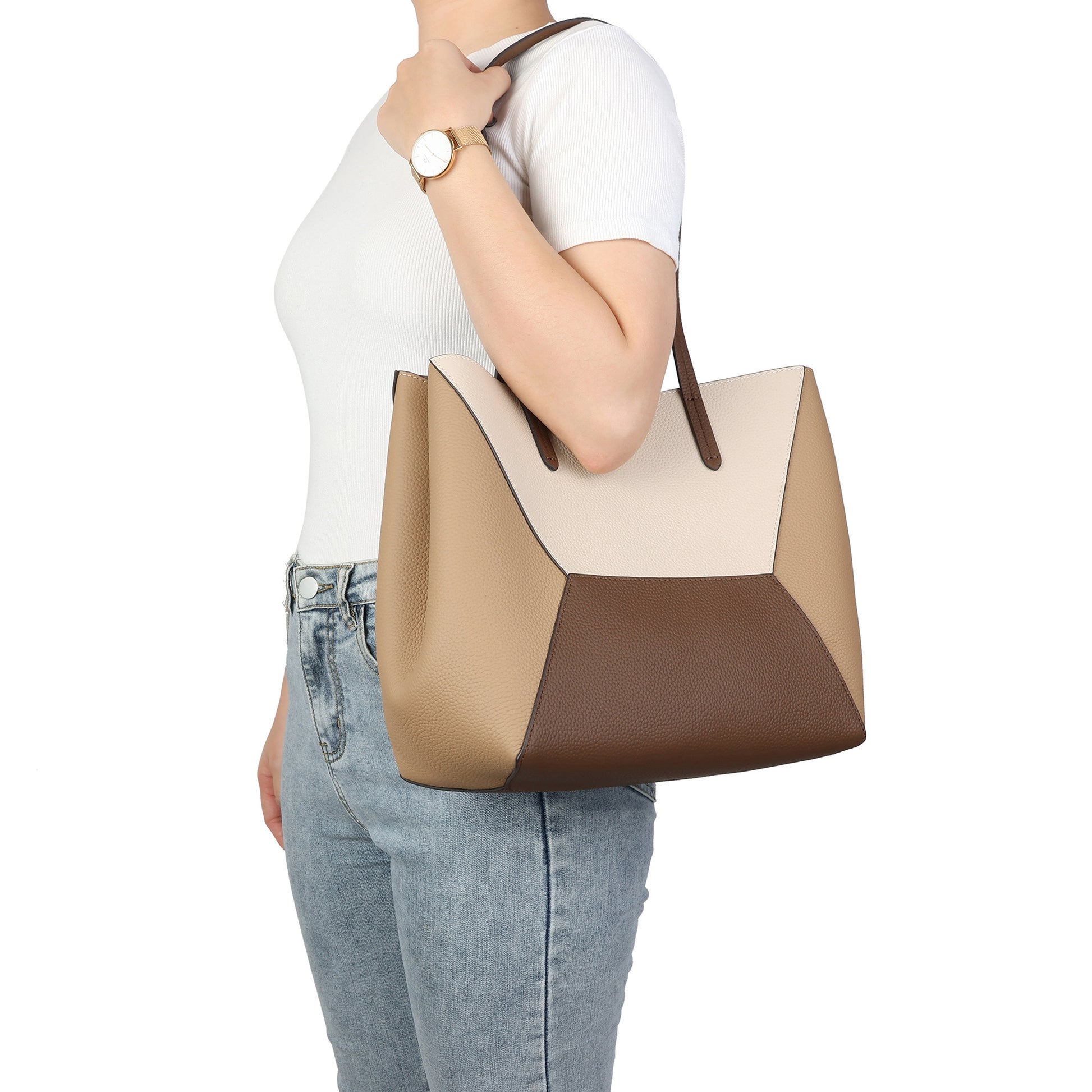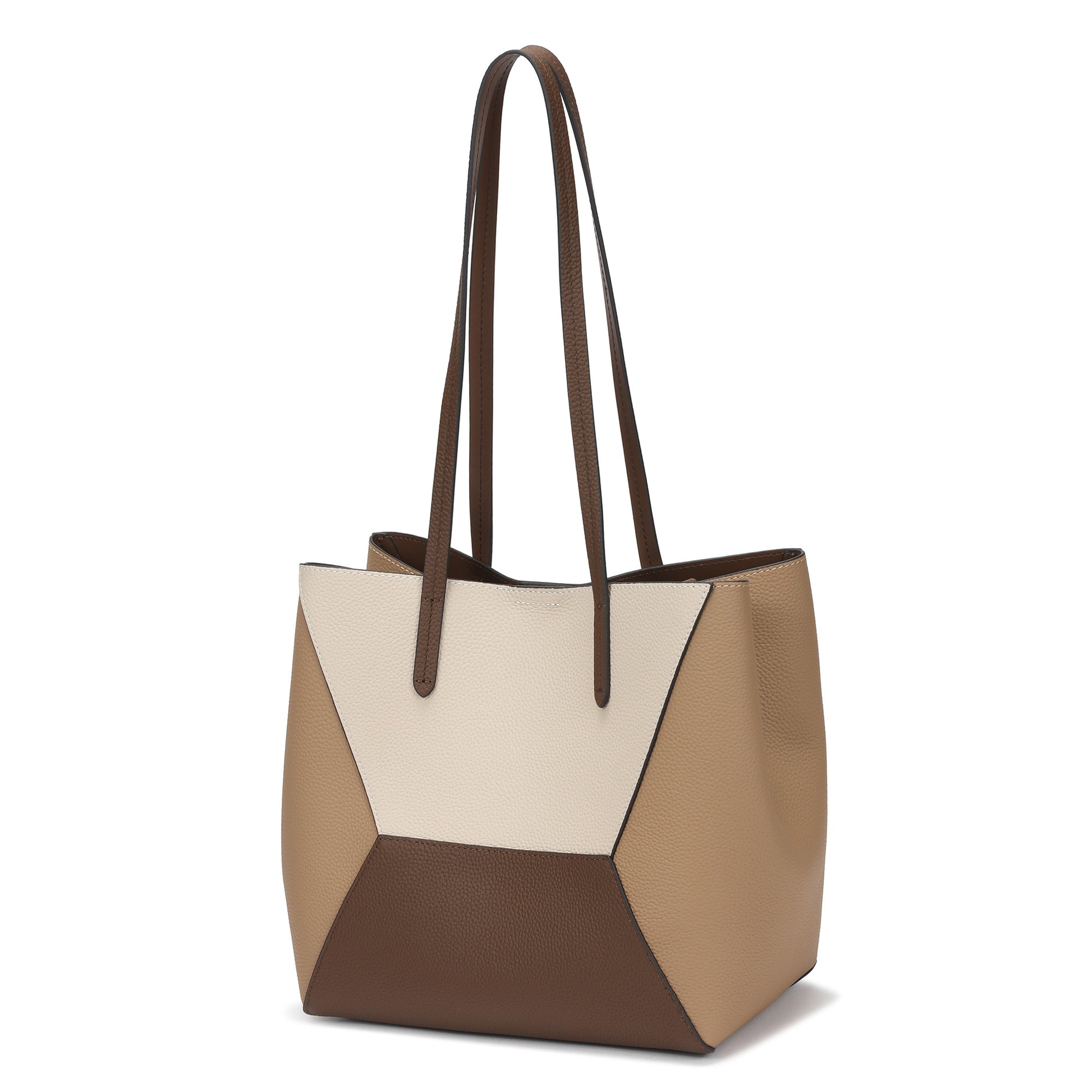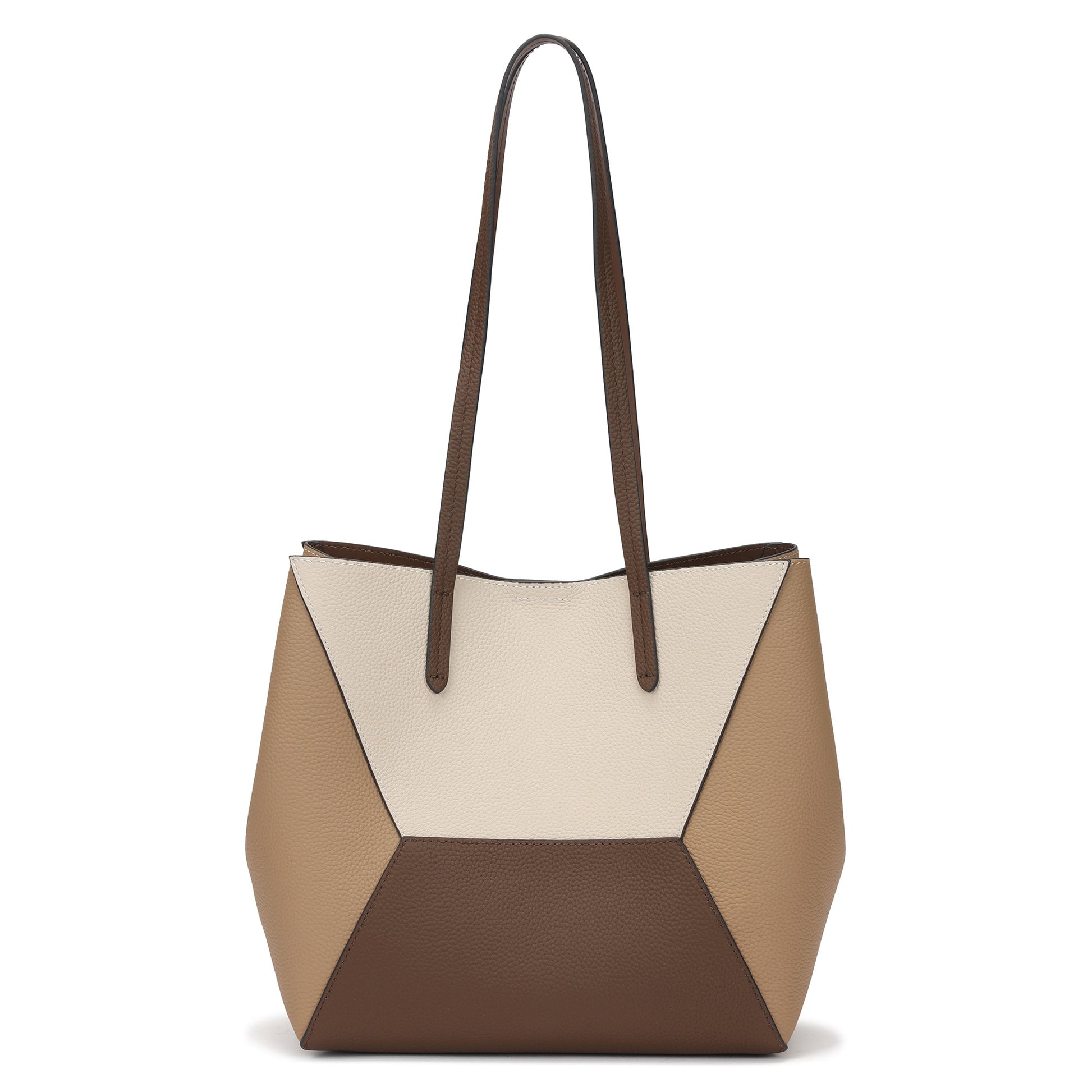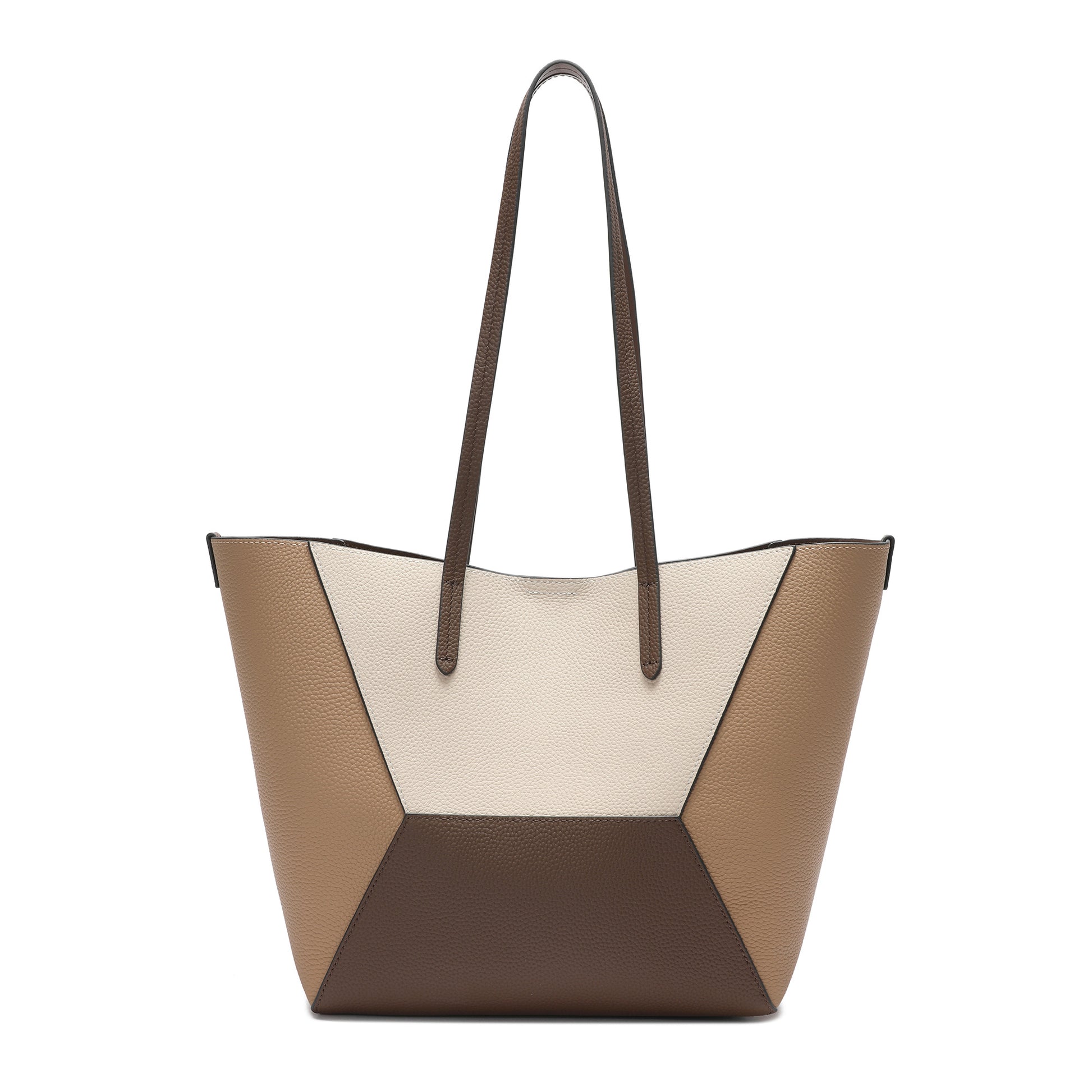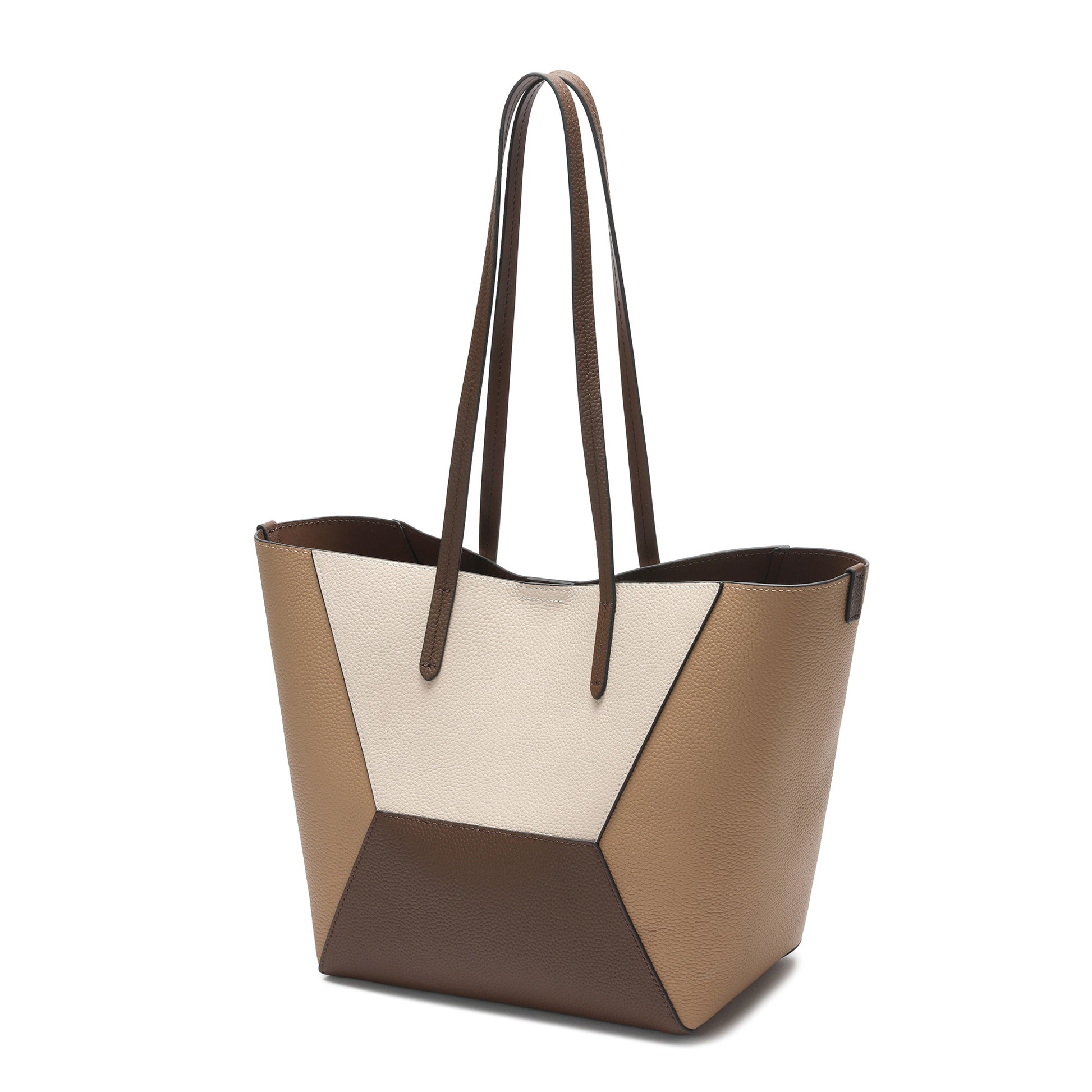 Crafted from premium textured leather, the unique geometric color-block design in neutral tones adds a contemporary flair, making it an effortless complement to any outfit. Available in multi-tone and khaki, this tote offers versatility to suit your style preferences. The bag features long shoulder straps for comfortable wear, whether you're heading to work or running errands.