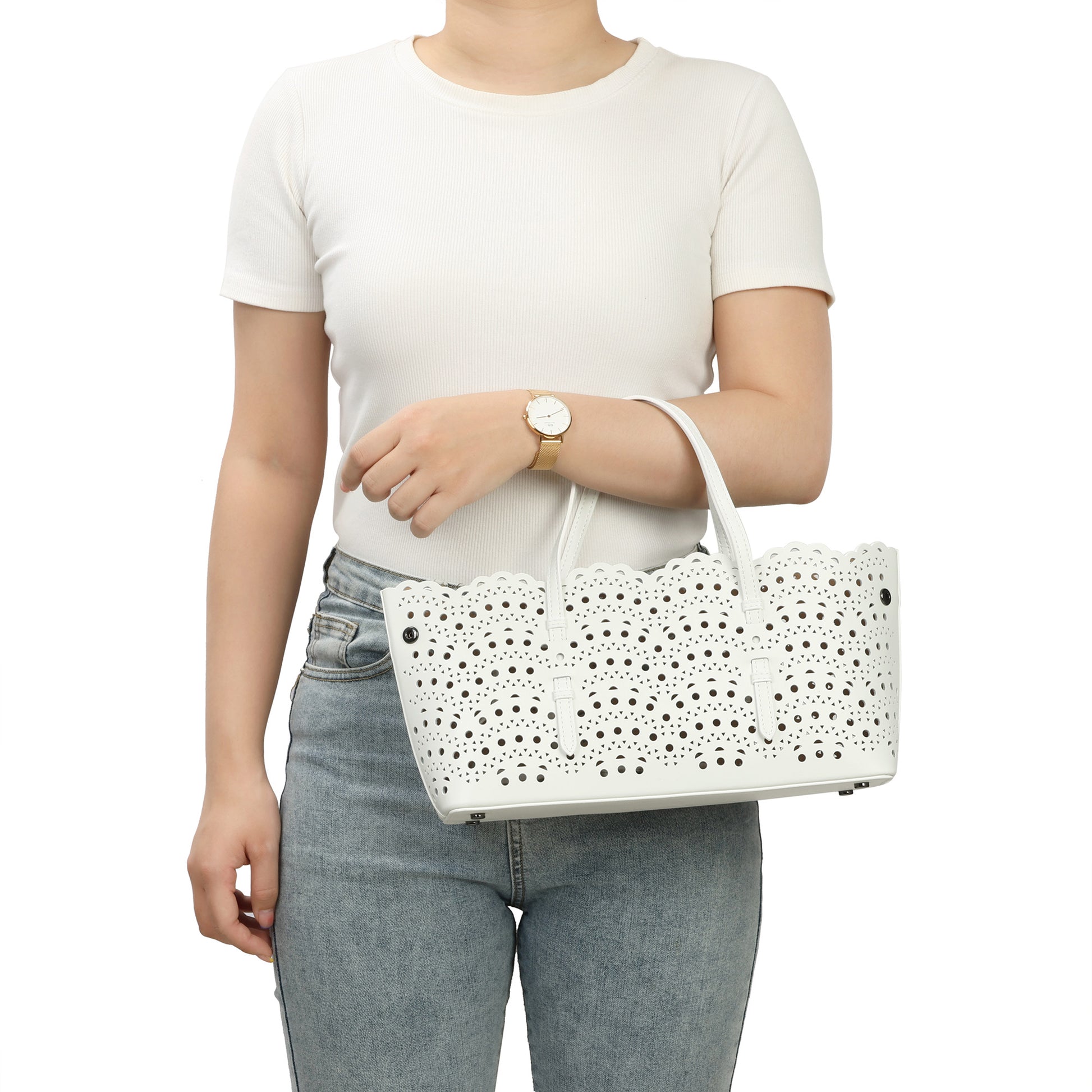 A feminine twist on the classic tote, this laser-cut leather bag is designed with intricate perforated detailing and elegant scalloped edges. Lightweight yet durable, it offers a spacious interior with a removable zip pouch for added organization. The dual top handles make it easy to carry by hand, while the detachable crossbody strap provides versatility for hands-free wear. Perfect for workdays, weekends, or warm-weather outings, this bag is equal parts chic and practical.