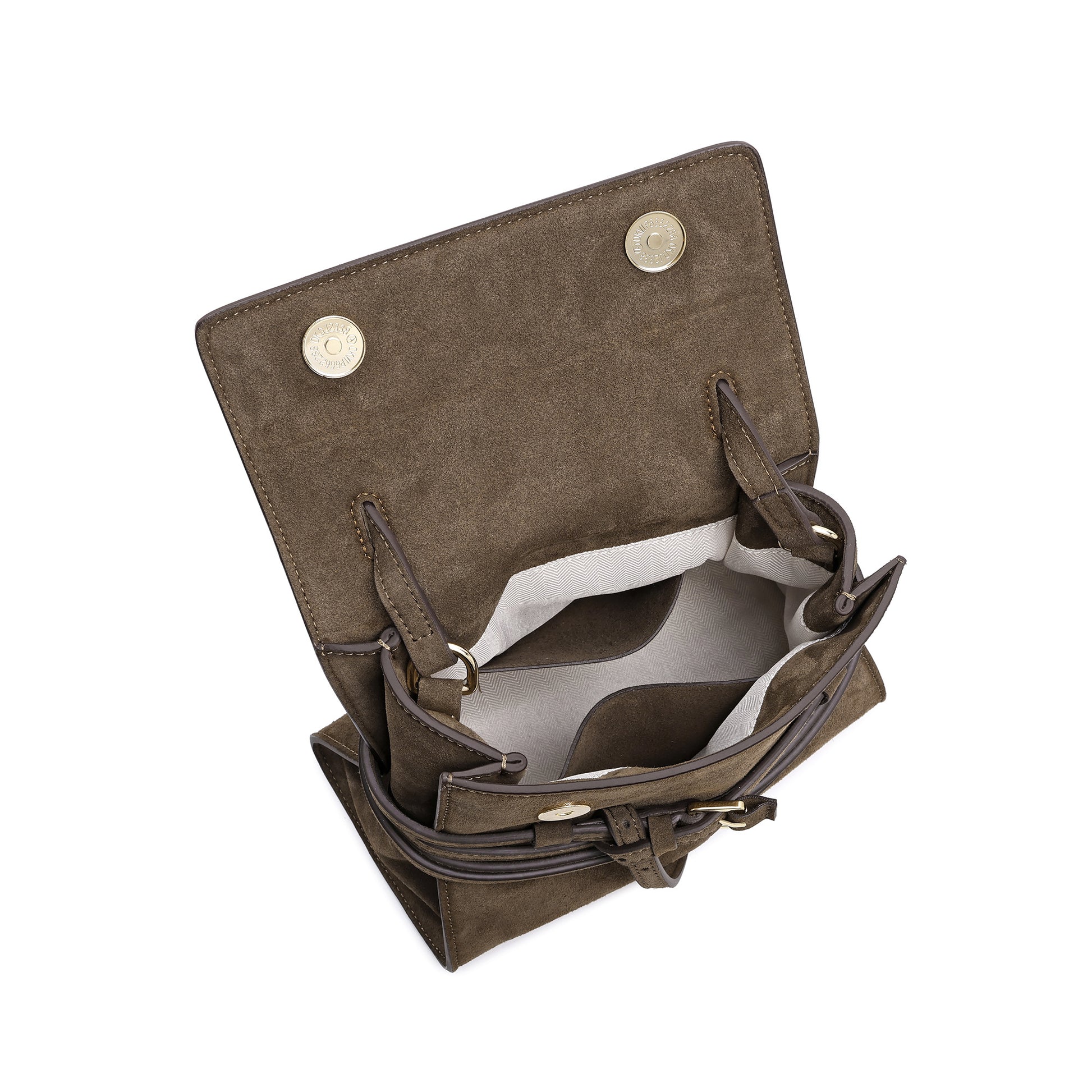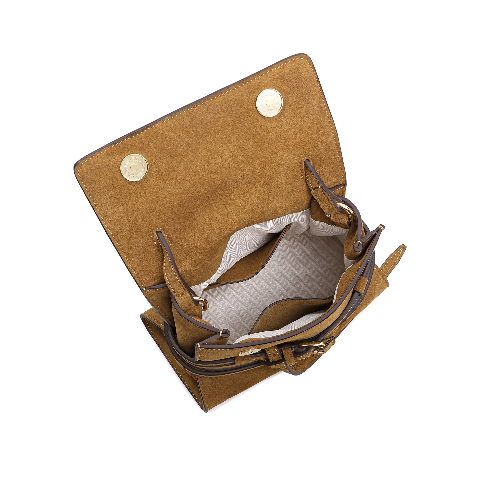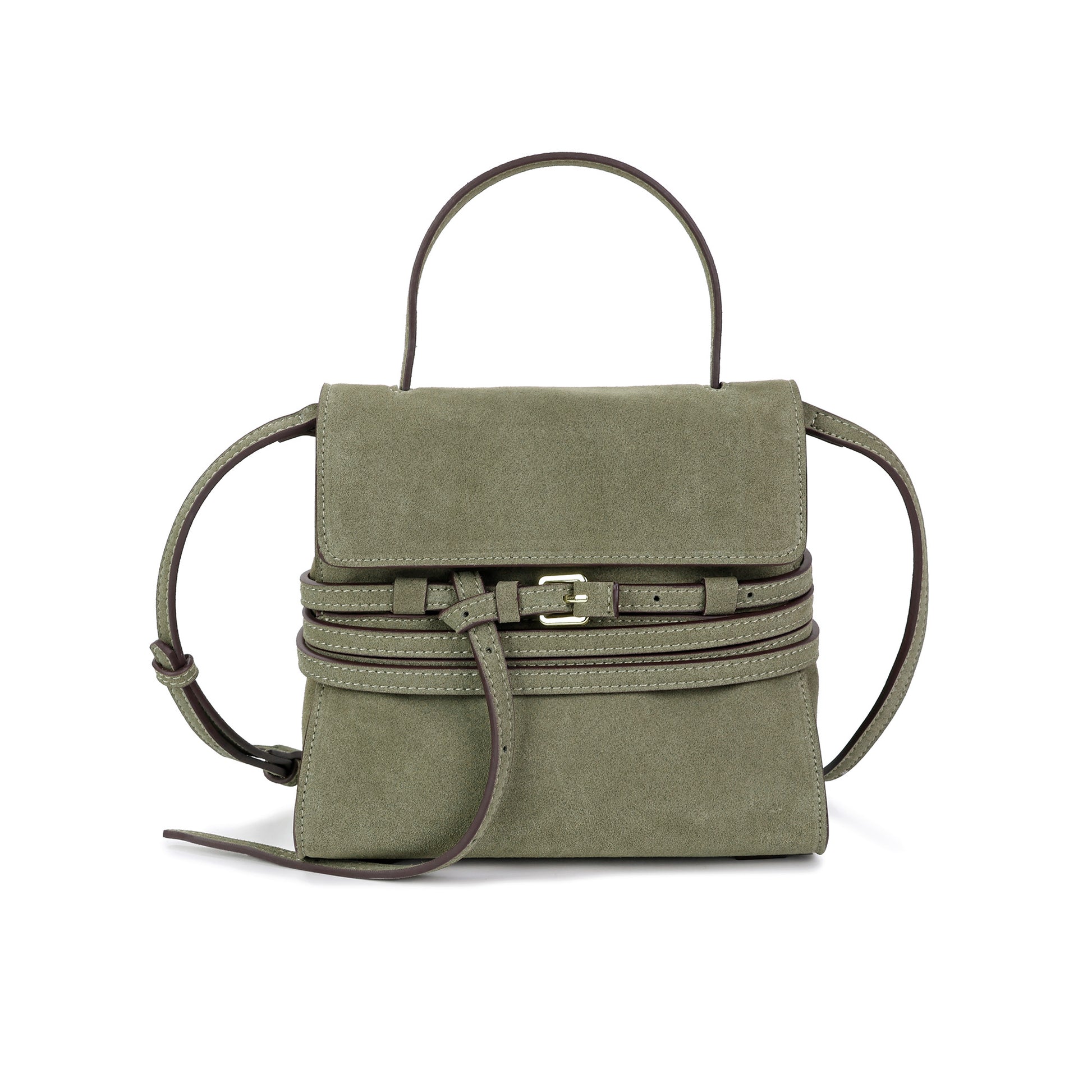 Crafted from soft fine suede leather, this structured top-handle bag features a refined front flap accented with a decorative belt detail and gold-tone buckle. Designed with a removable adjustable crossbody strap for versatile wear. The interior is fully lined and includes a slip pocket to keep essentials neatly organized.