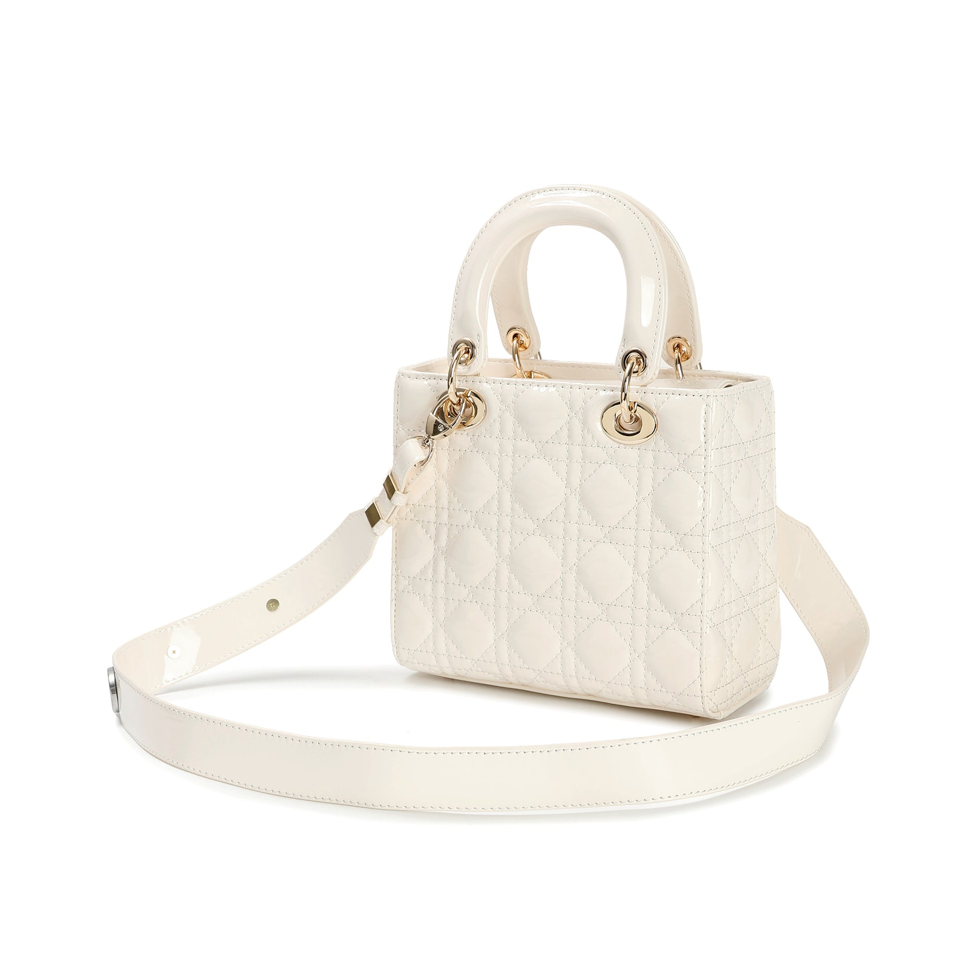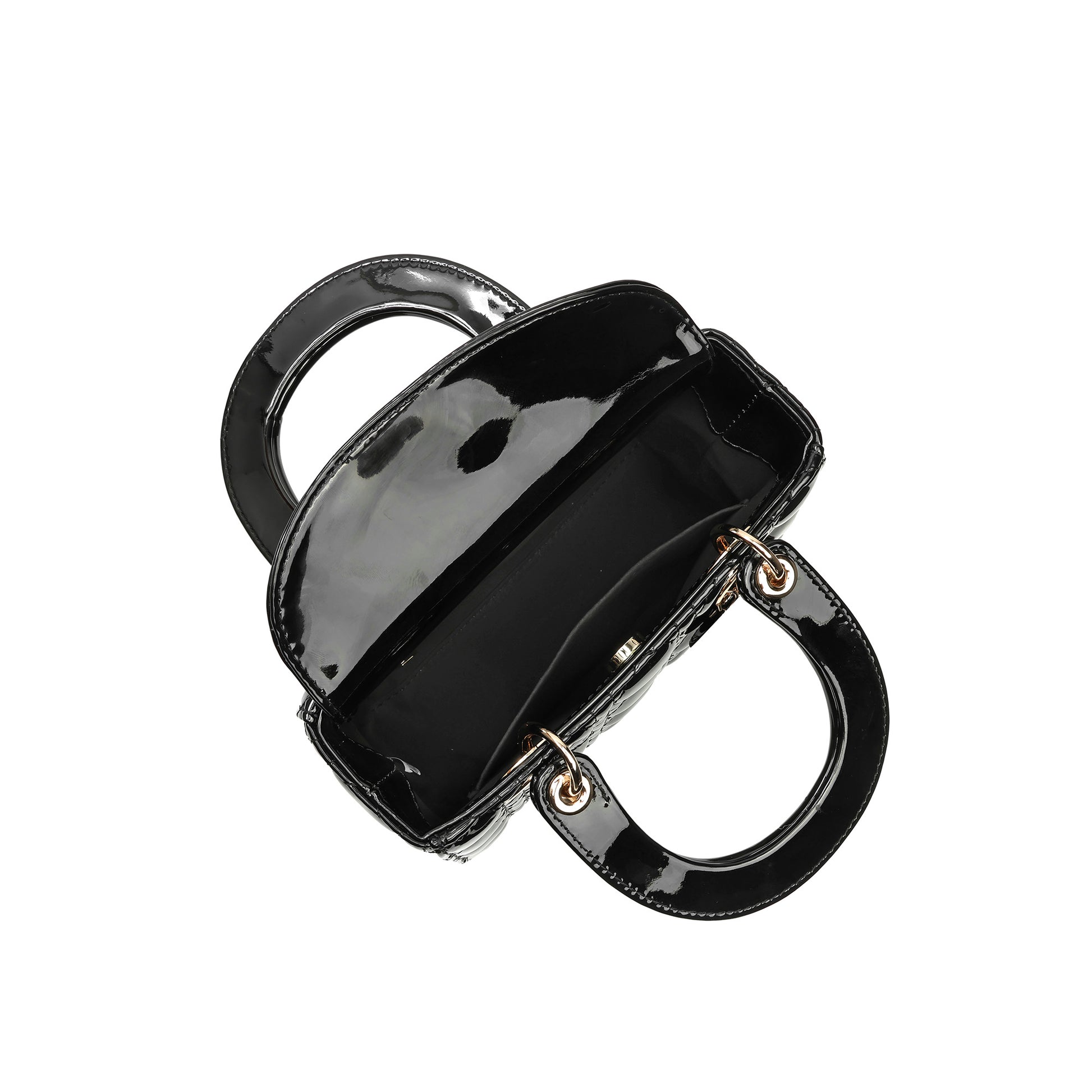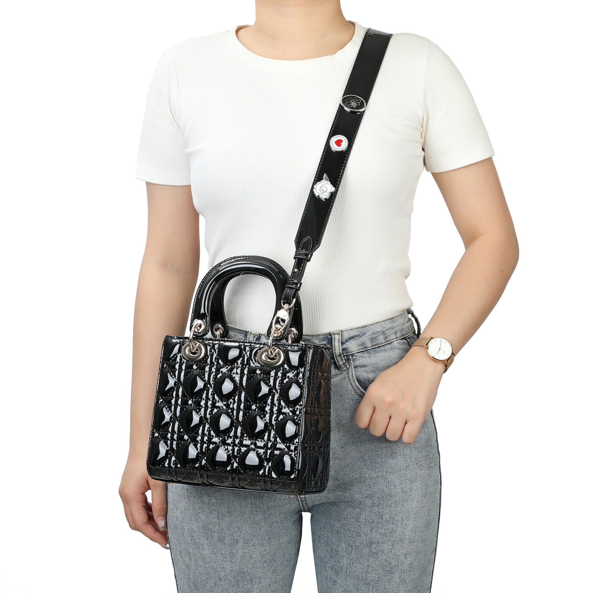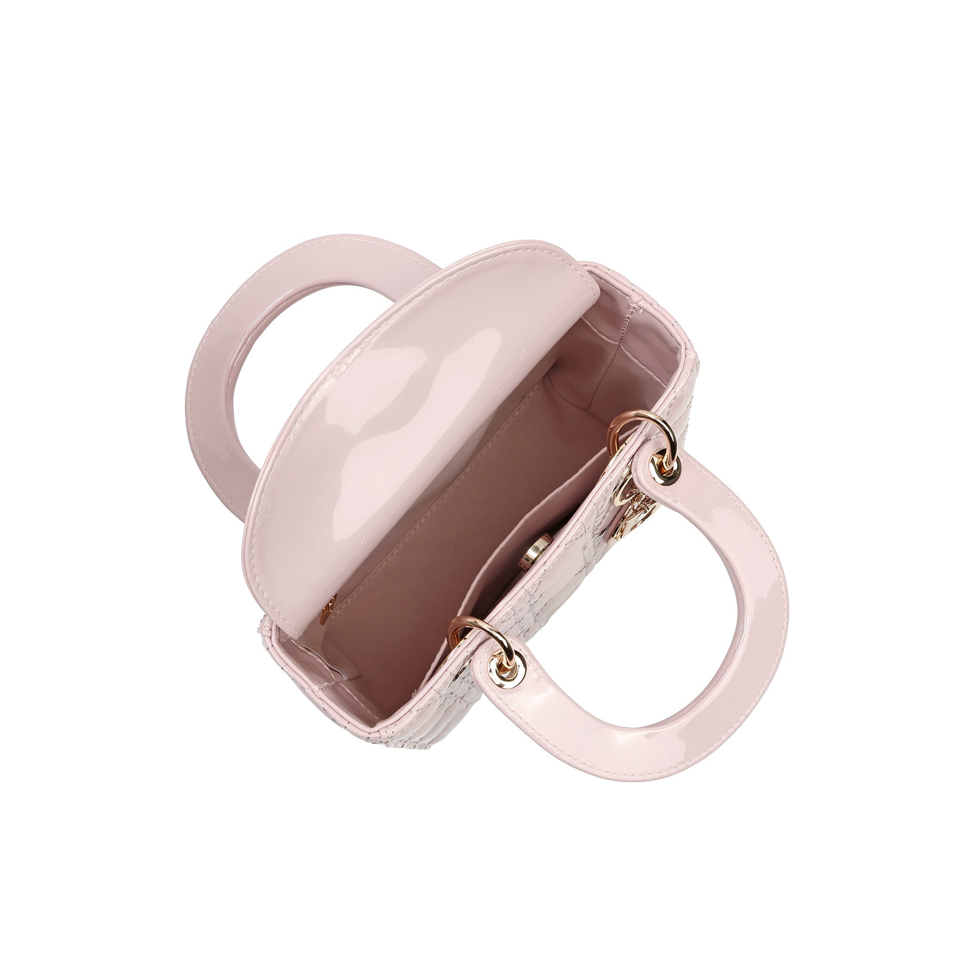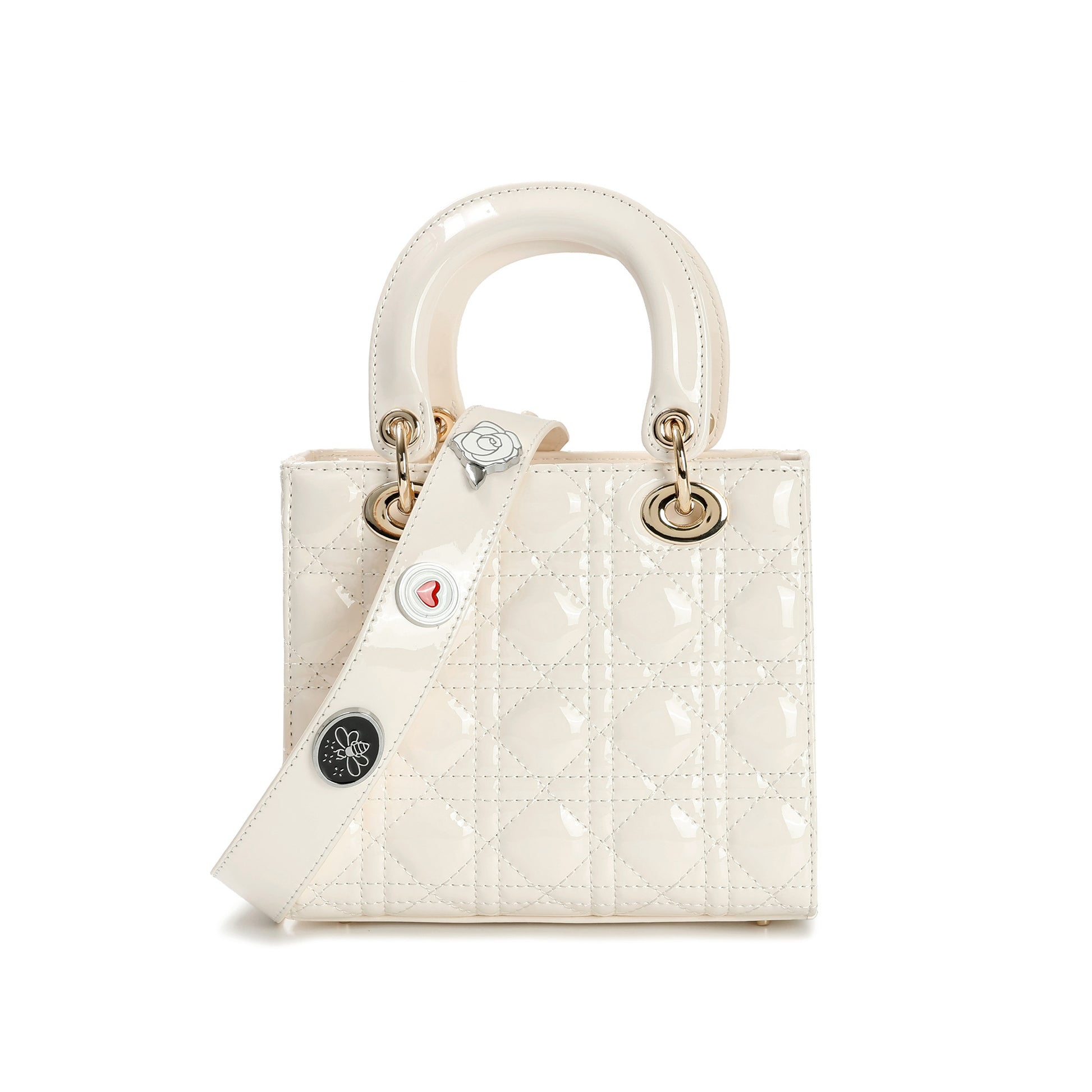 Chic, compact, and versatile — this quilted mini tote is crafted from glossy patent leather with a diamond-stitched design. Featuring dual top handles and a detachable, adjustable shoulder strap, it transitions seamlessly from a polished handbag to a crossbody for hands-free ease. The structured silhouette is finished with gold-tone hardware and decorative charms for a playful touch. The interior includes a slip pocket, perfectly sized to hold your phone, keys, or small essentials.