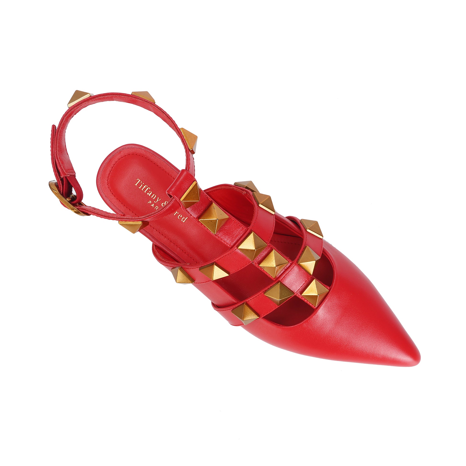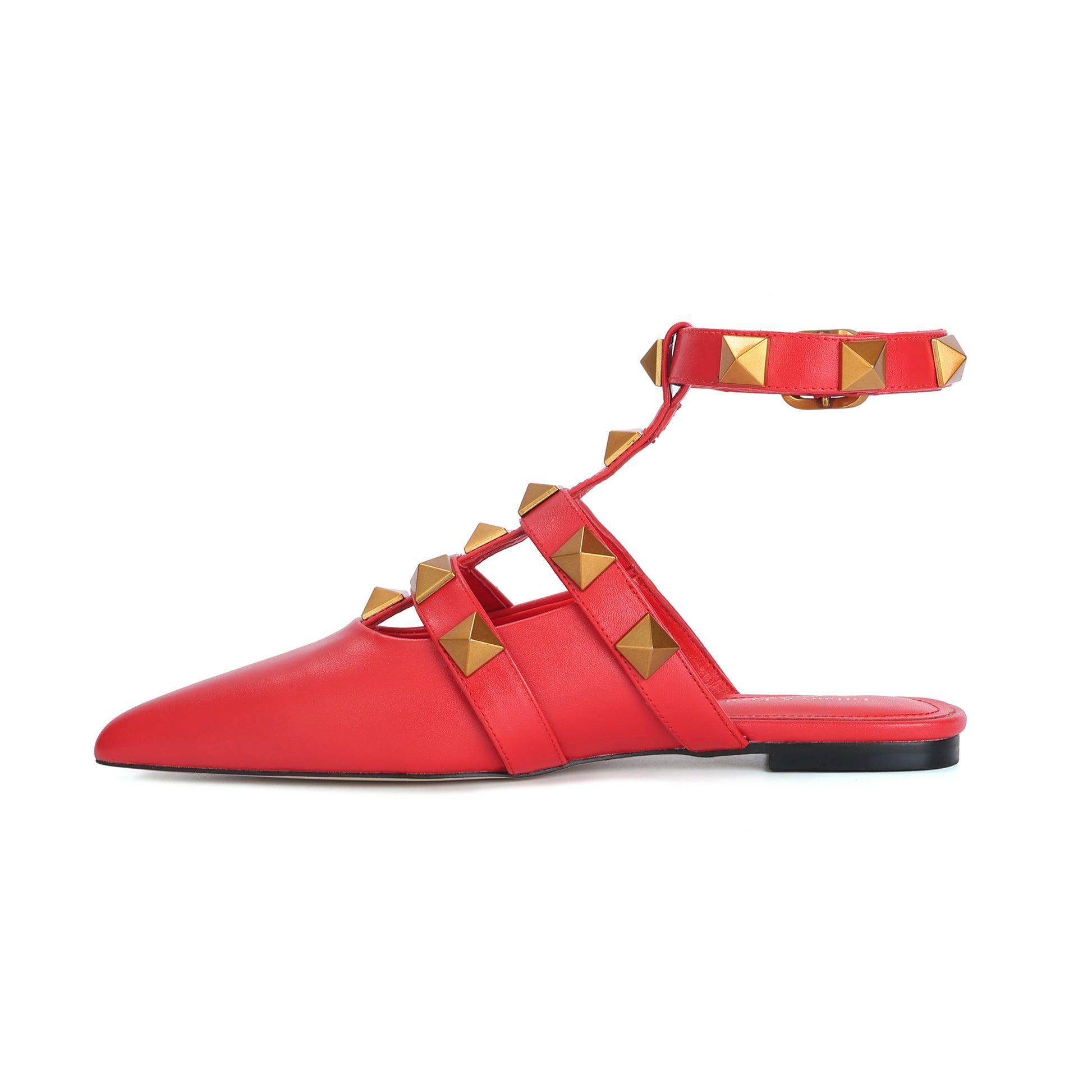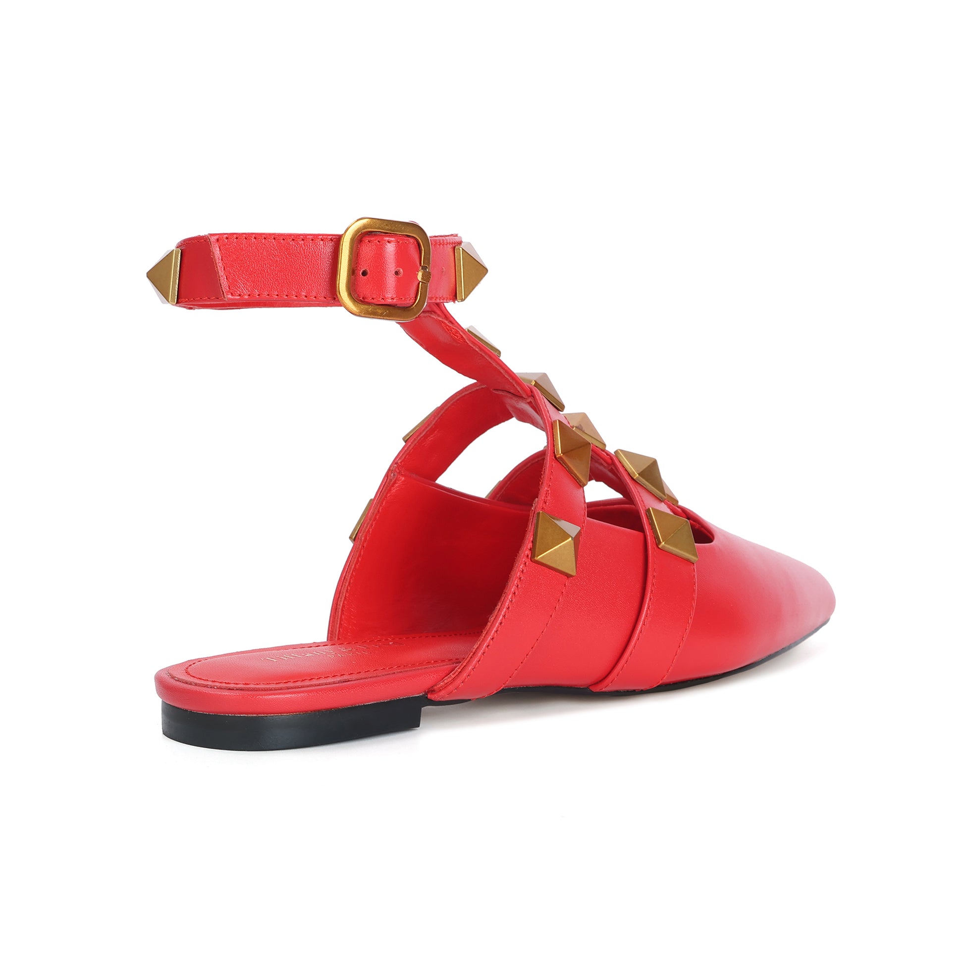 Red Studded Leather Pointed-toe Ankle Strap Flats