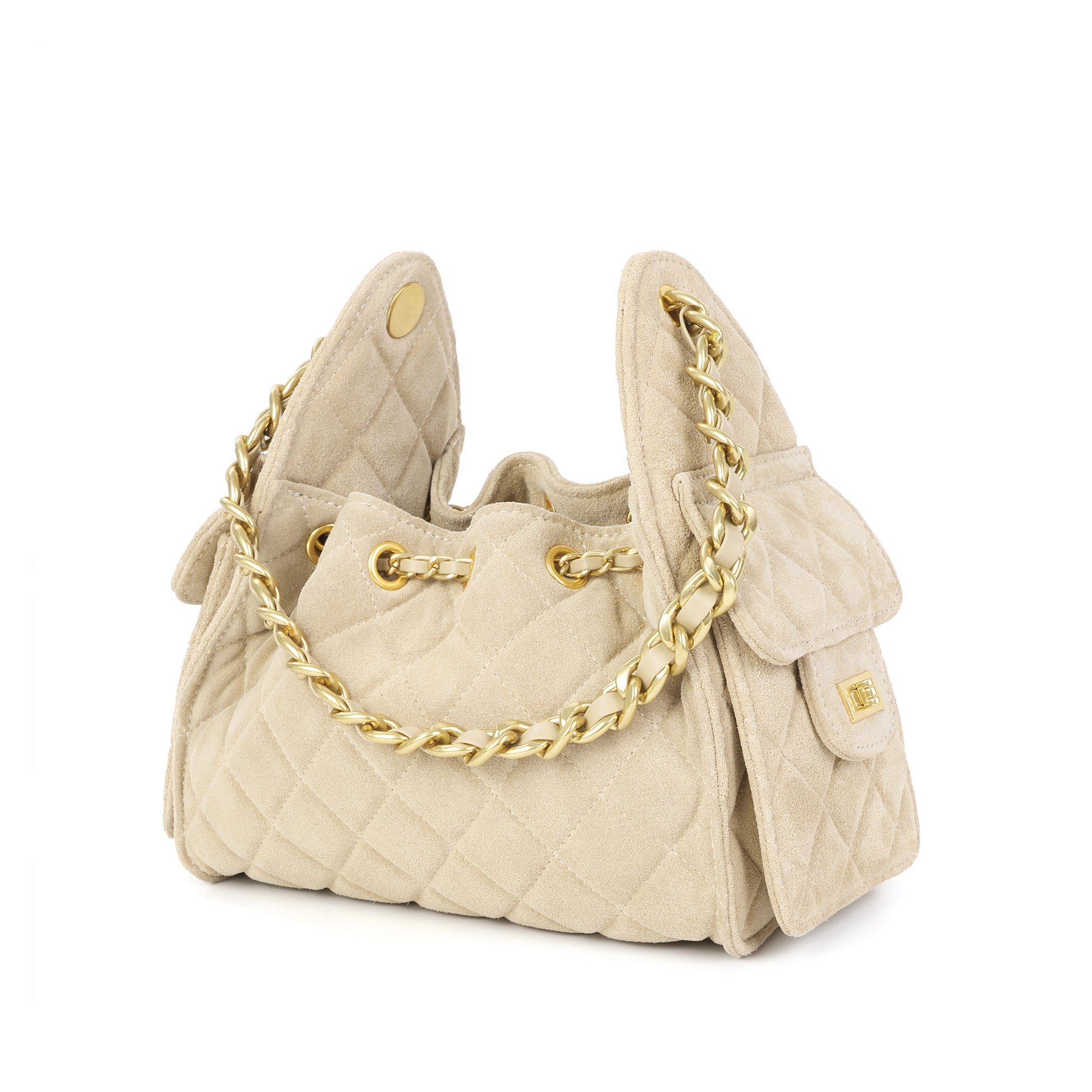 Crafted from soft quilted suede leather, this refined shoulder bag features a sculpted silhouette with a decorative front chain detail and side flap pockets accented with gold-tone hardware. Designed with a chain-trimmed shoulder strap and drawstring-style closure for a polished yet relaxed look. The interior is fully lined and offers ample space for daily essentials.