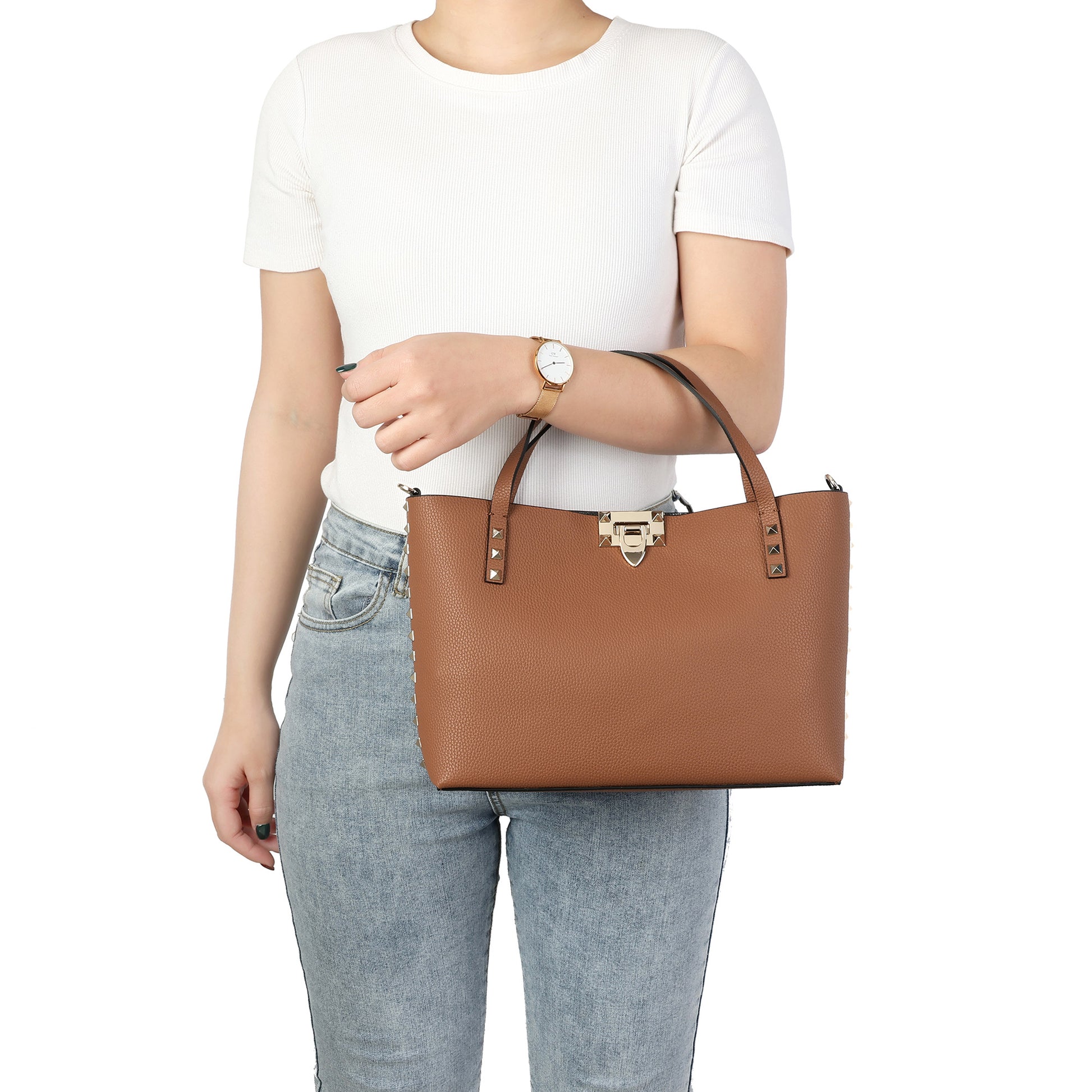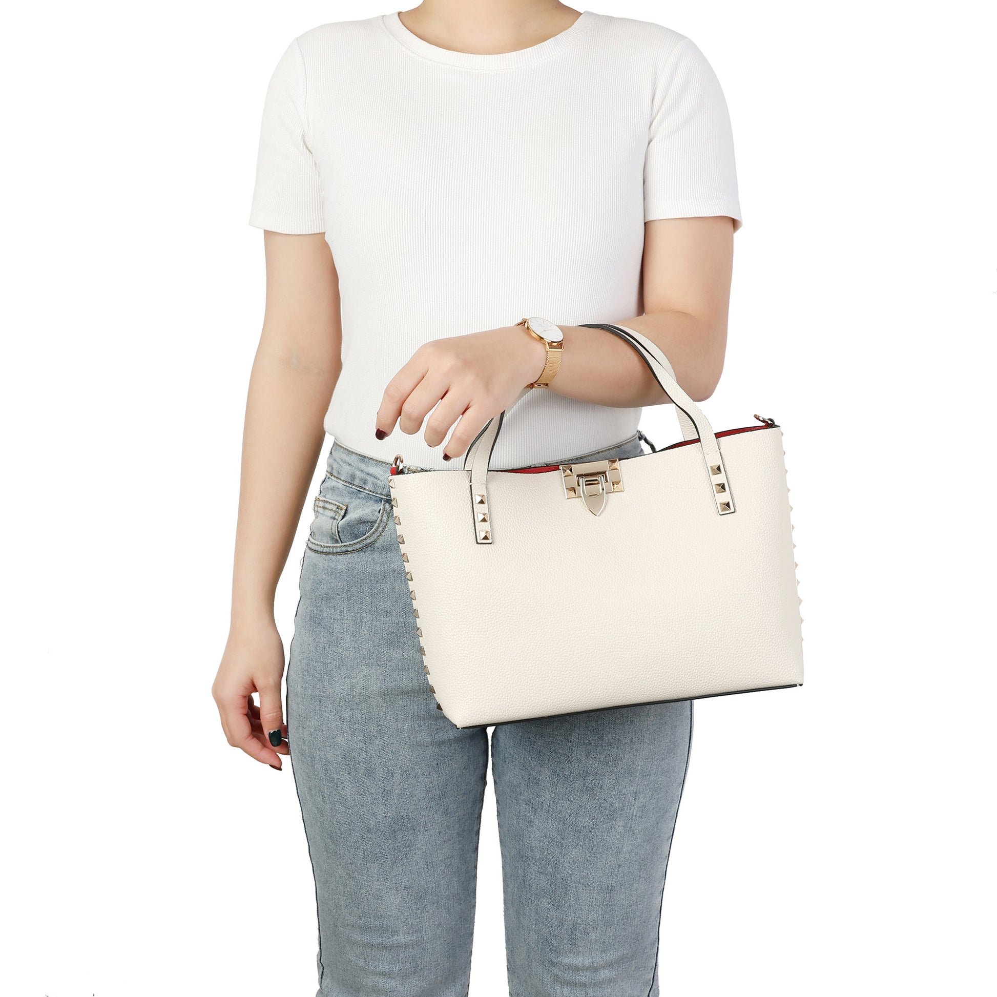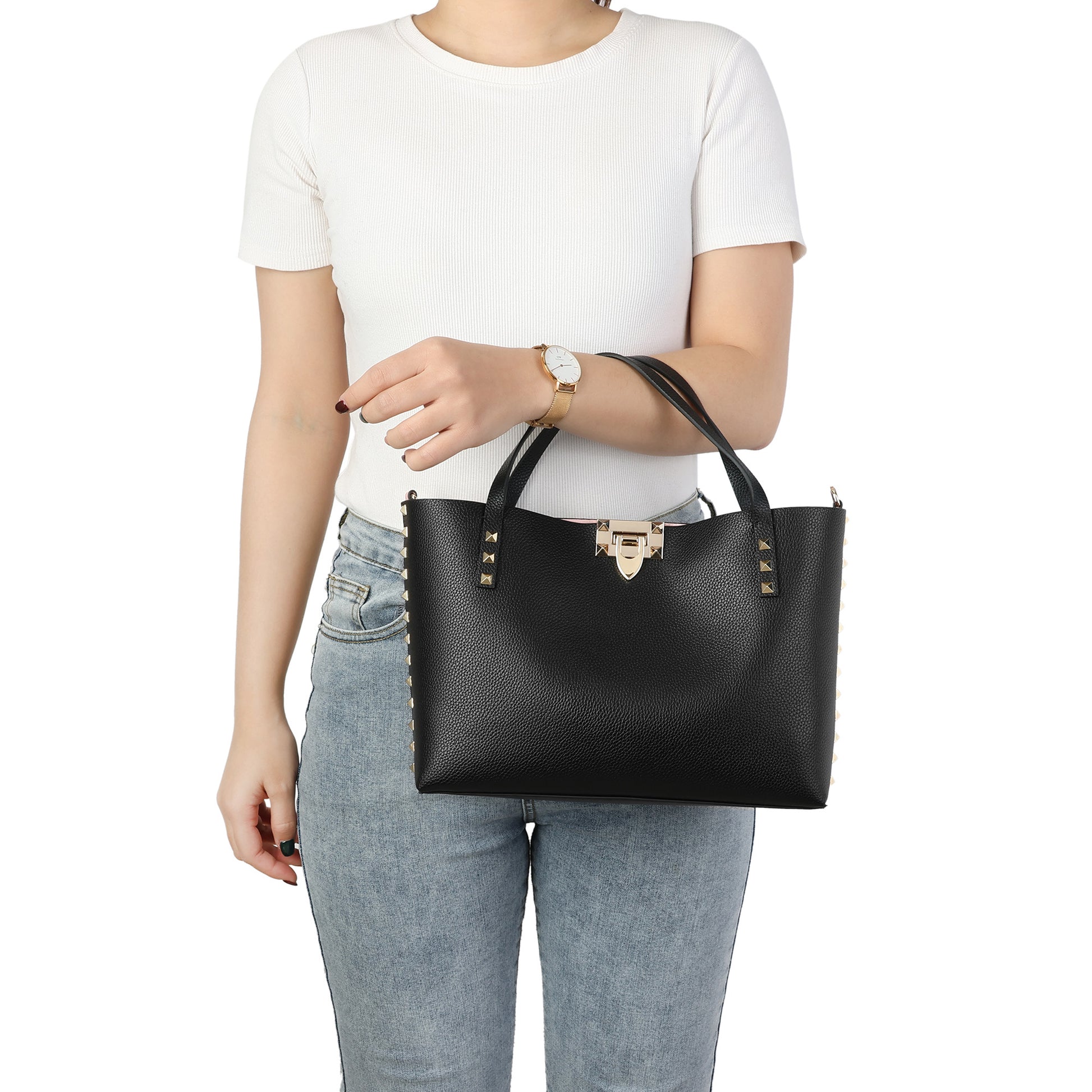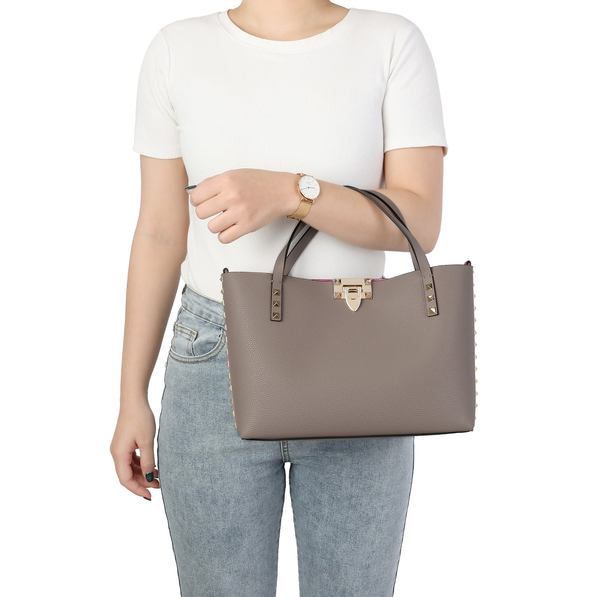 Crafted from premium textured leather, this bag features striking studded accents along the sides and handles, paired with a gold-tone lock closure for added charm. The spacious design is lined with vibrant contrasting fabric, creating a bold and stylish interior. Available in four stunning colors, this tote is designed to complement your everyday looks.