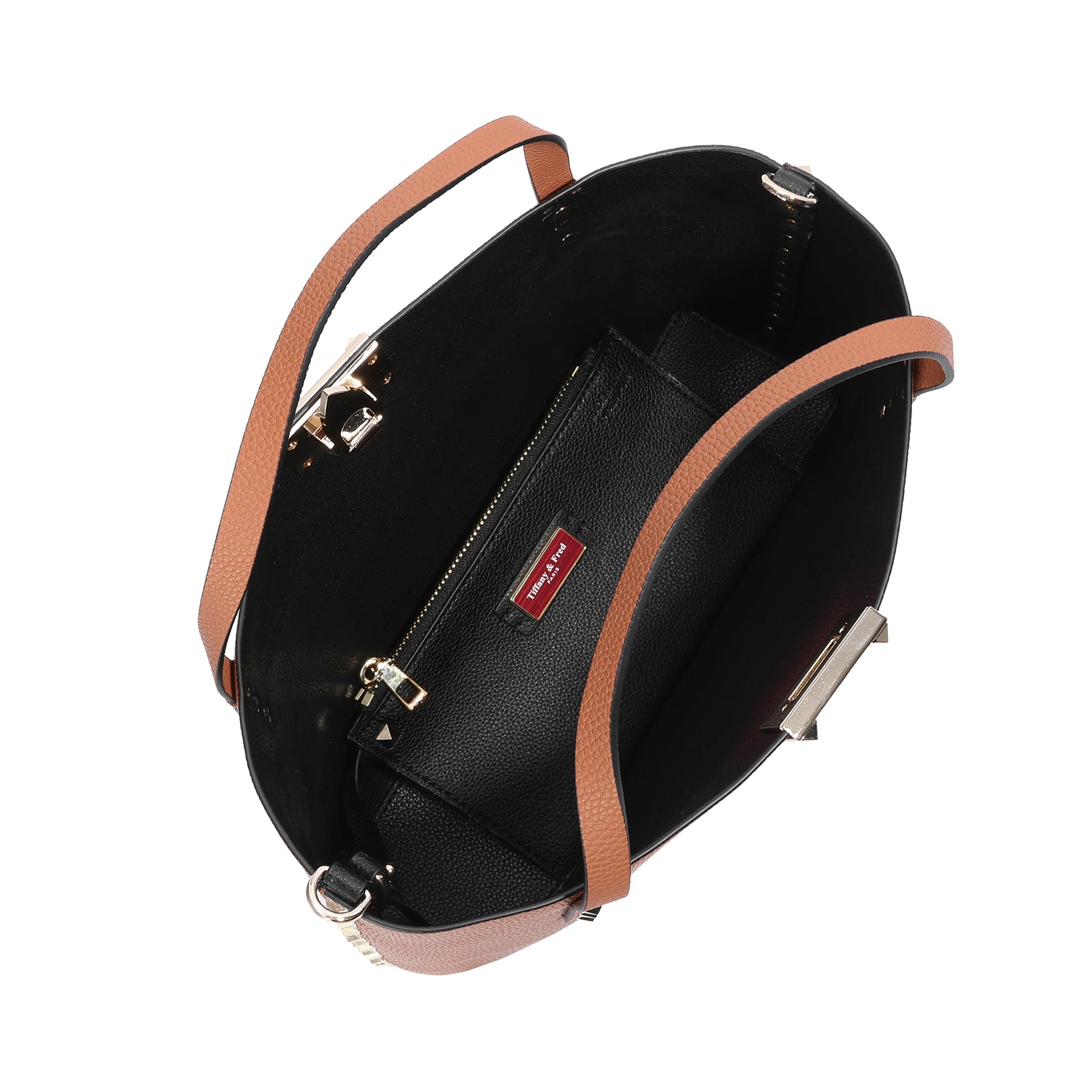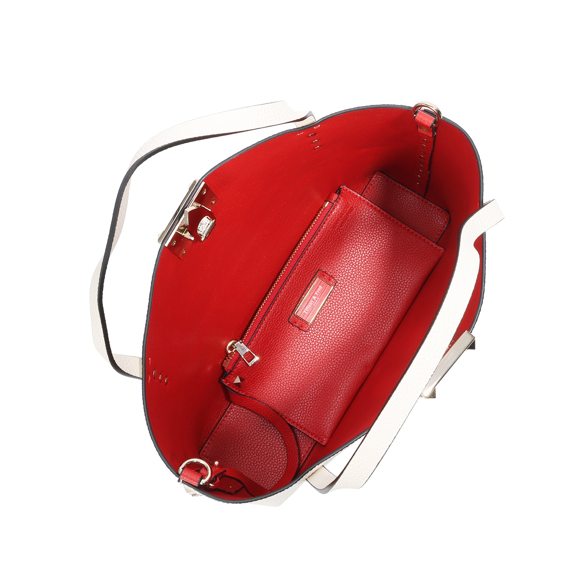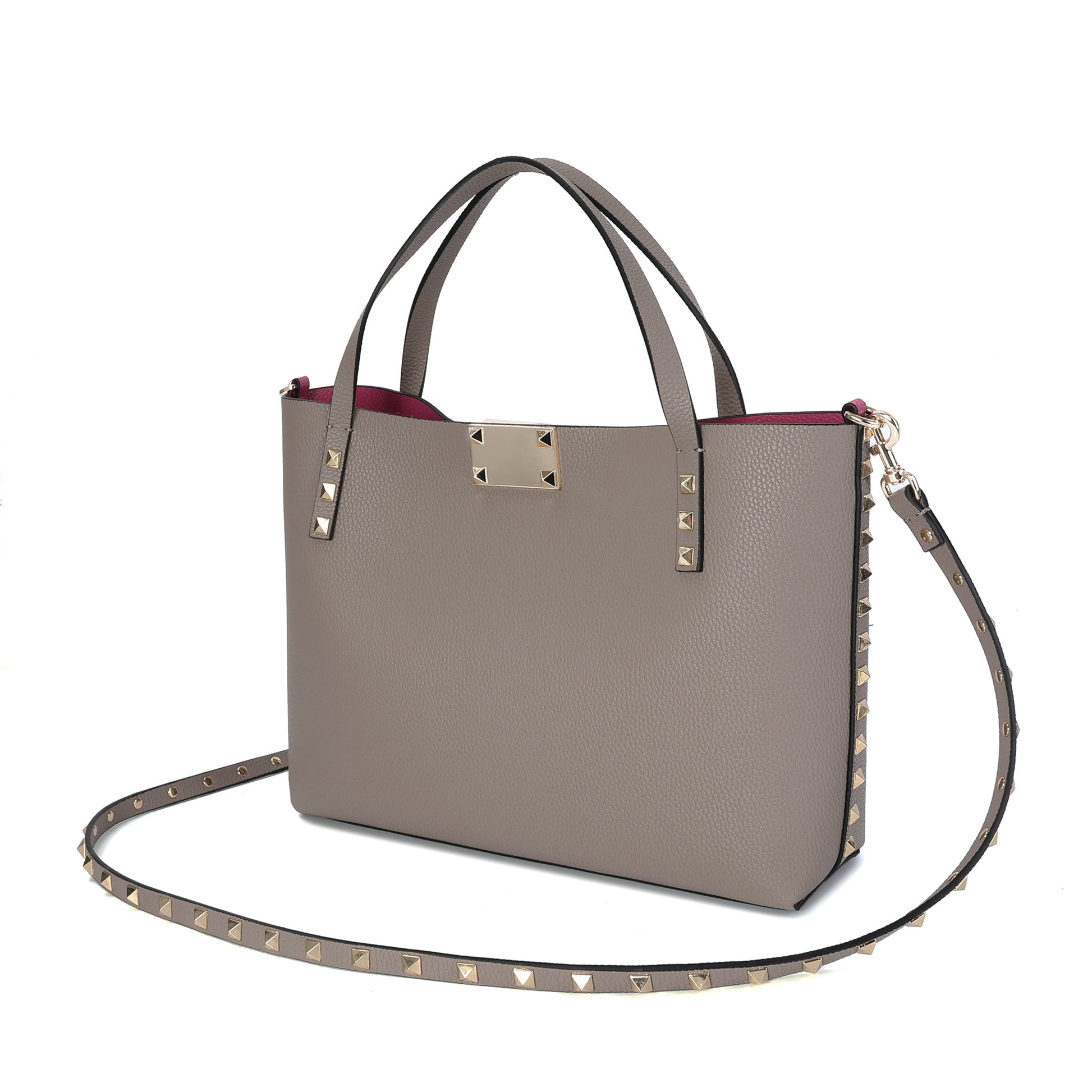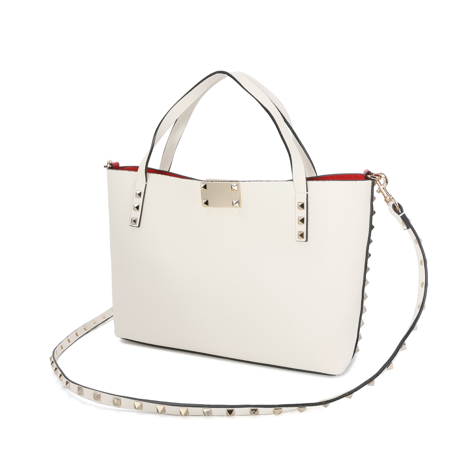 Crafted from premium textured leather, this bag features striking studded accents along the sides and handles, paired with a gold-tone lock closure for added charm. The spacious design is lined with vibrant contrasting fabric, creating a bold and stylish interior. Available in four stunning colors, this tote is designed to complement your everyday looks.