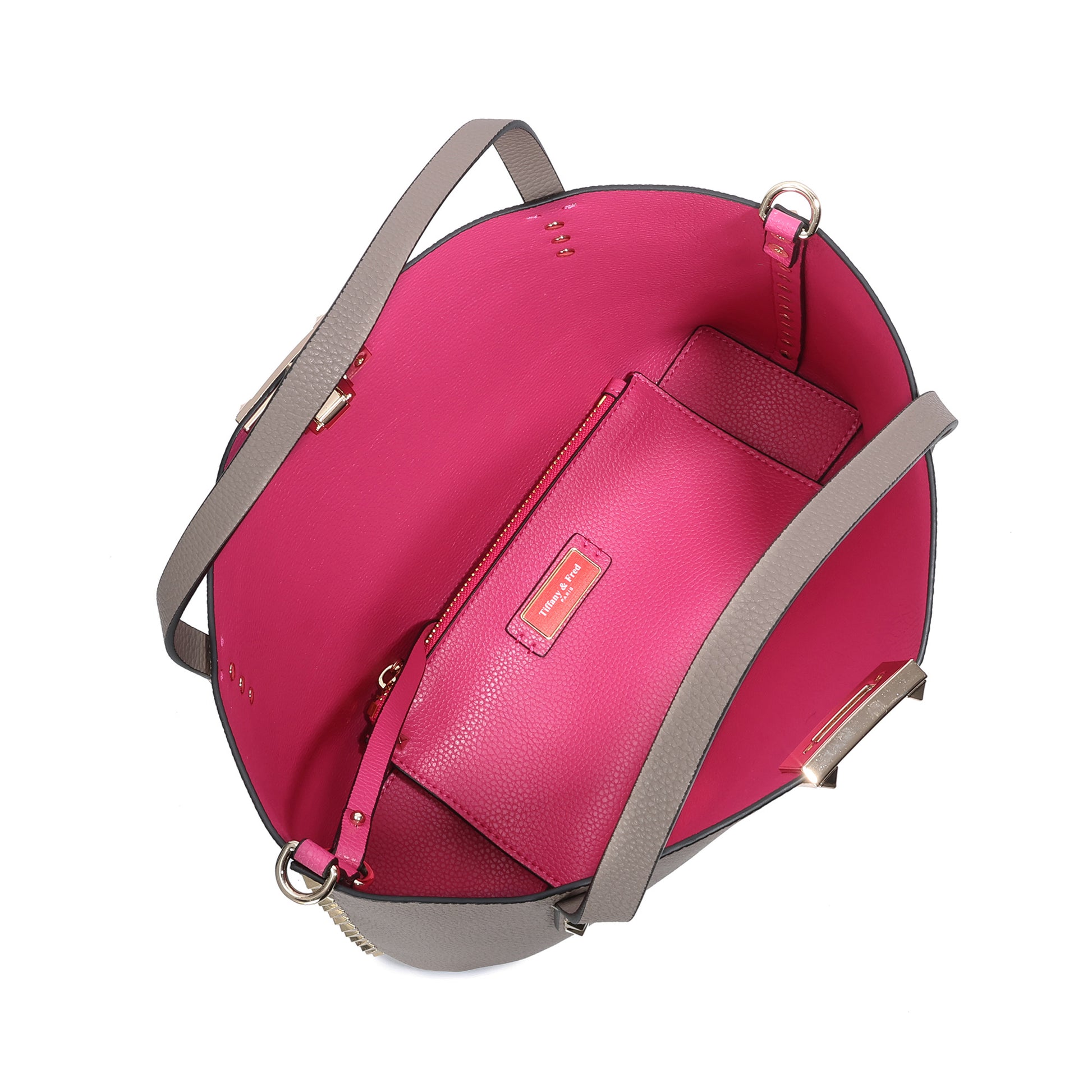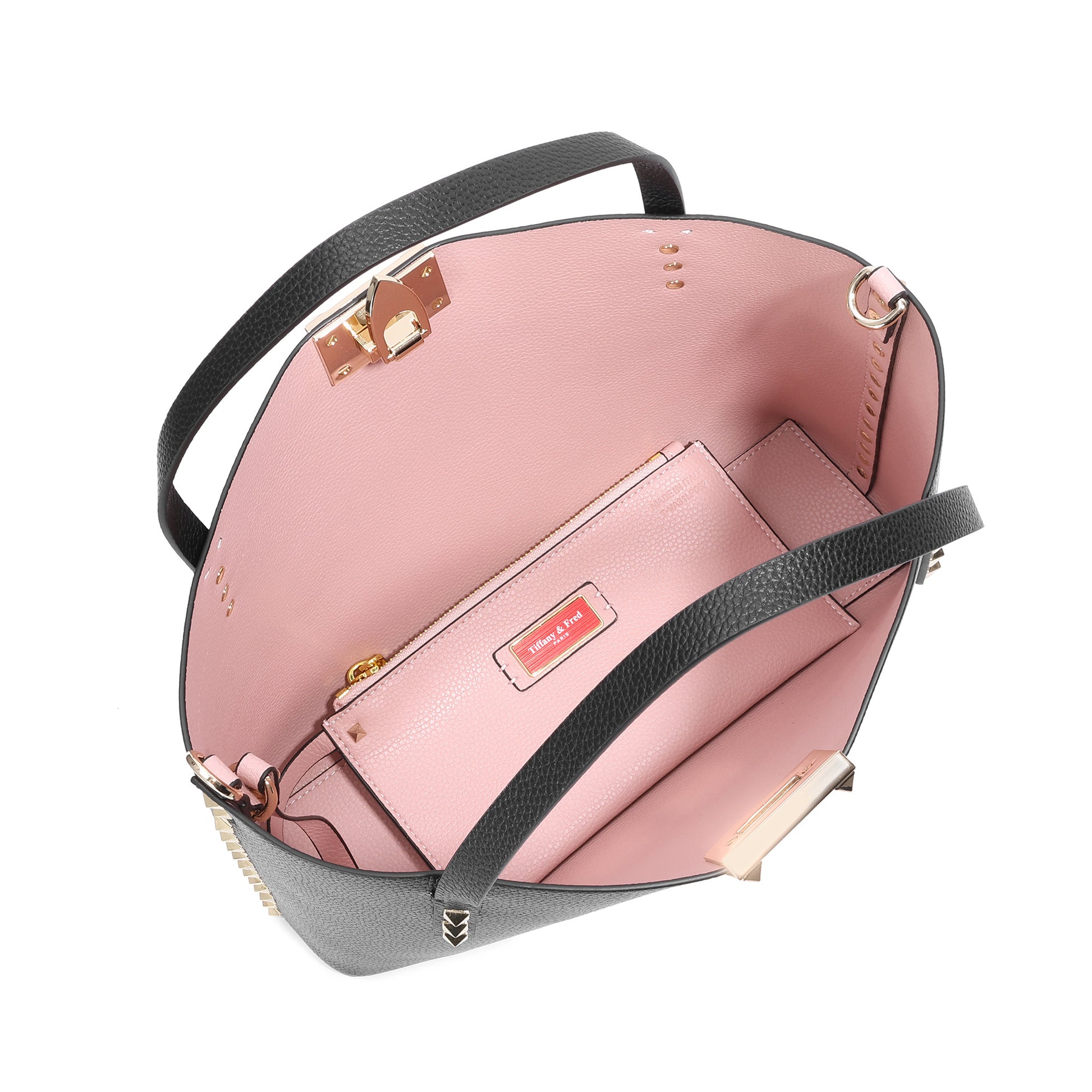 The interior includes a detachable zippered pouch to keep your essentials organized, while the open compartment offers plenty of space for larger items like your tablet or notebooks. The tote comes with sturdy top handles for hand carry and a detachable studded shoulder strap for hands-free convenience.