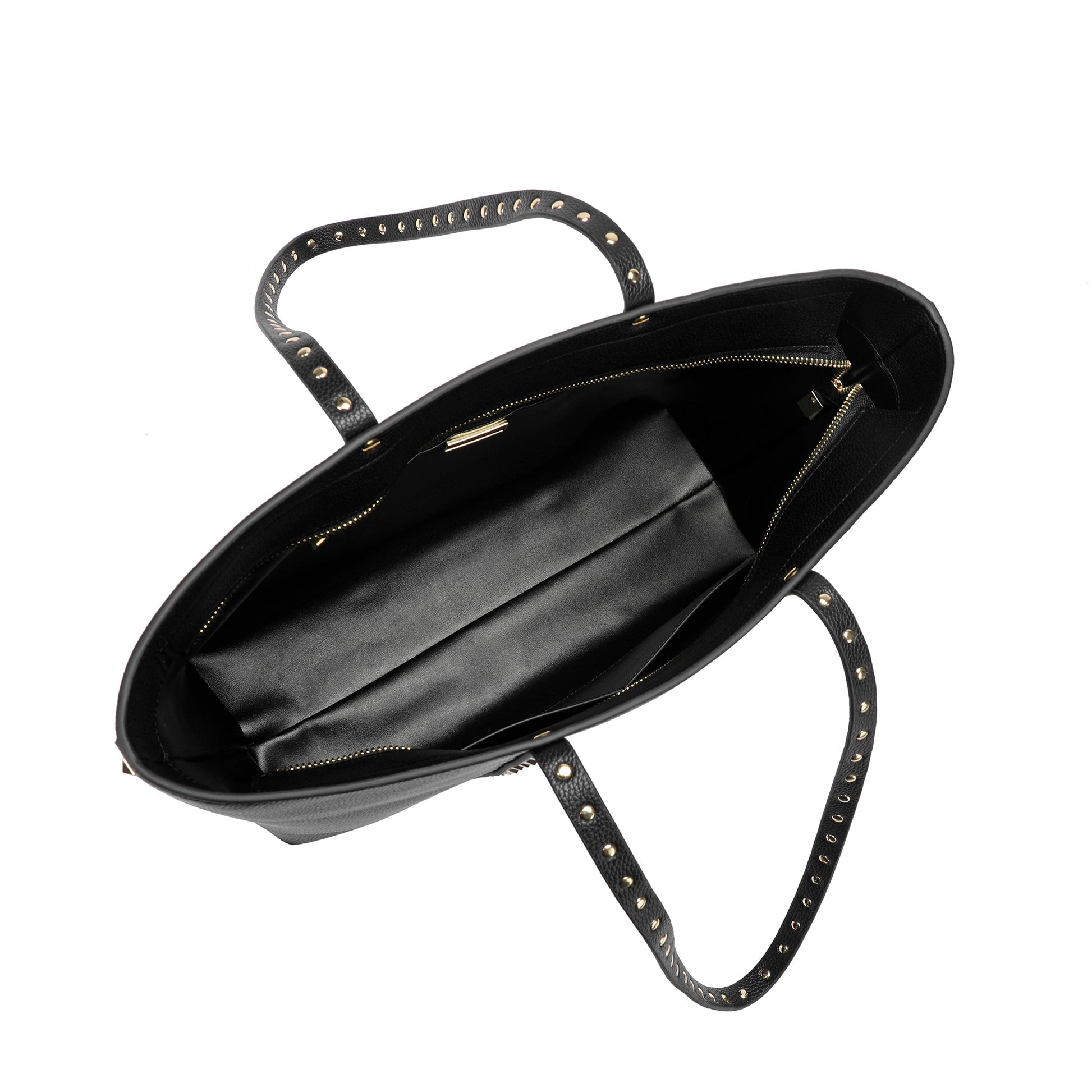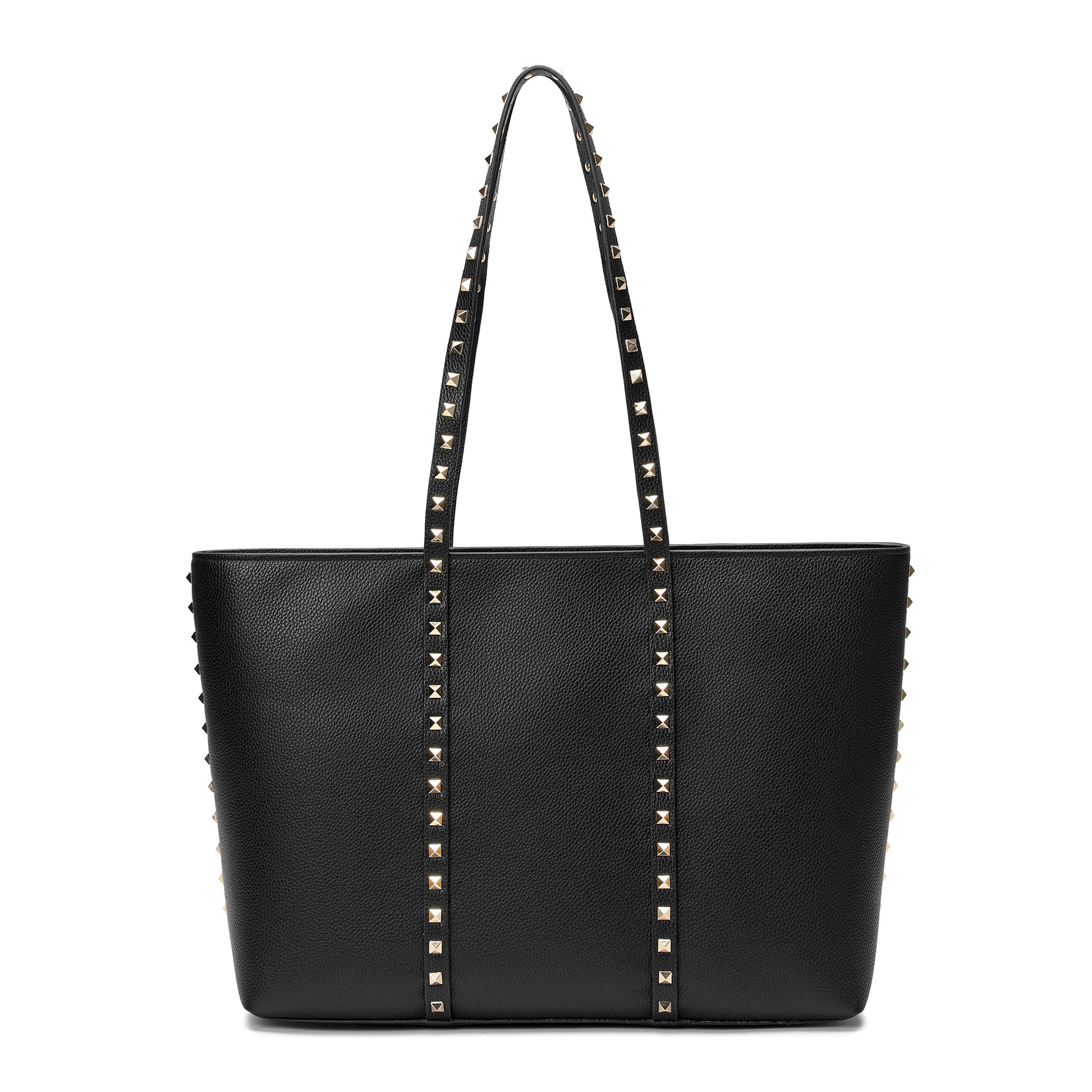 The tote is fully lined and includes a secure zippered pocket, making it easy to keep your essentials organized. Its long, studded shoulder straps allow for comfortable carry, whether you’re heading to the office or a weekend outing.