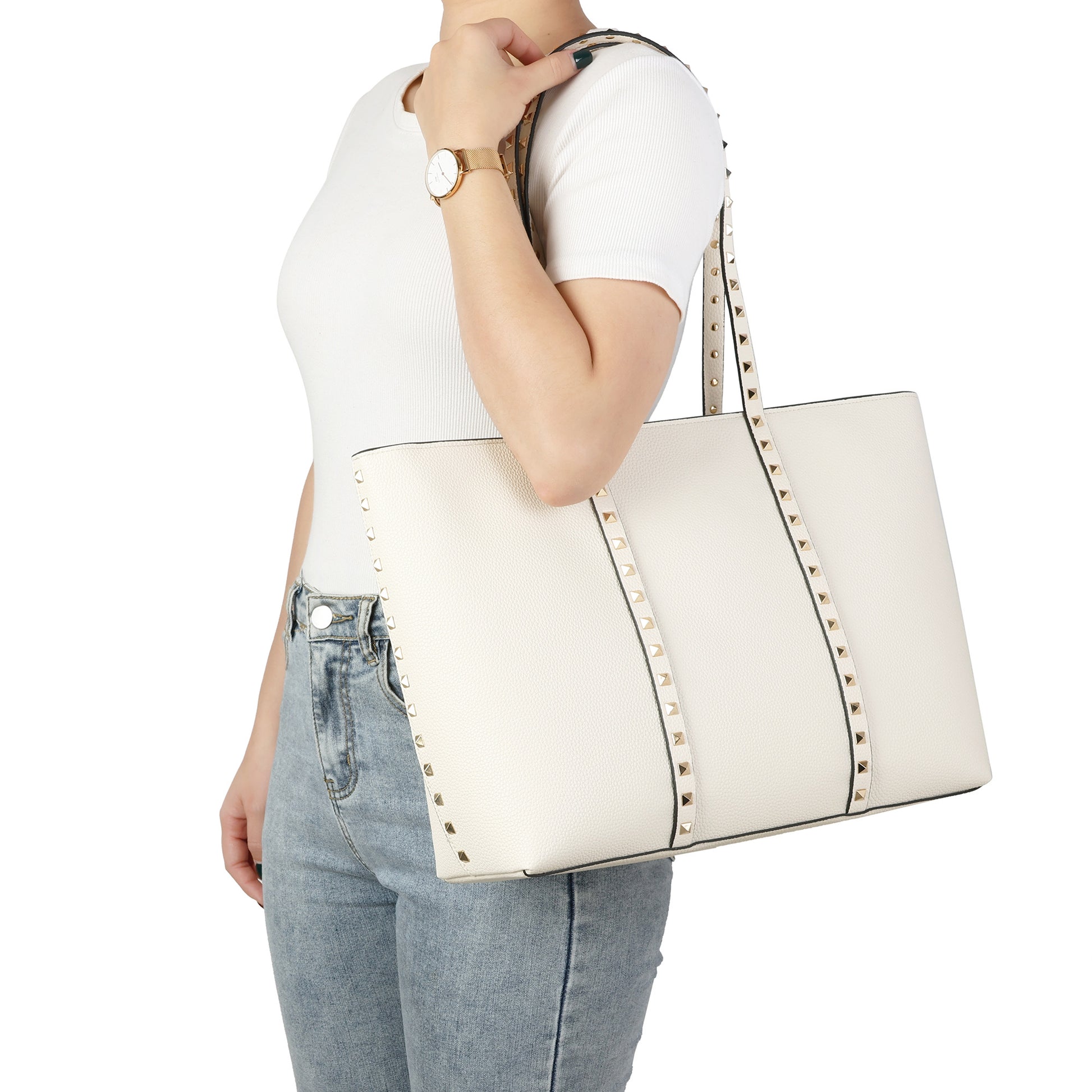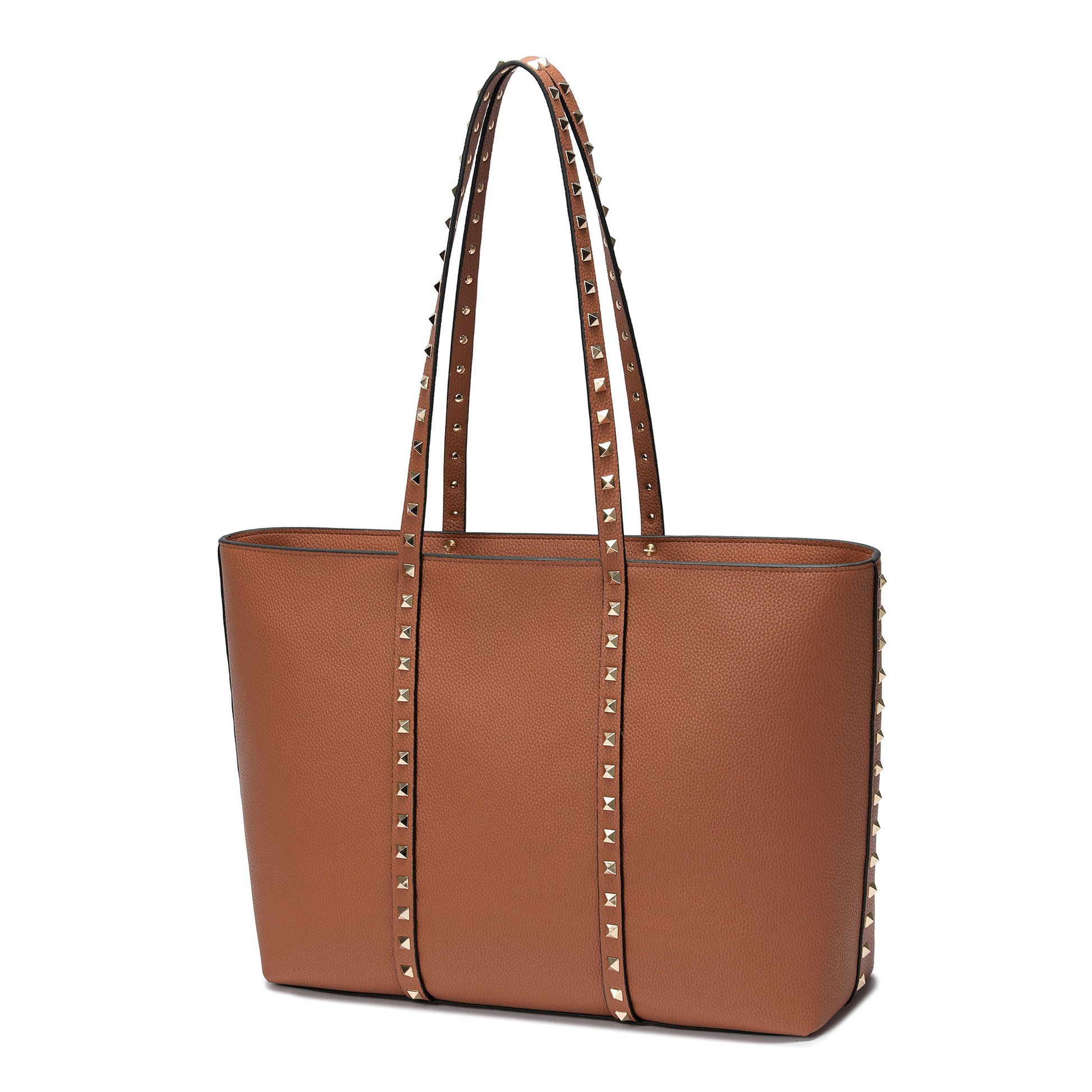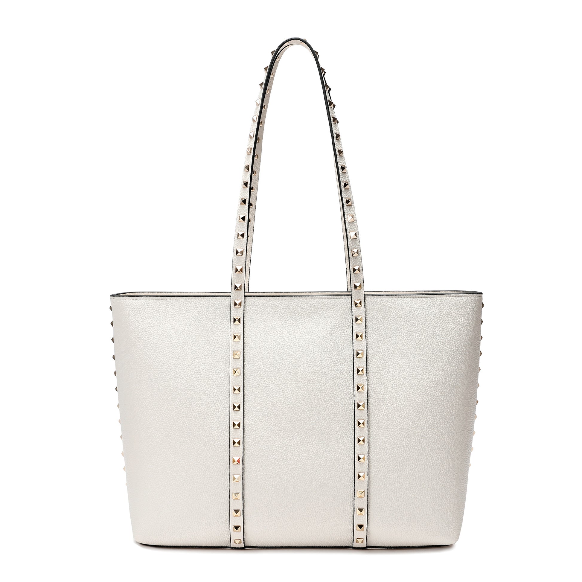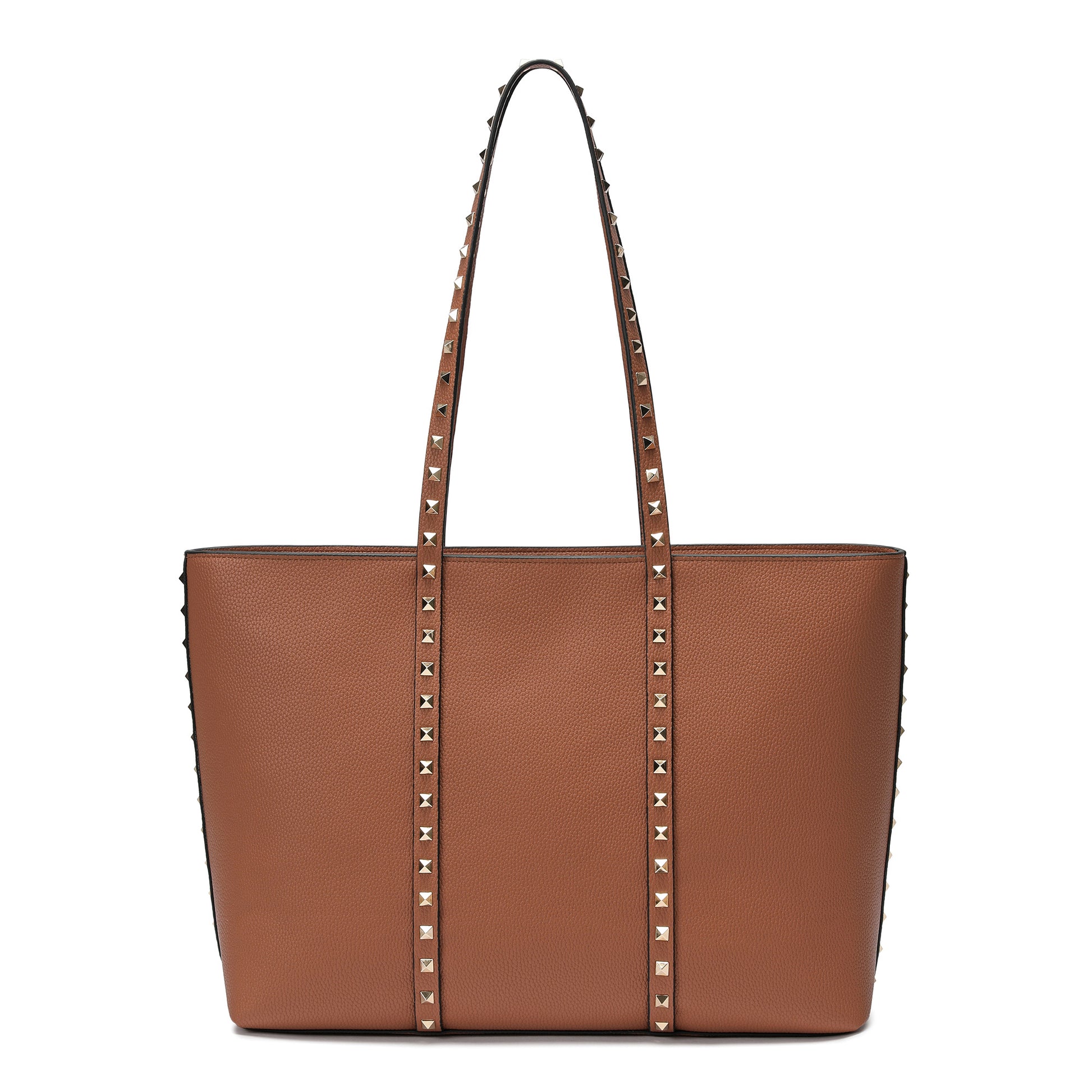 Crafted from premium textured leather, this bag features eye-catching studded accents along the handles and sides for a touch of edgy sophistication. The spacious design, available in four versatile colors: Black, Caramel, Khaki, and White, provides ample storage while maintaining a sleek silhouette.