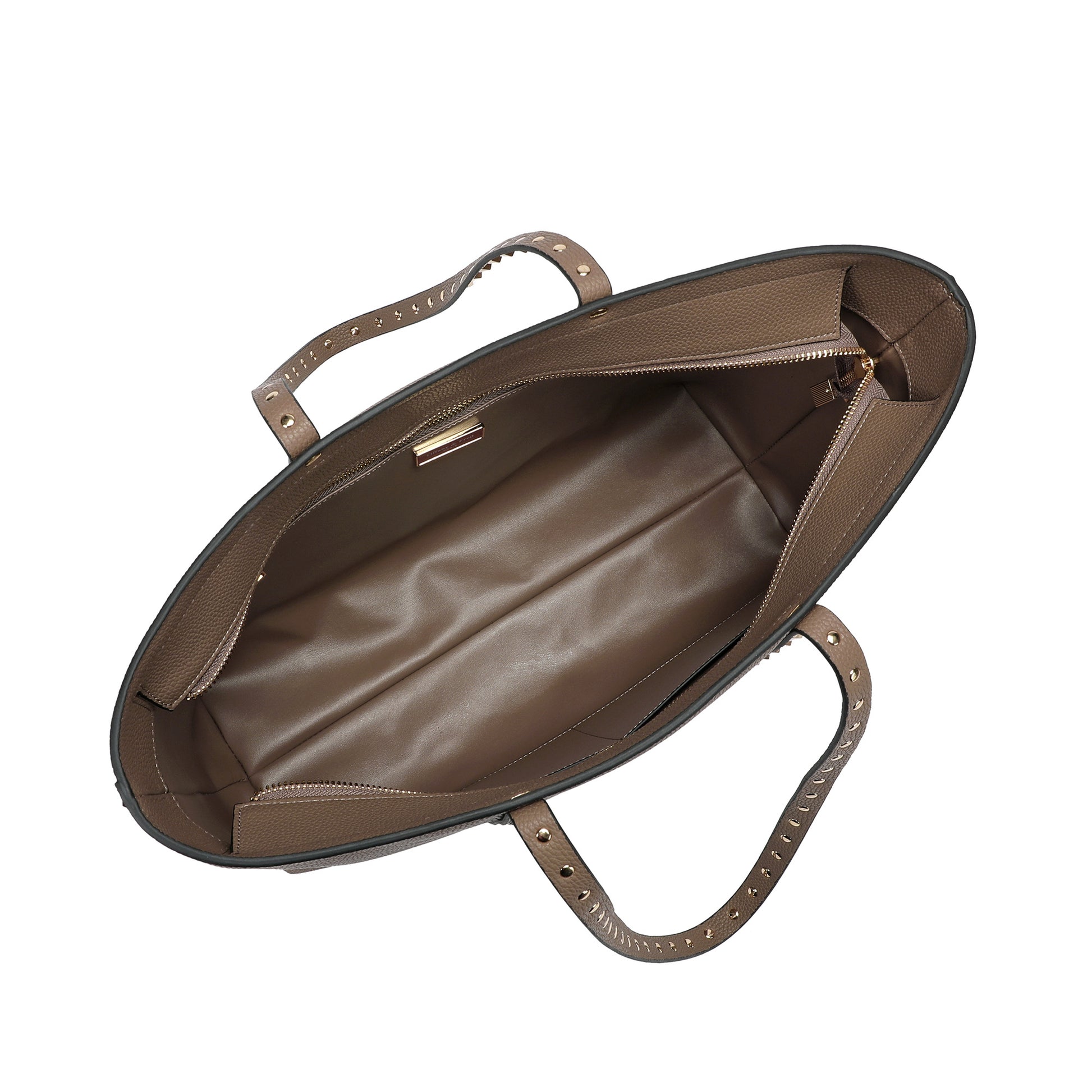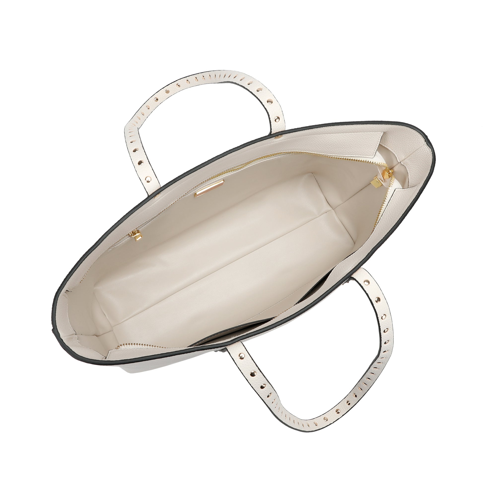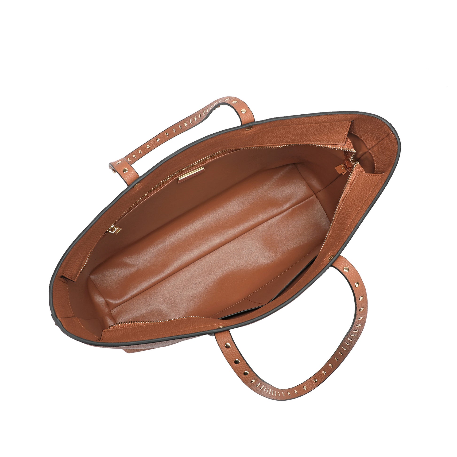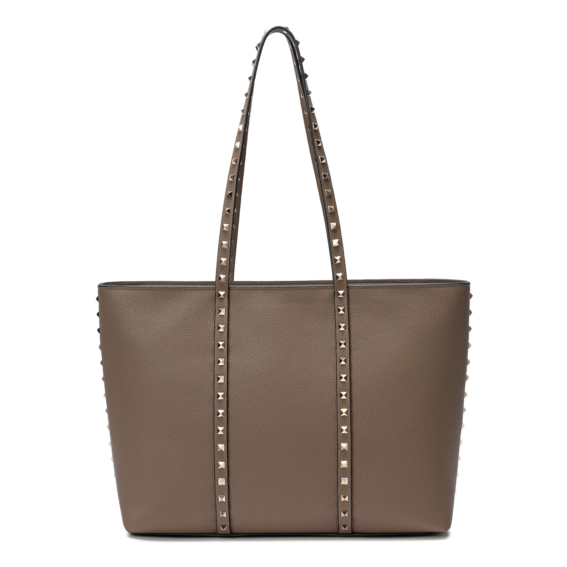 Crafted from premium textured leather, this bag features eye-catching studded accents along the handles and sides for a touch of edgy sophistication. The spacious design, available in four versatile colors: Black, Caramel, Khaki, and White, provides ample storage while maintaining a sleek silhouette.