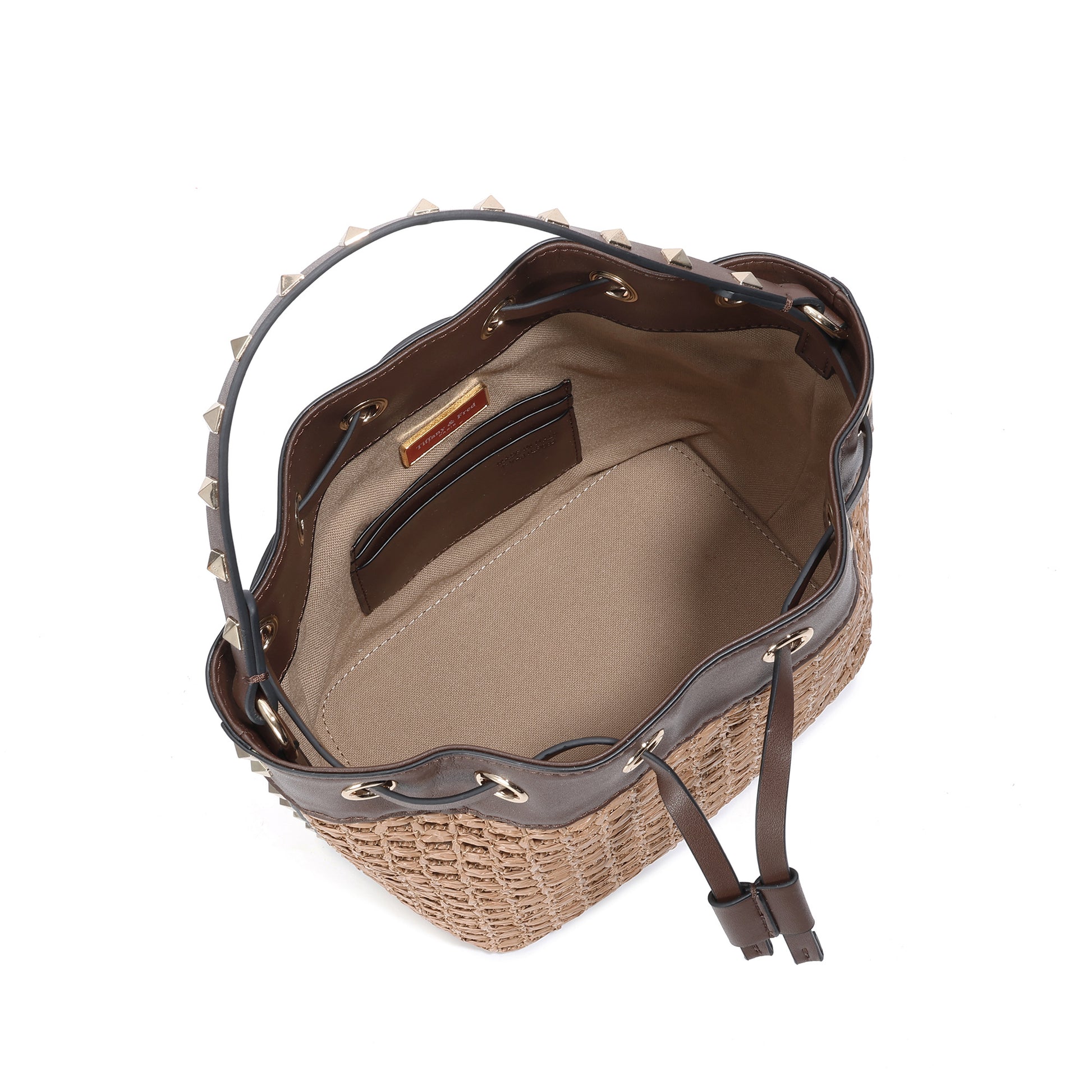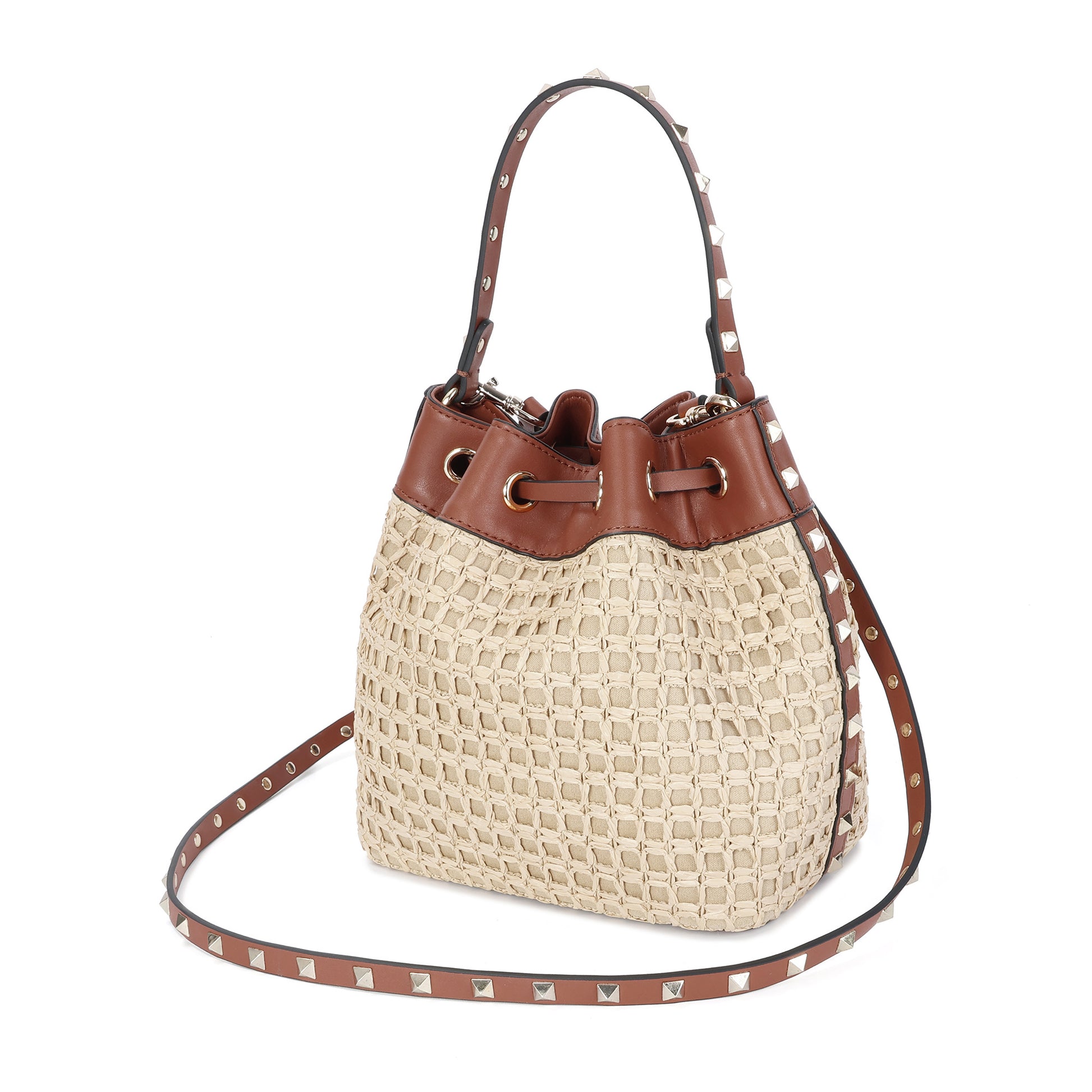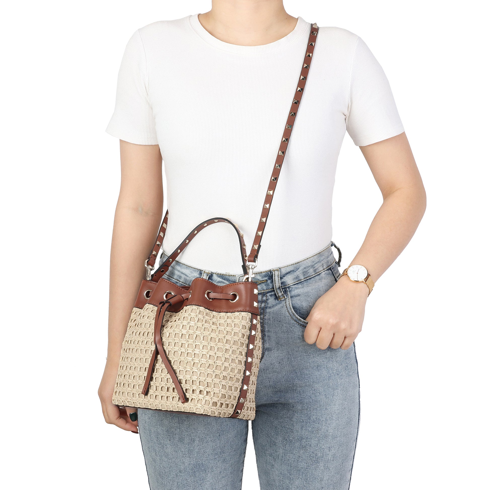 This stylish bucket bag is crafted from woven raffia enhanced with luxurious leather accents and edgy studded details. Designed with a drawstring closure, a sturdy top handle, and a detachable crossbody strap, it offers both style and versatility. The spacious interior includes an open pocket for convenient organization, making it ideal for everyday use or weekend outings.