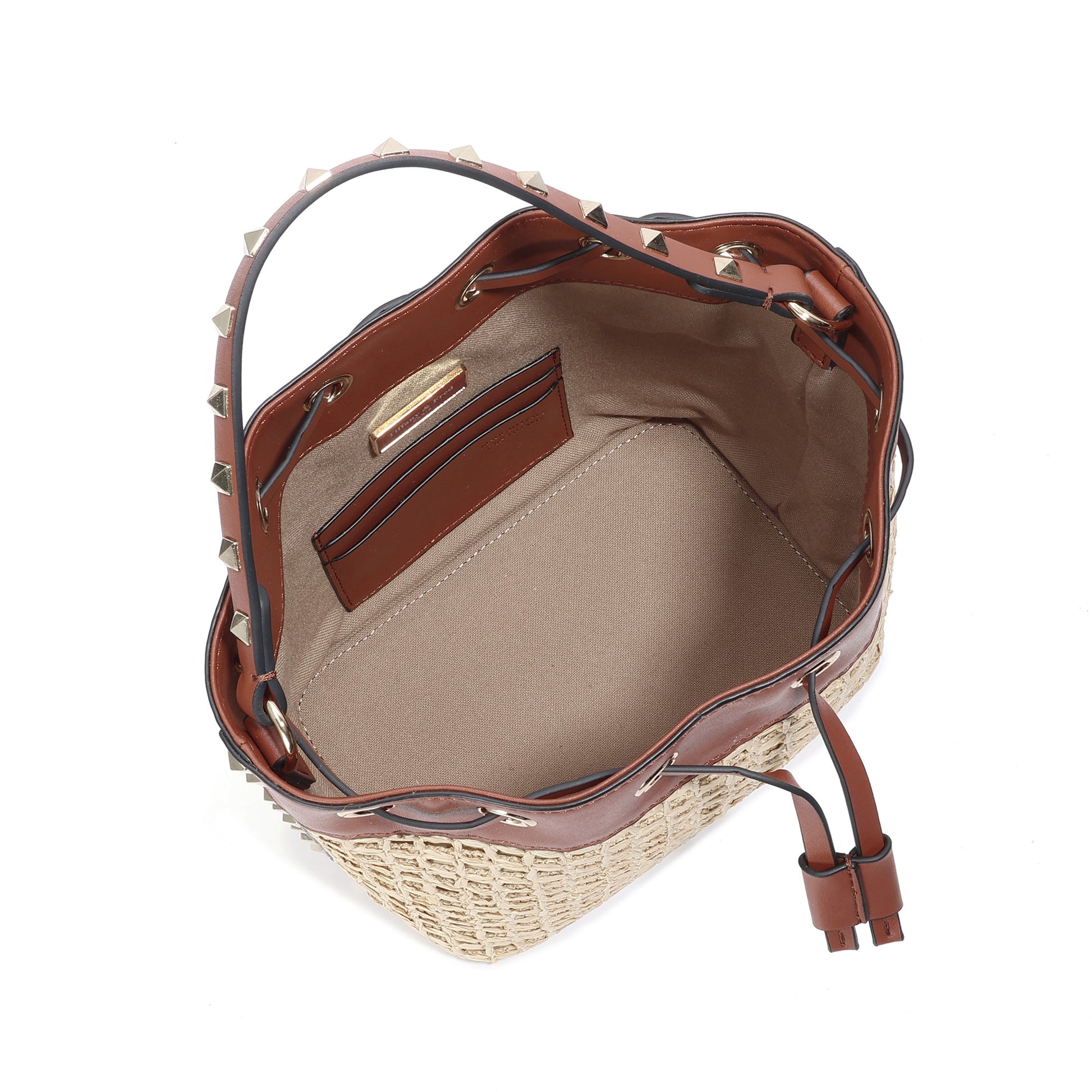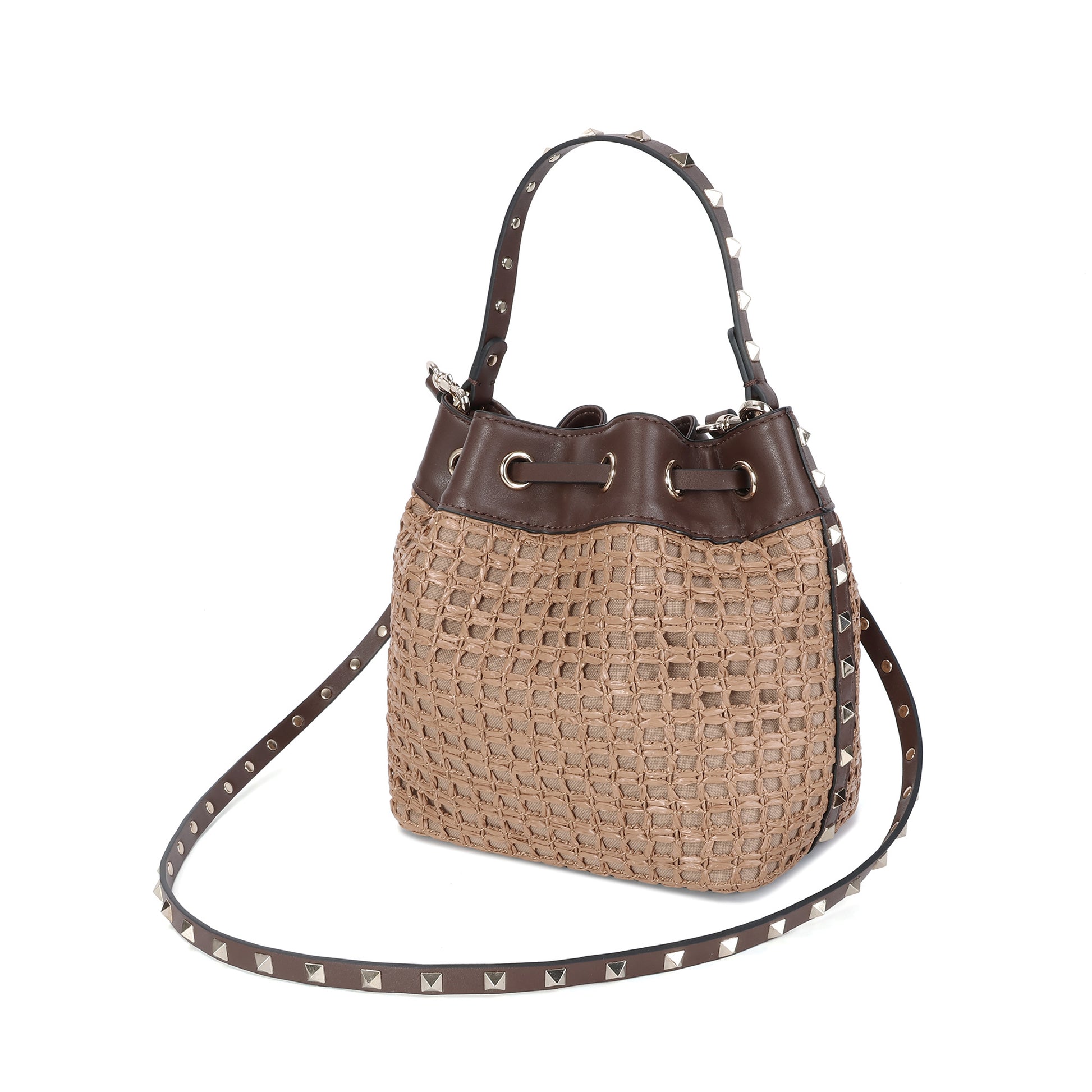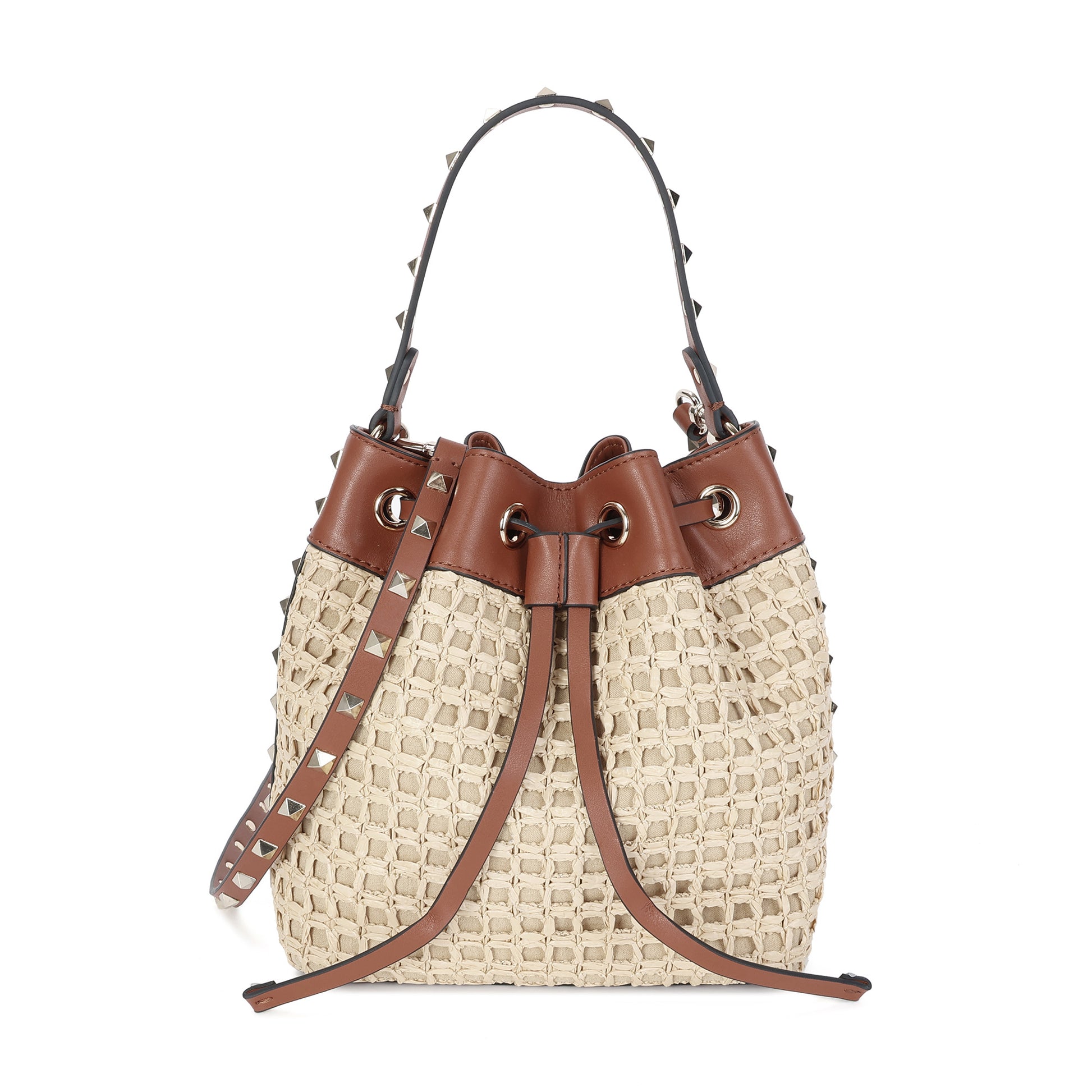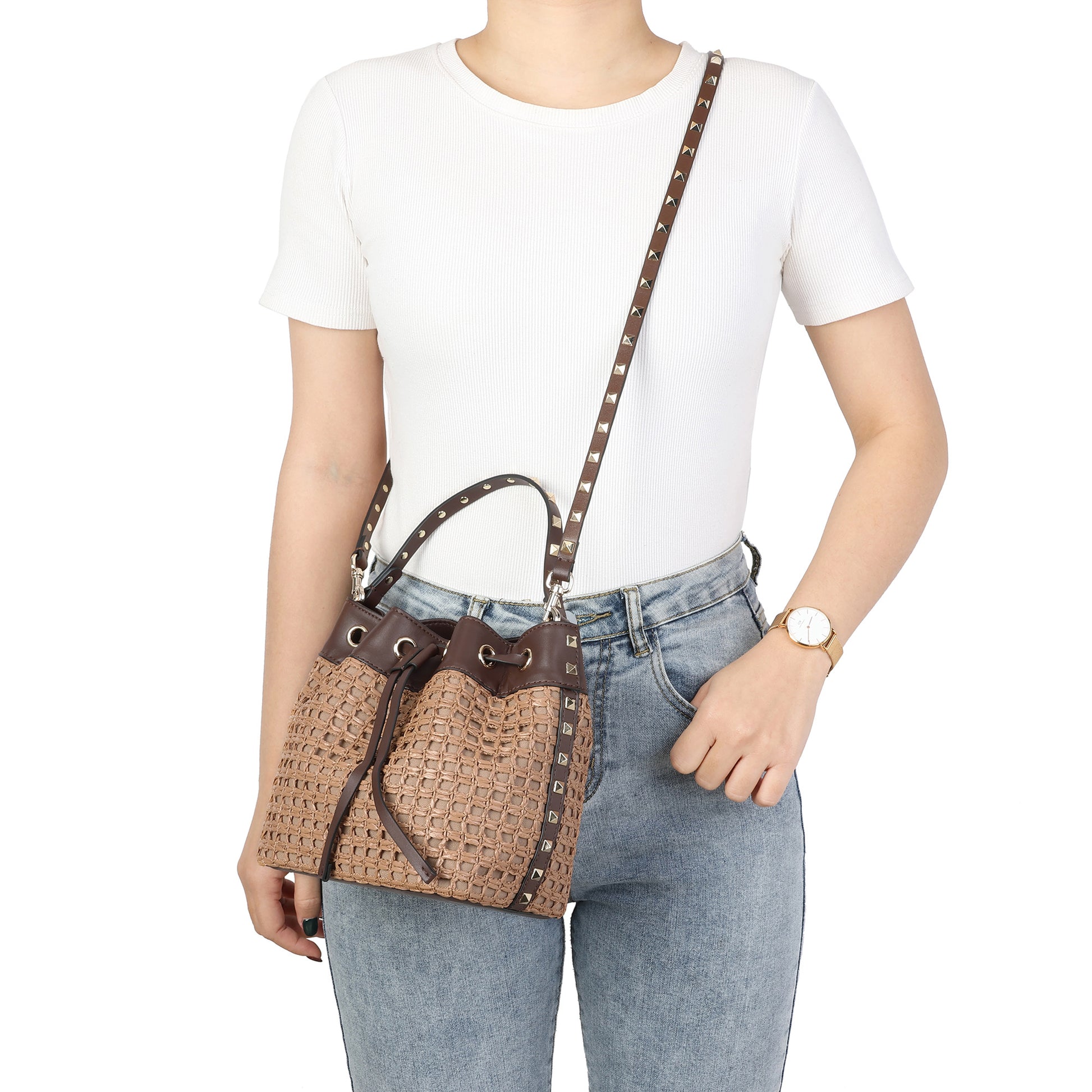 This stylish bucket bag is crafted from woven raffia enhanced with luxurious leather accents and edgy studded details. Designed with a drawstring closure, a sturdy top handle, and a detachable crossbody strap, it offers both style and versatility. The spacious interior includes an open pocket for convenient organization, making it ideal for everyday use or weekend outings.