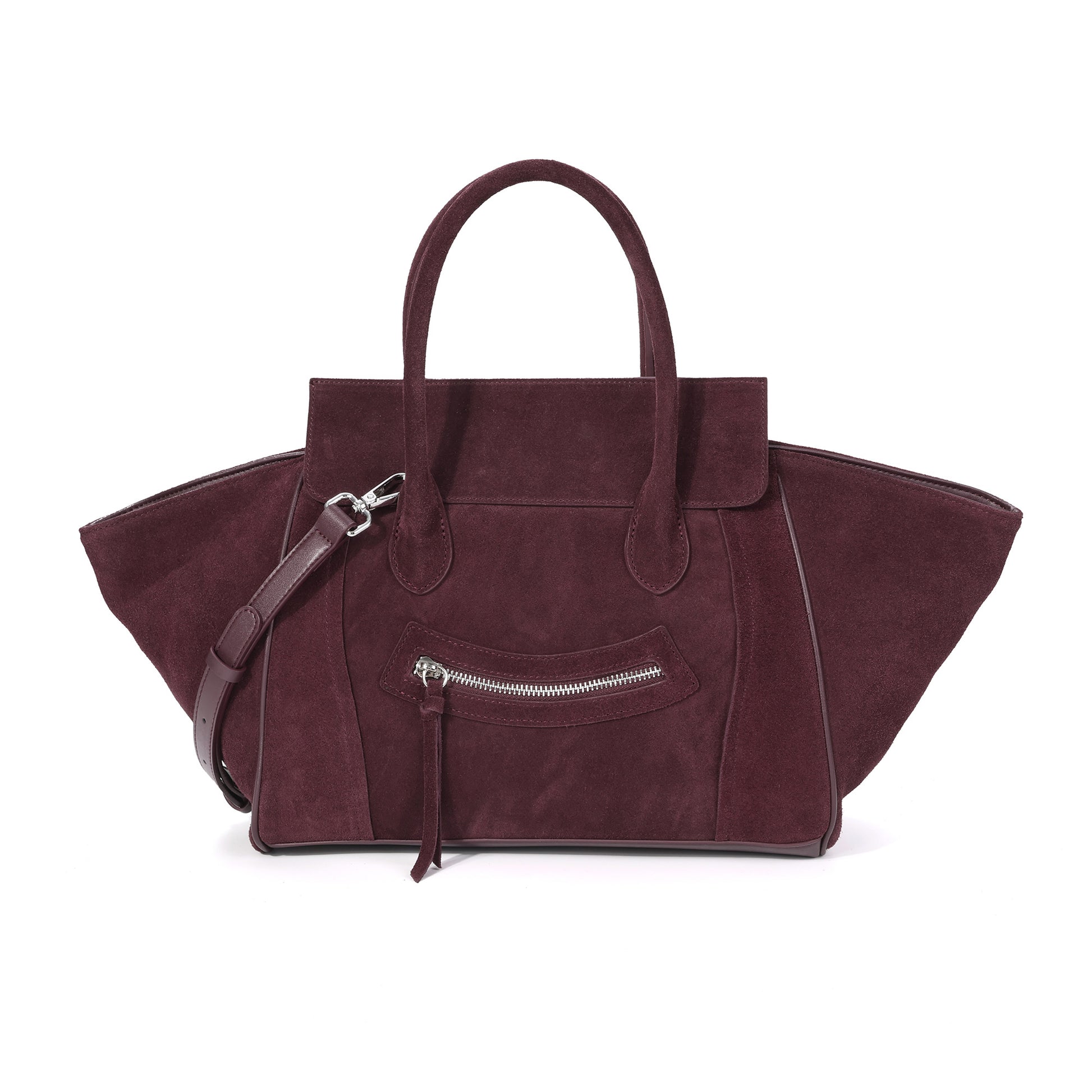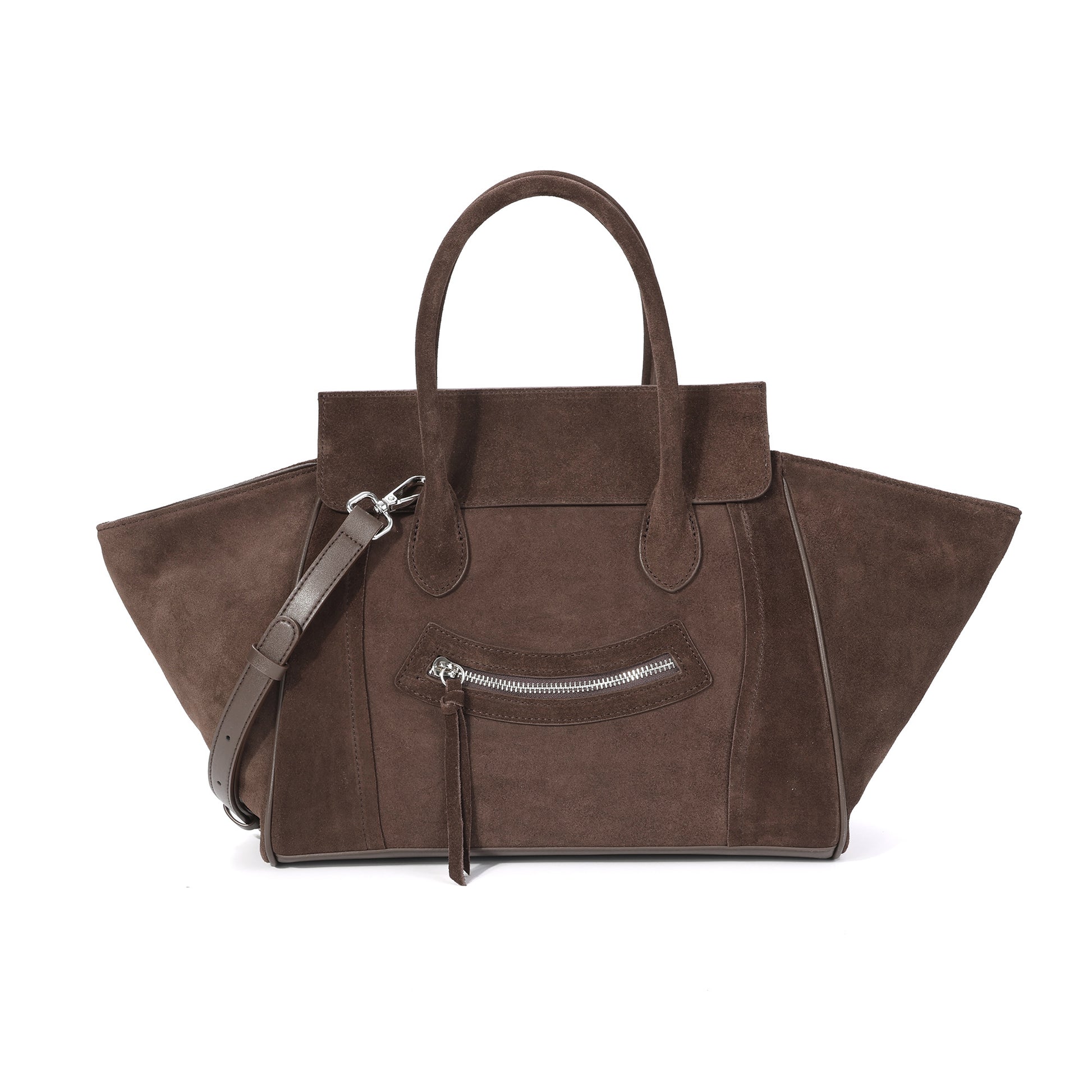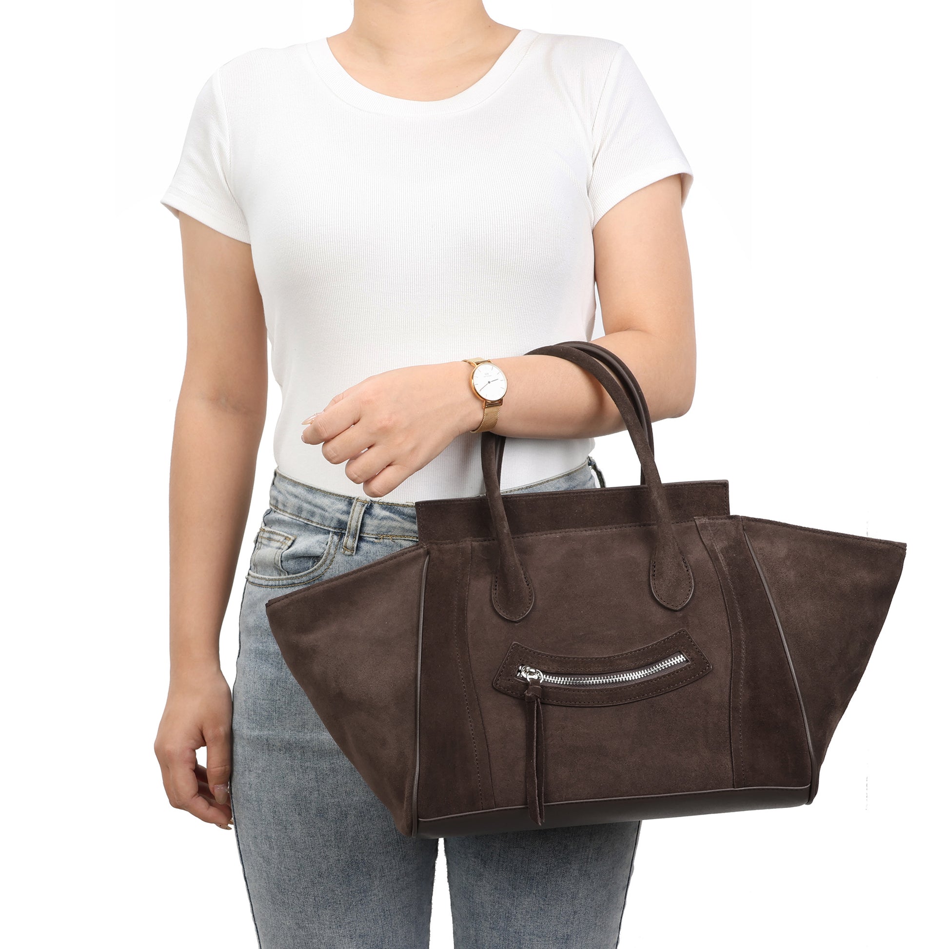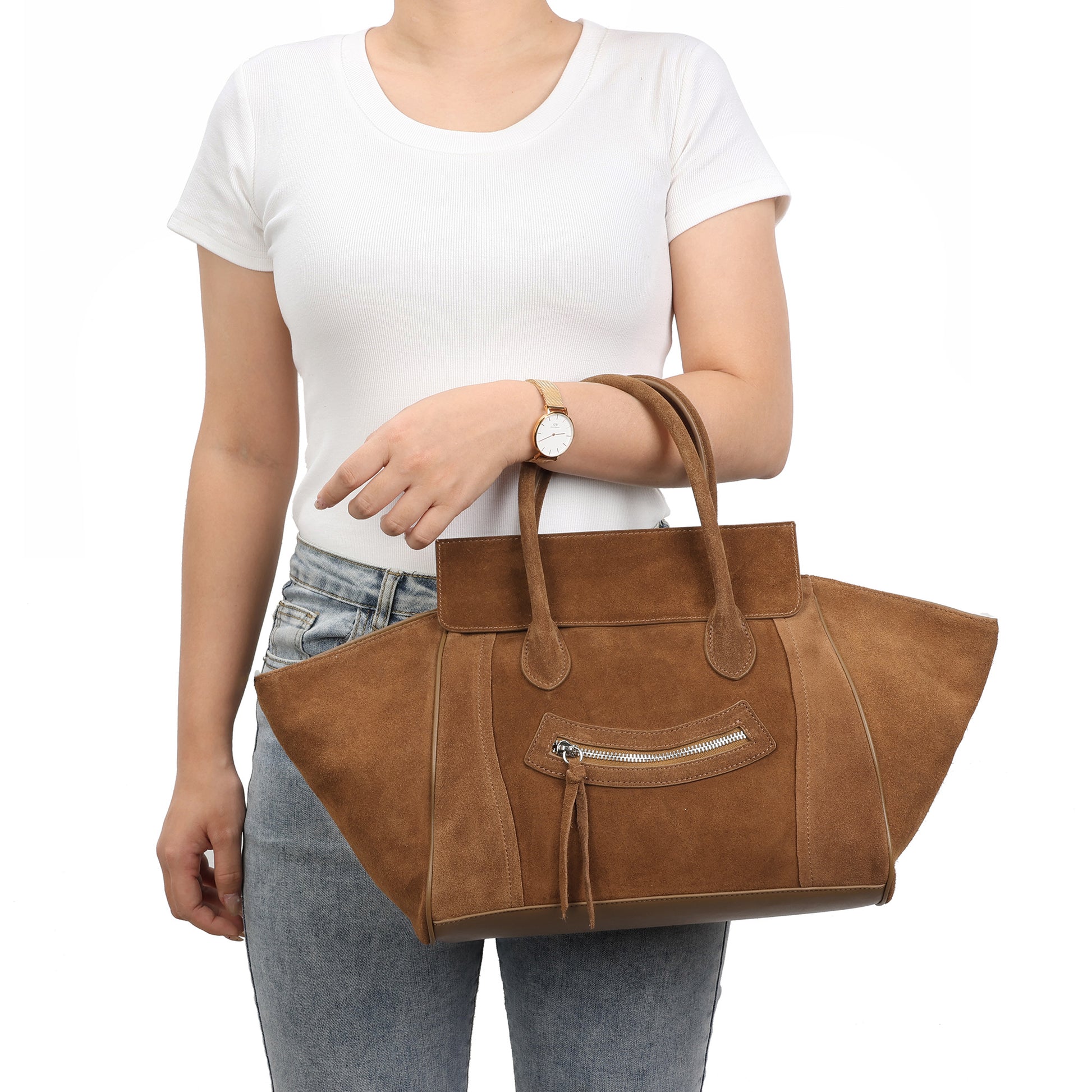 Suede and Leather Winged Tote Bag with Front Zip Pocket