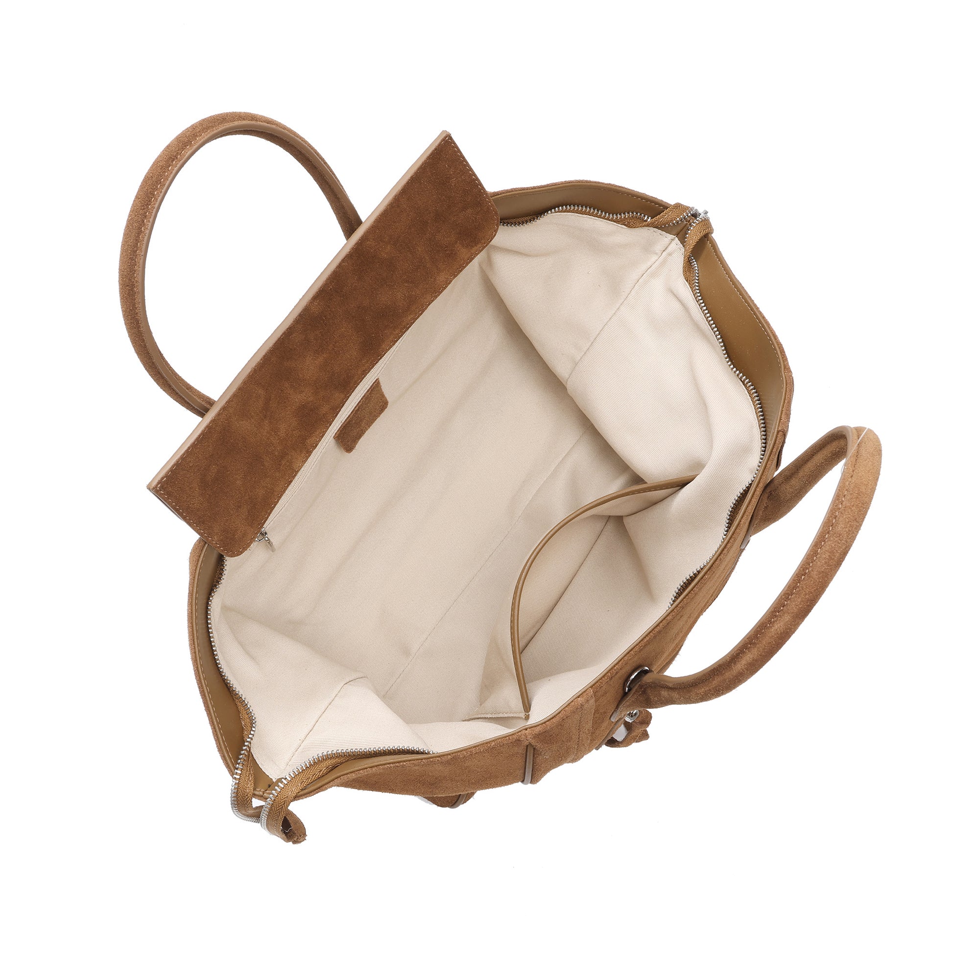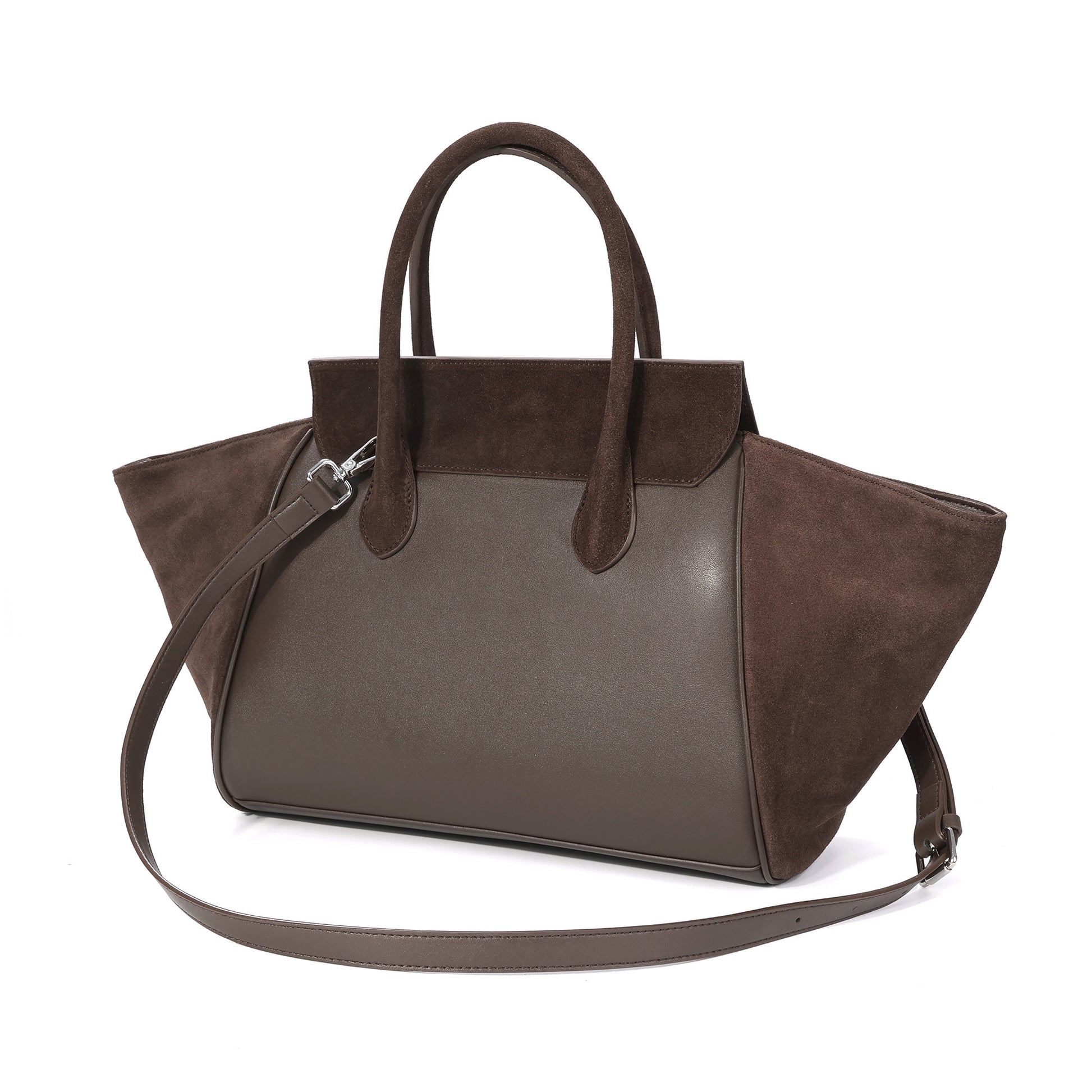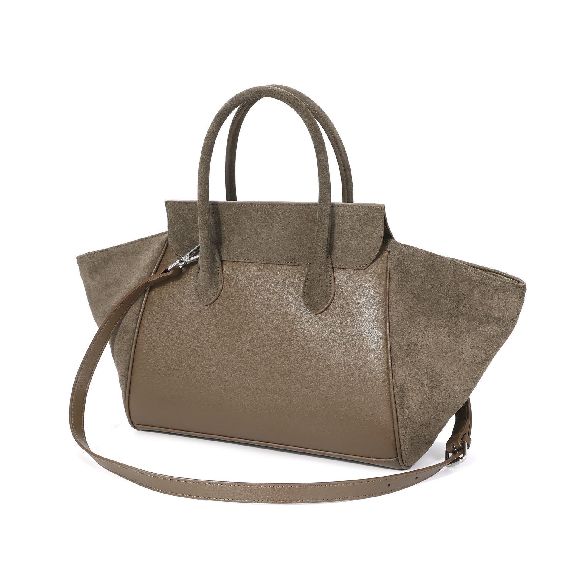 A refined blend of structure and softness, this winged tote reimagines everyday elegance with modern proportions. Crafted from a combination of smooth leather and velvety suede panels, it features a distinctive winged silhouette that expands for extra room and adds a sculptural touch. The front zip pocket and minimal top flap keep the look sleek while providing functional access on the go.