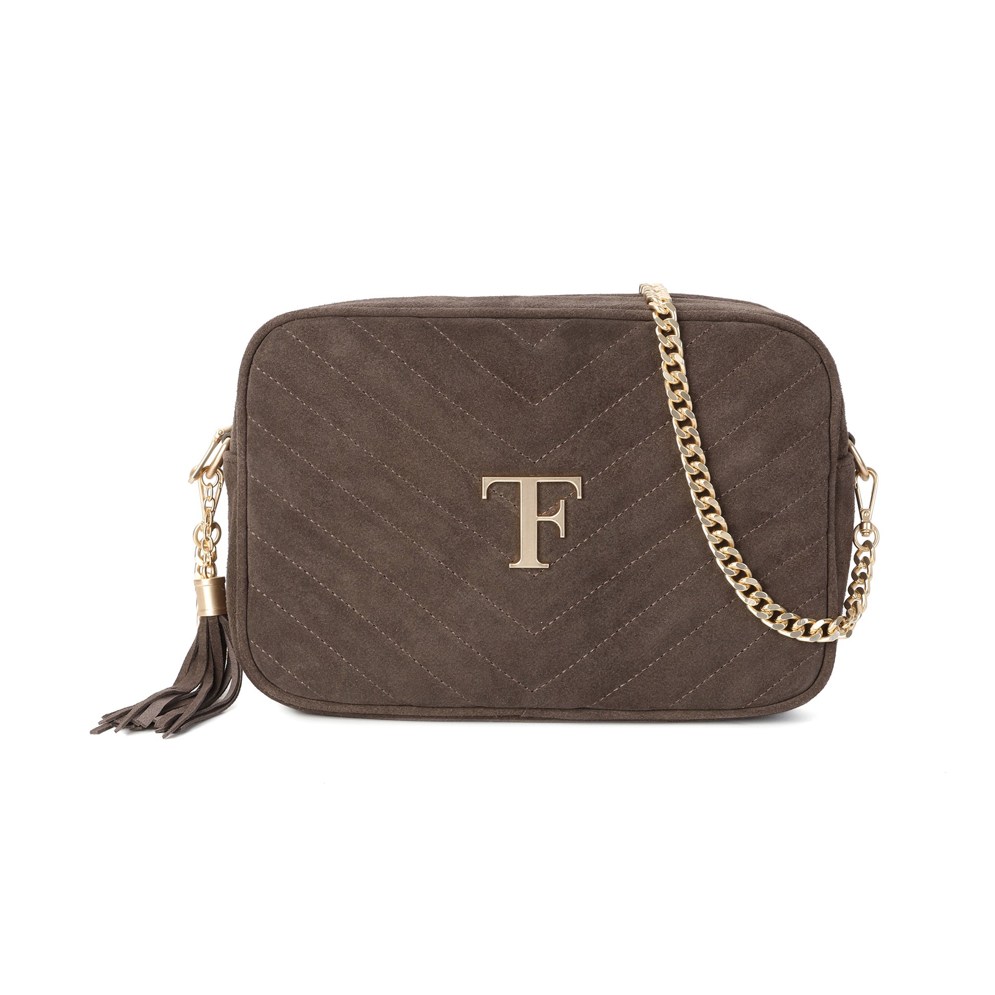 Soft chevron-quilted suede construction with a structured camera-bag silhouette. Features a front gold TF emblem, gold-tone hardware, and a suede tassel zipper pull. Includes a chain-and-leather crossbody strap.