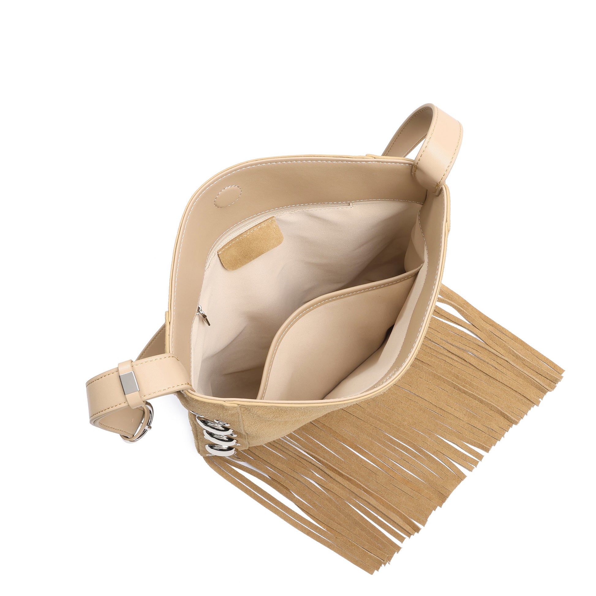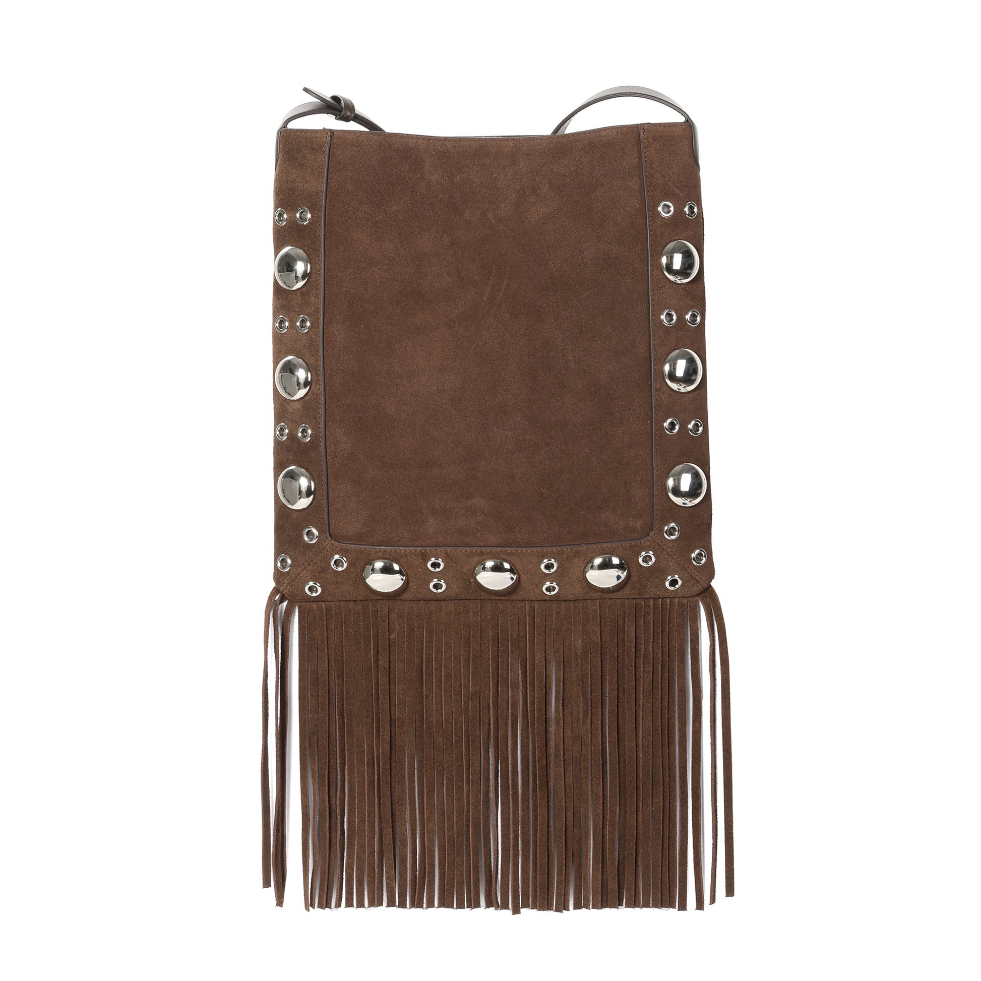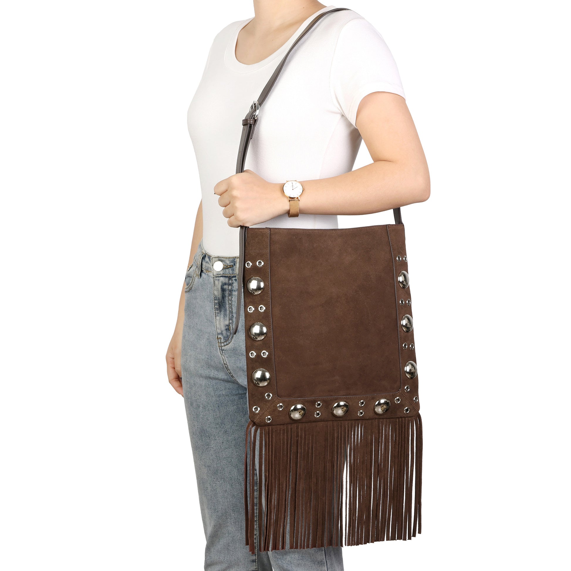 Crafted from soft suede leather, this statement crossbody bag features polished silver-tone stud detailing and flowing fringe for a refined bohemian touch. A slim adjustable strap allows for comfortable shoulder or crossbody wear.