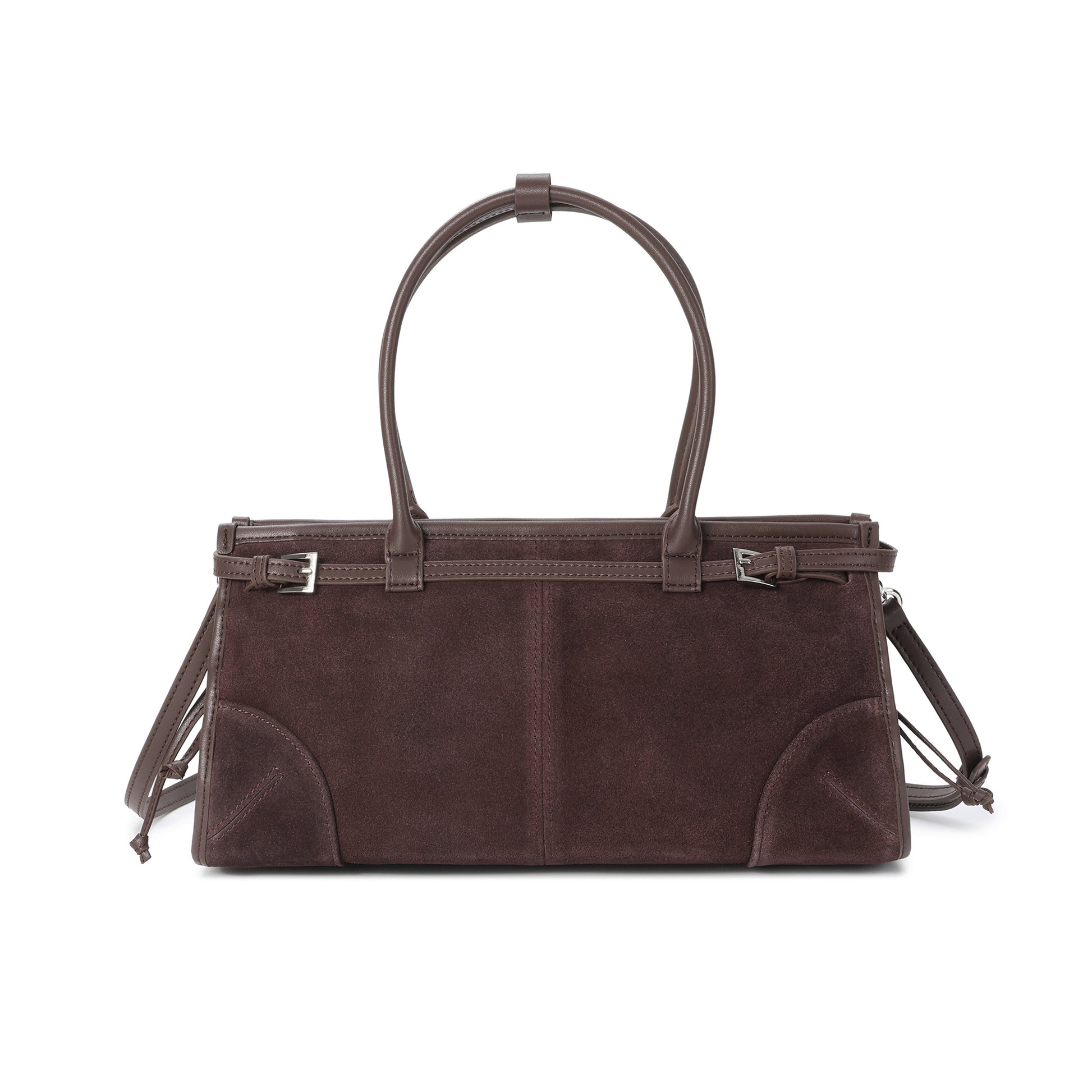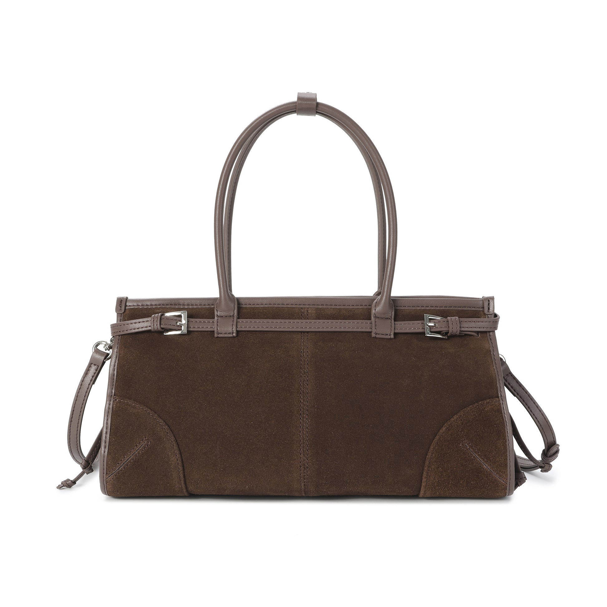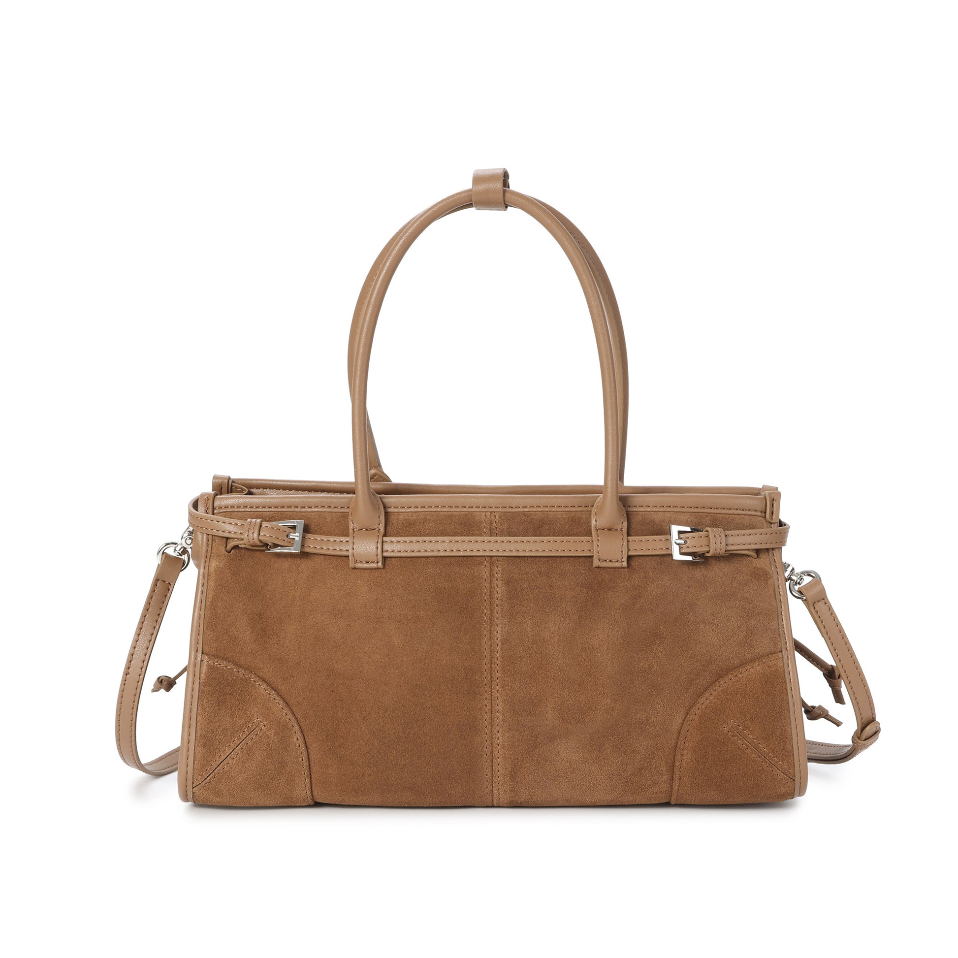 Effortlessly refined, this structured tote blends rich suede and smooth leather for a sophisticated contrast of textures. Designed with double top handles and a detachable shoulder strap, it offers both polish and practicality. The belted detail along the top adds a modern, tailored finish, while the spacious interior includes a zippered pocket for essentials — making it ideal for daily use or weekend outings.