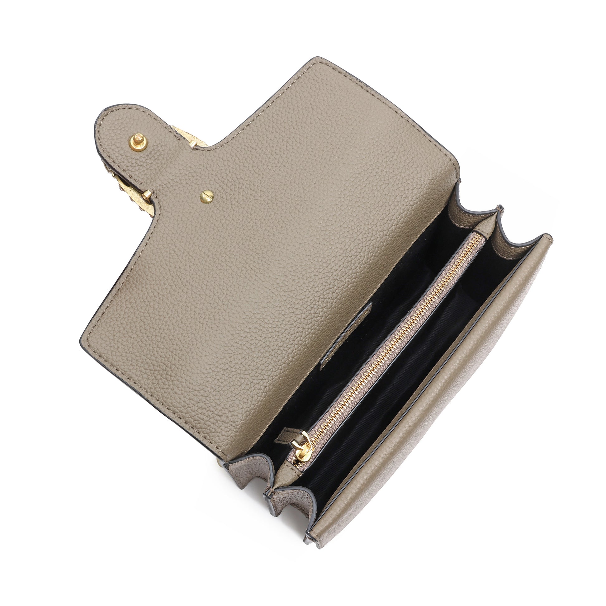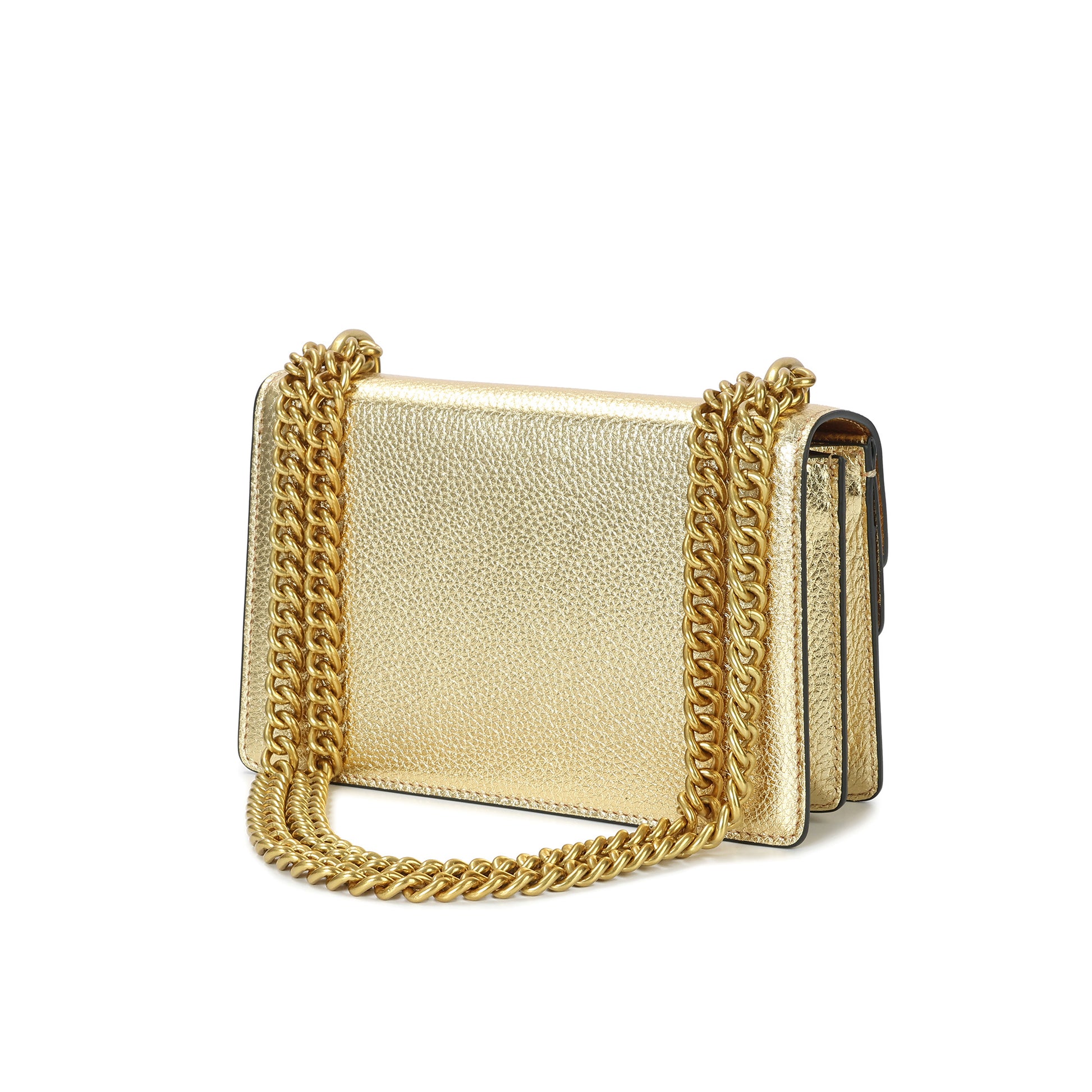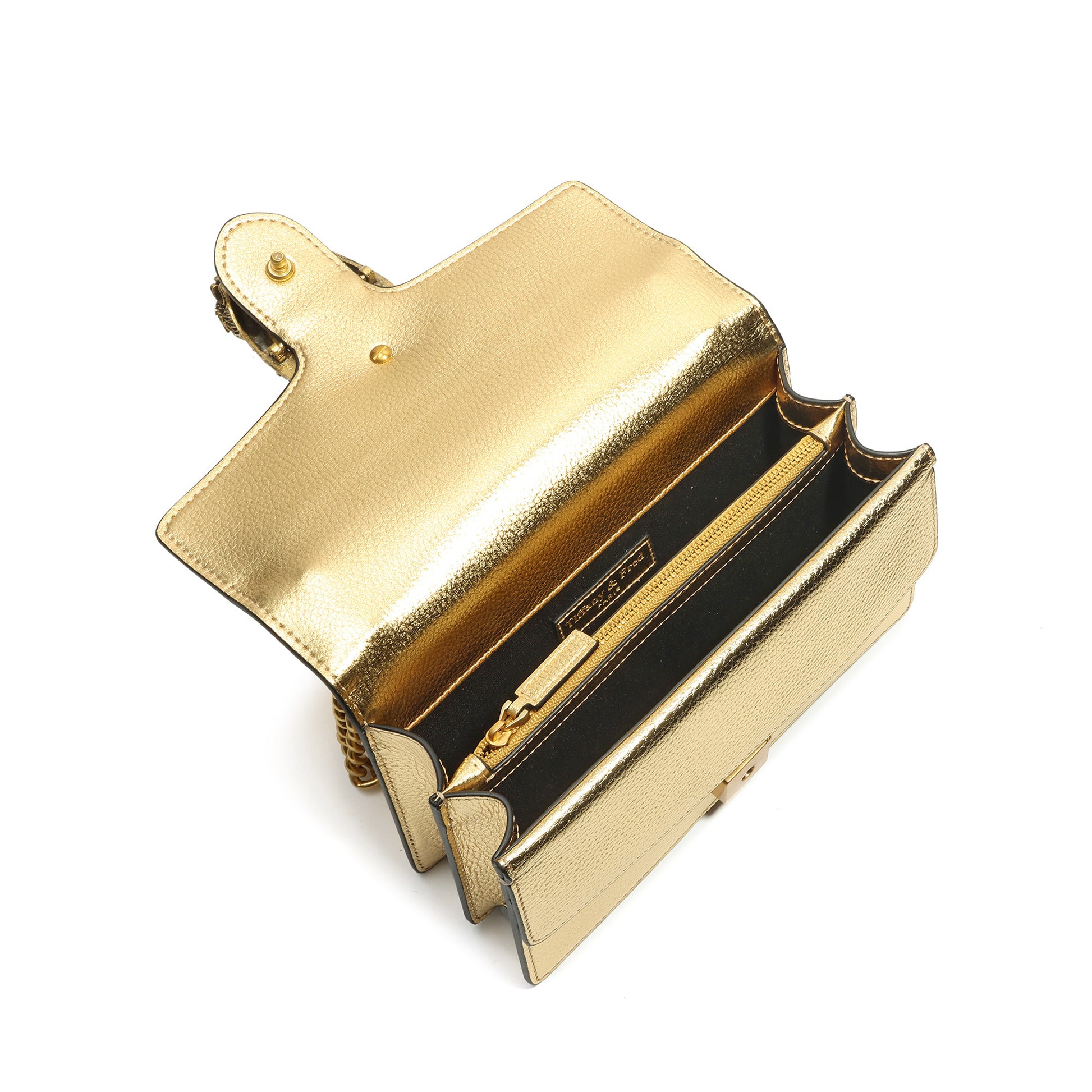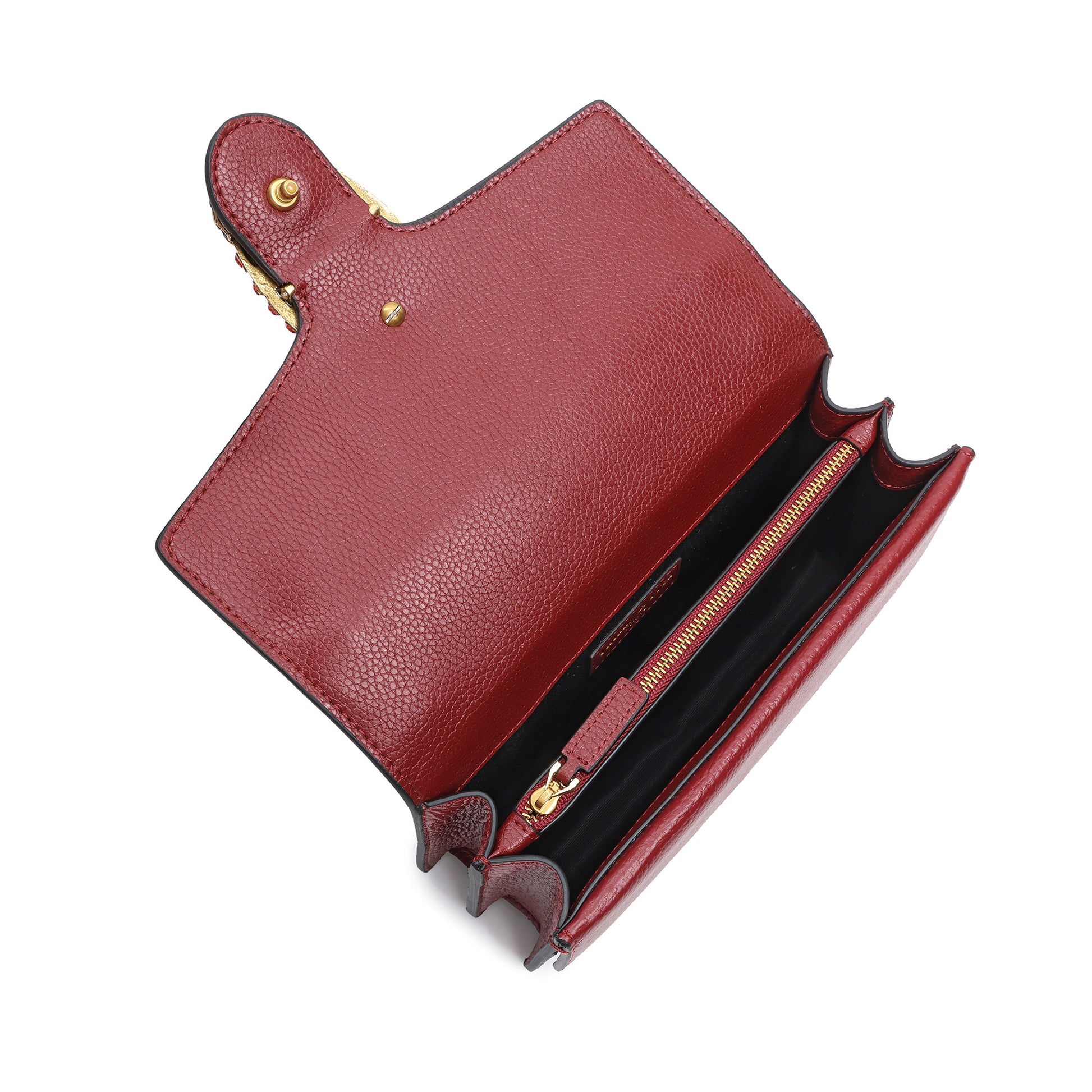 A crystal adorned, double headed dragon hardware detail adds glamour and edge to a structured crossbody bag created from pebbled leather. - Single detachable chain strap - Foldover flap with magnetic closure