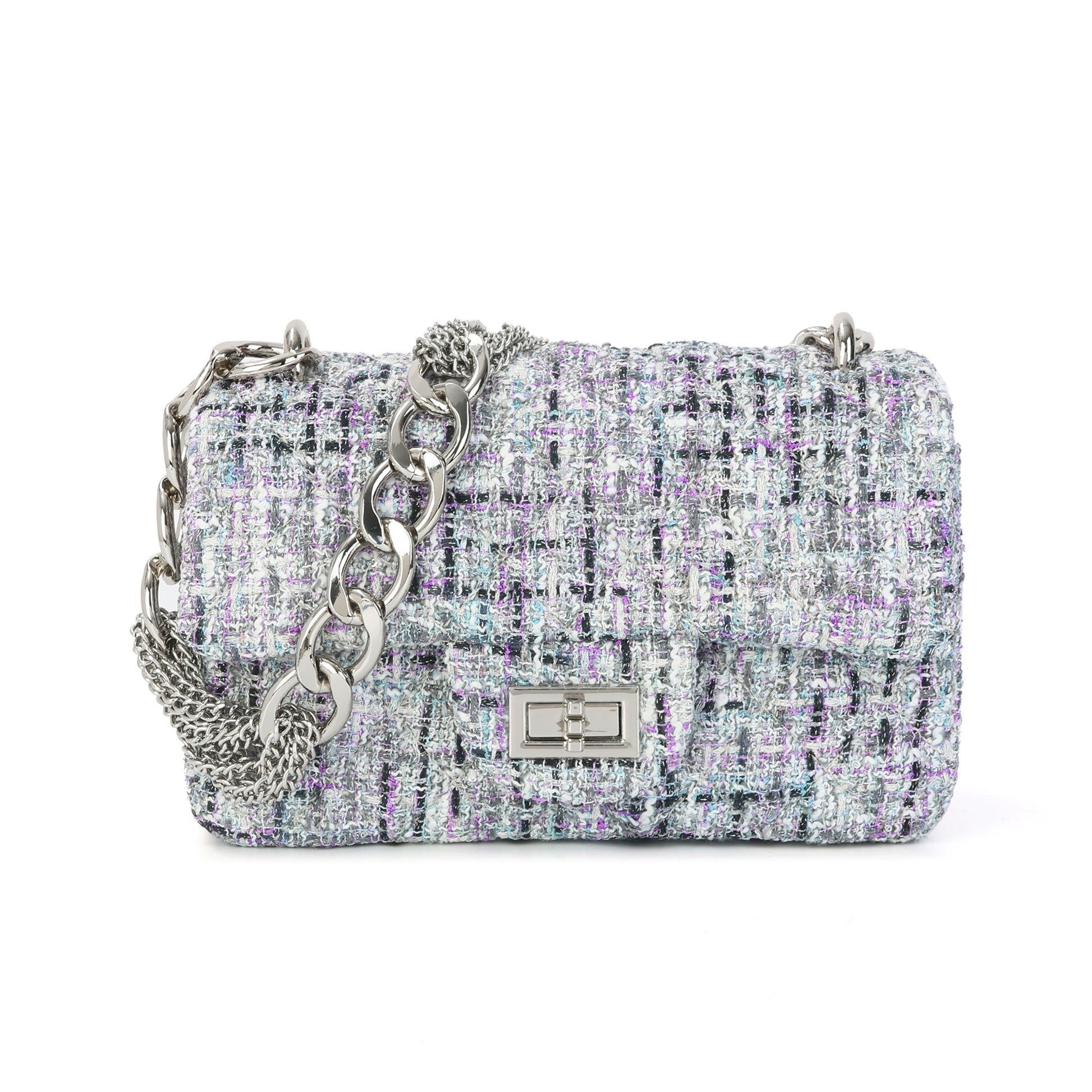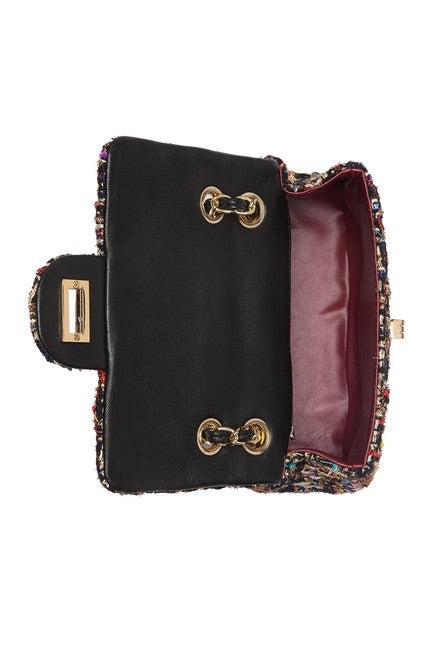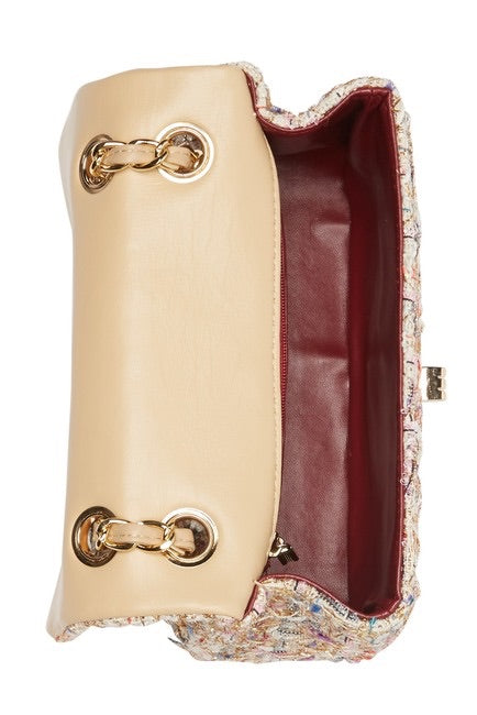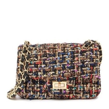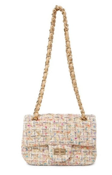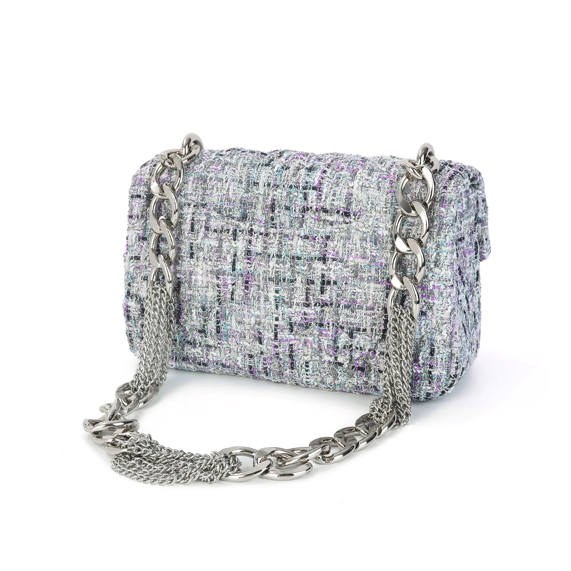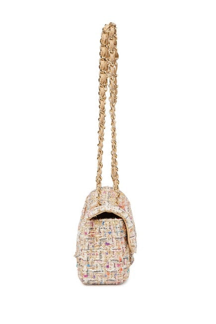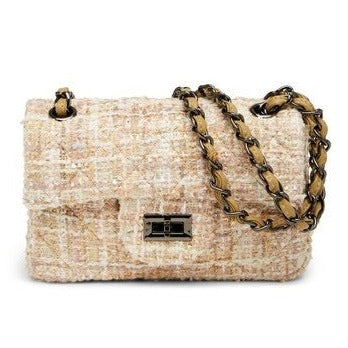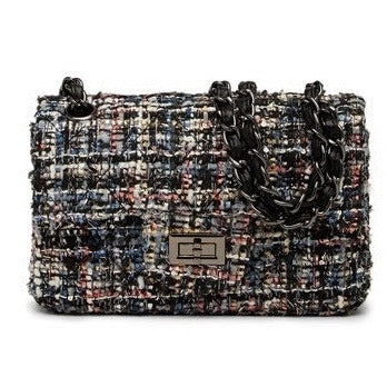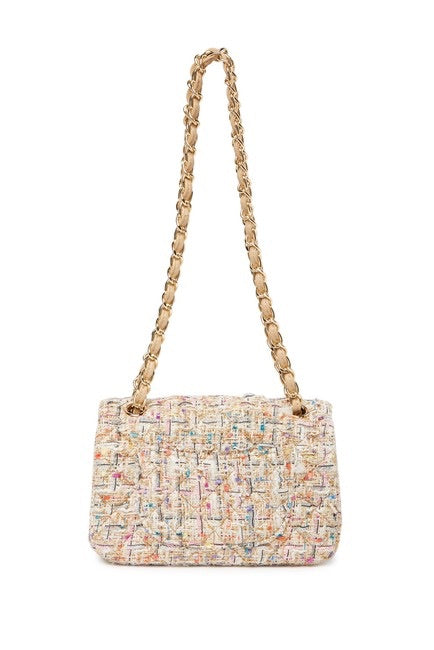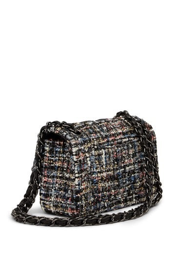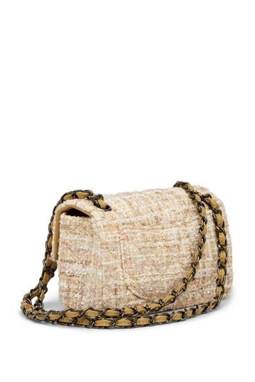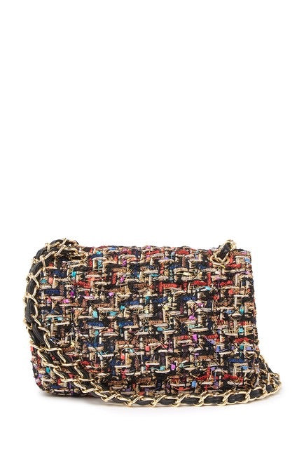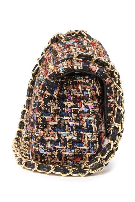 - Metallic tweed covers a classic crossbody bag style that is finished with a modern, leather and chain strap.