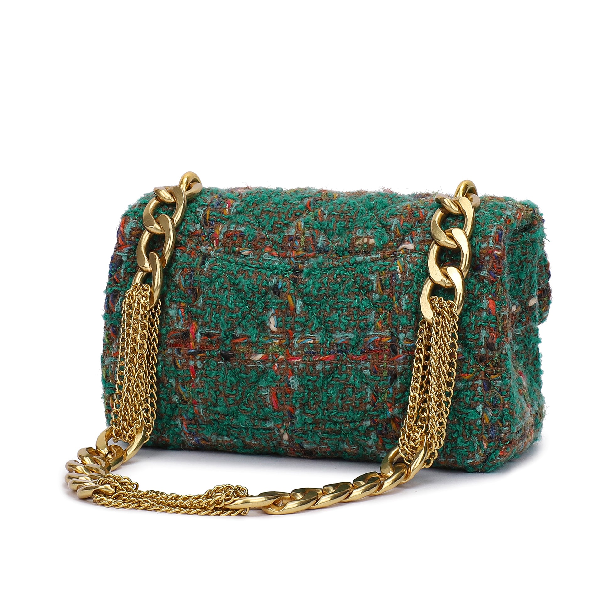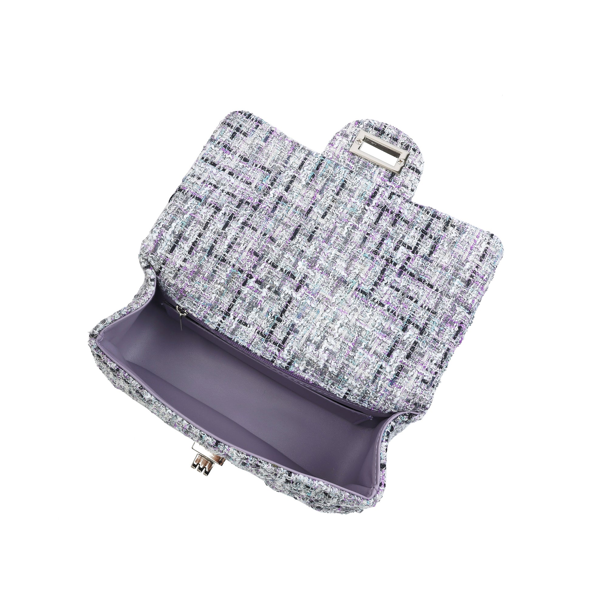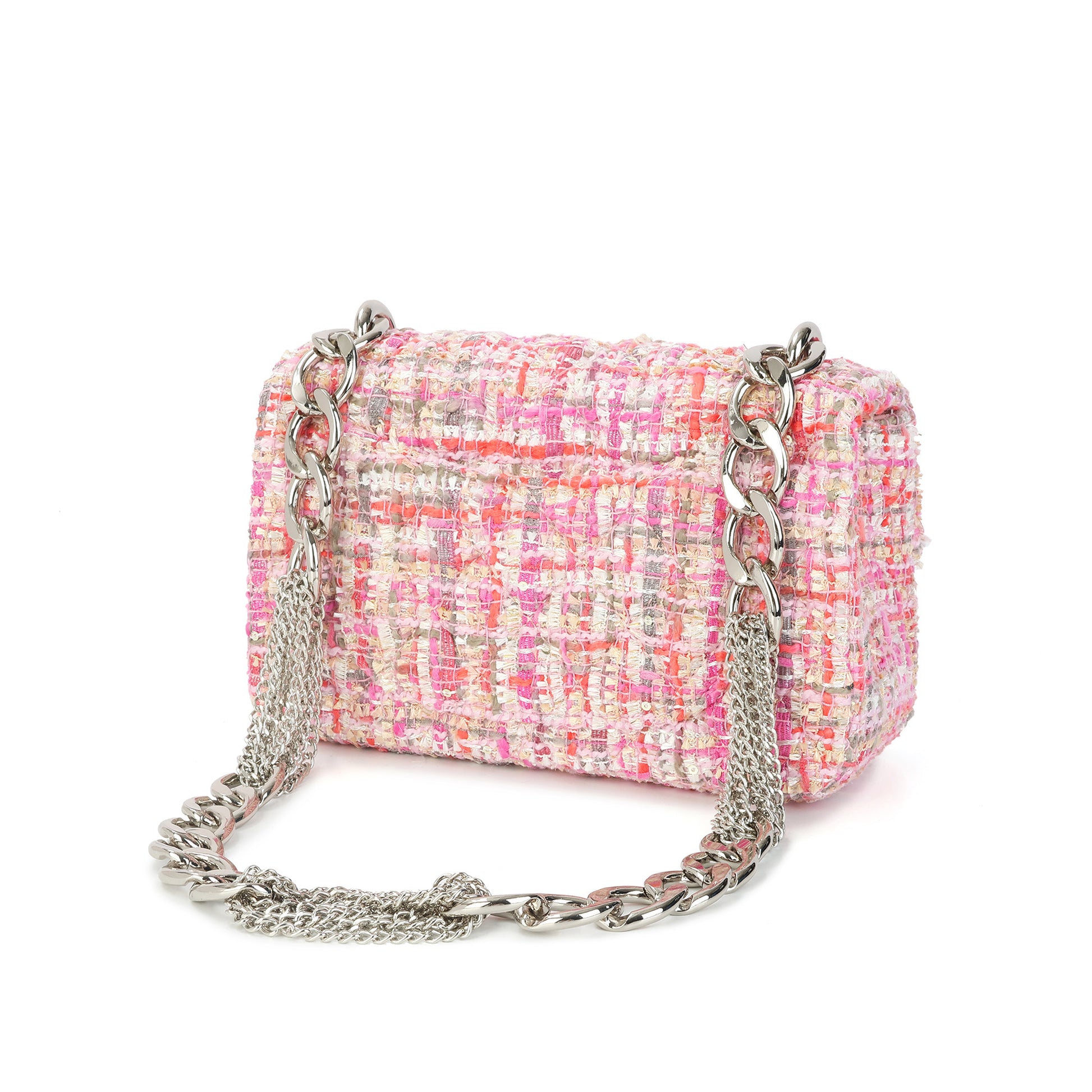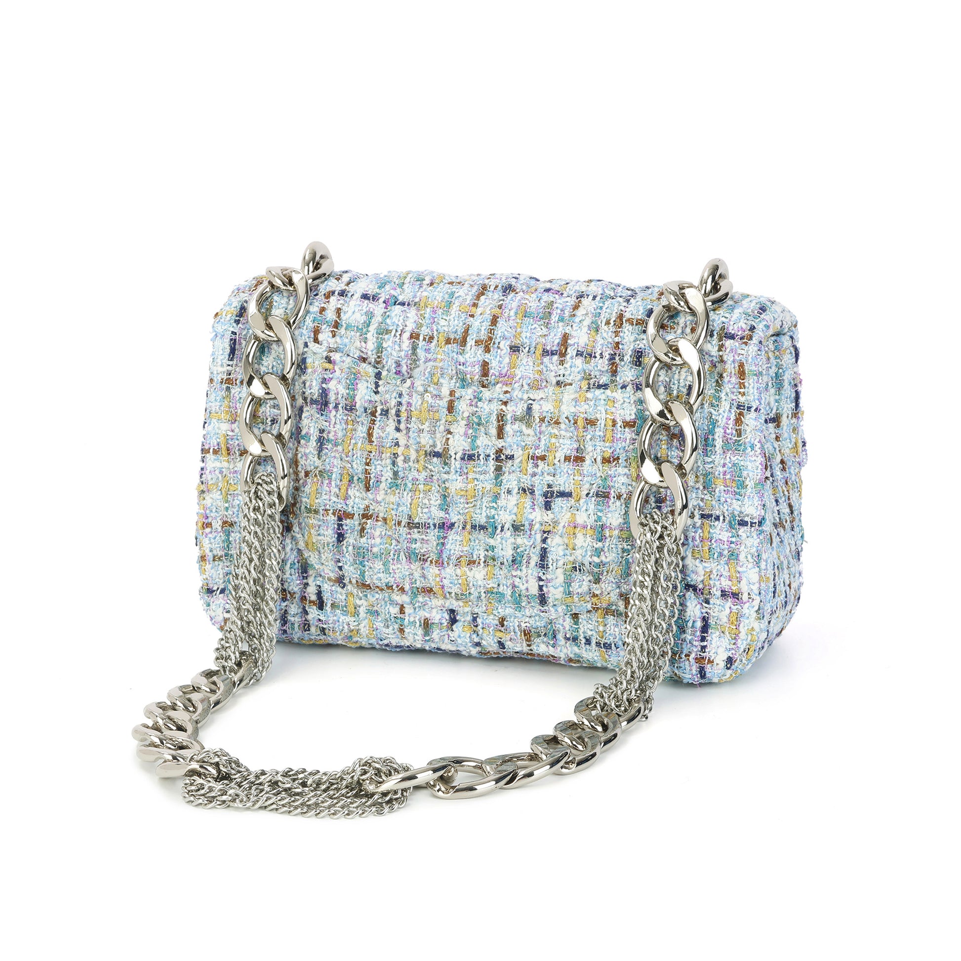 - Metallic tweed covers a classic crossbody bag style that is finished with a modern, leather and chain strap.