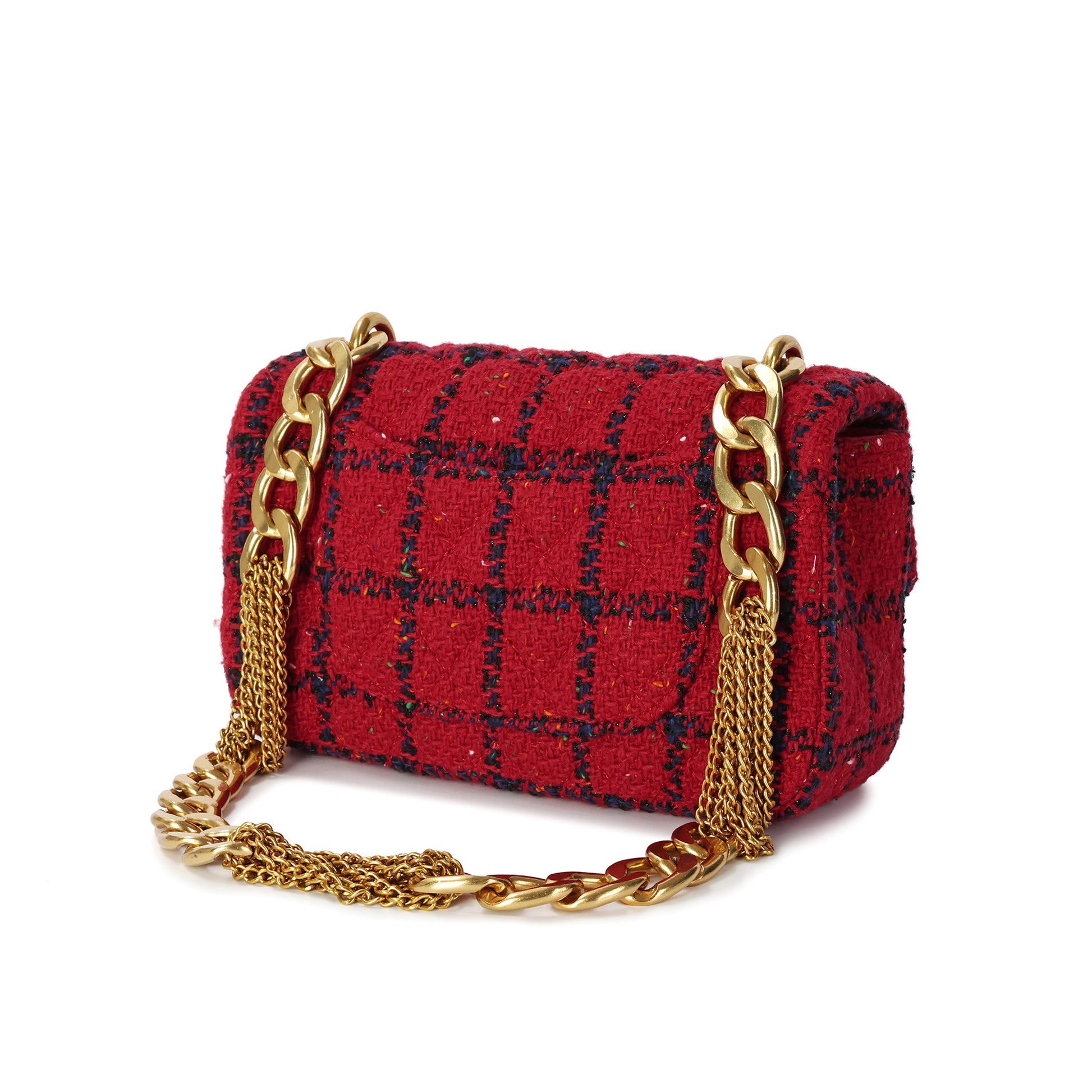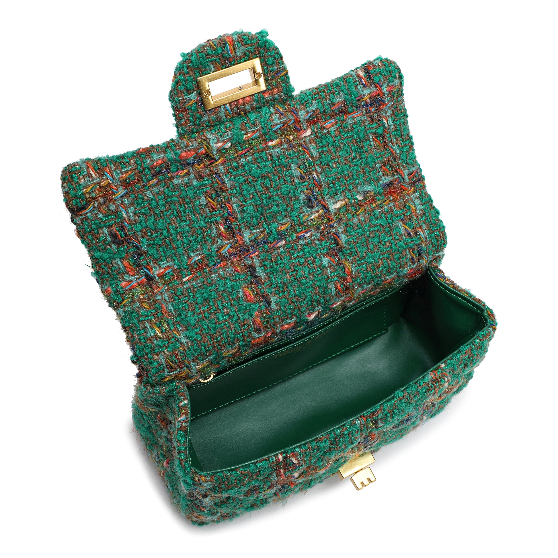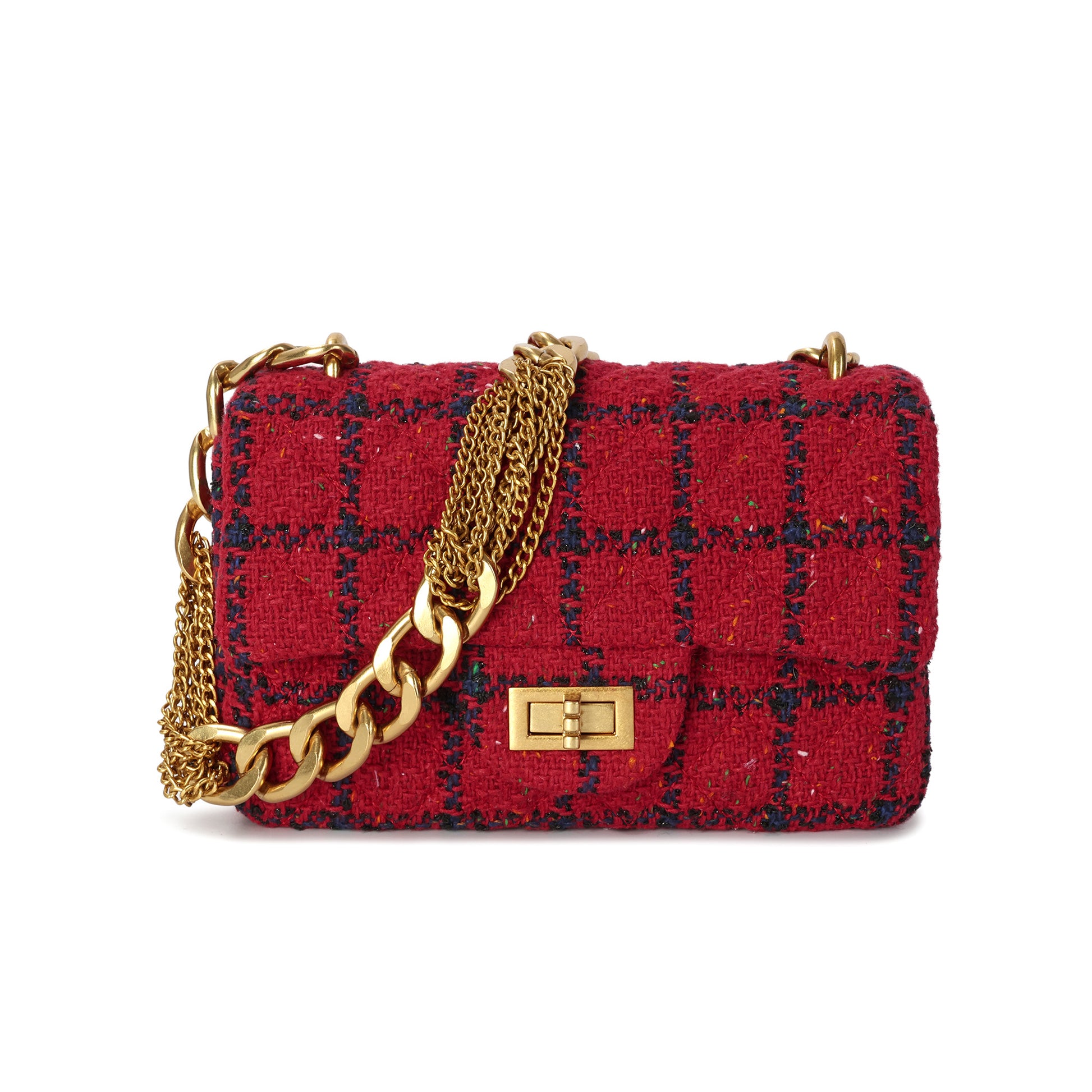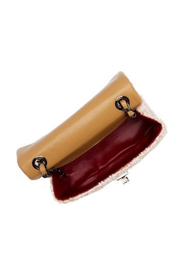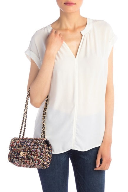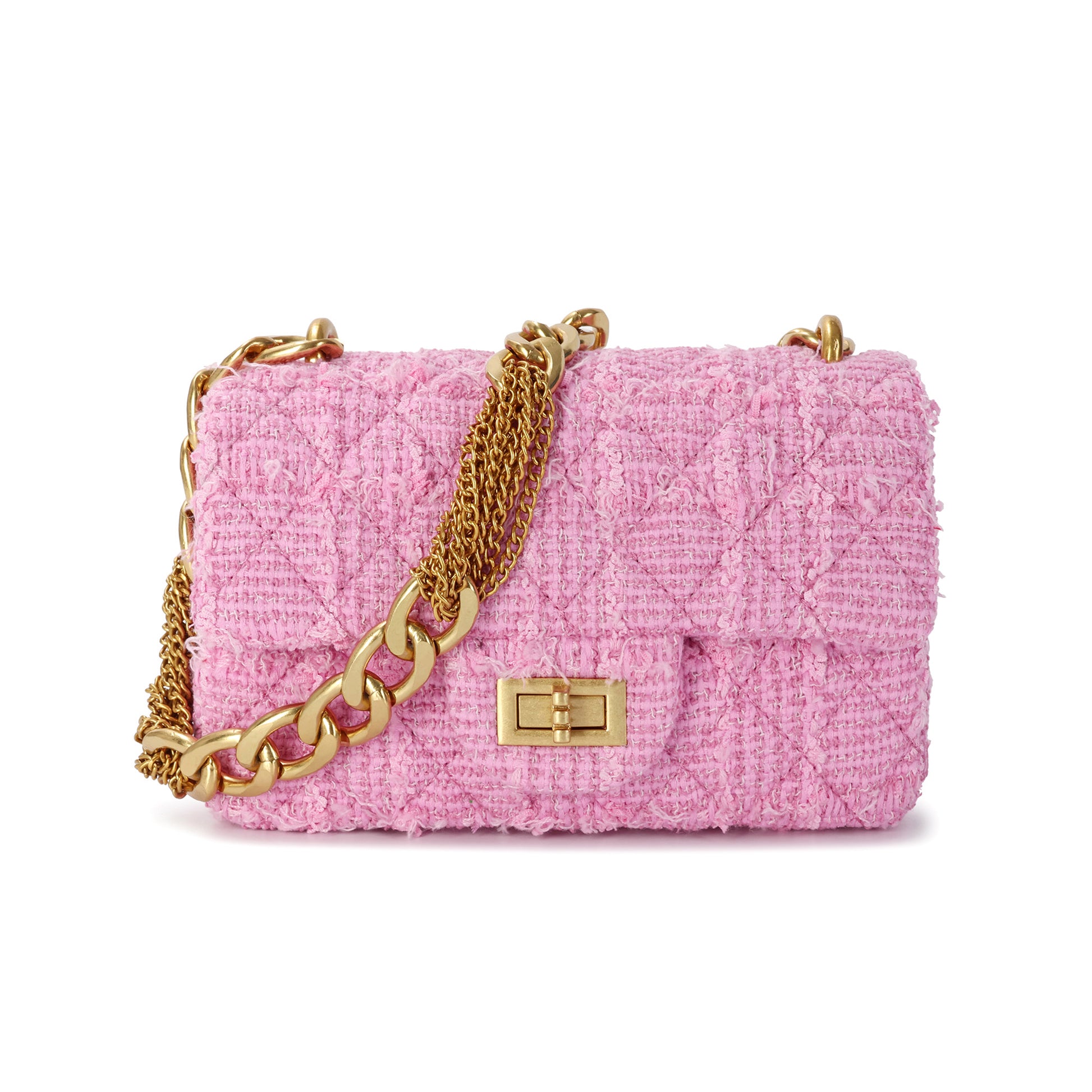 - Metallic tweed covers a classic crossbody bag style that is finished with a modern, leather and chain strap.