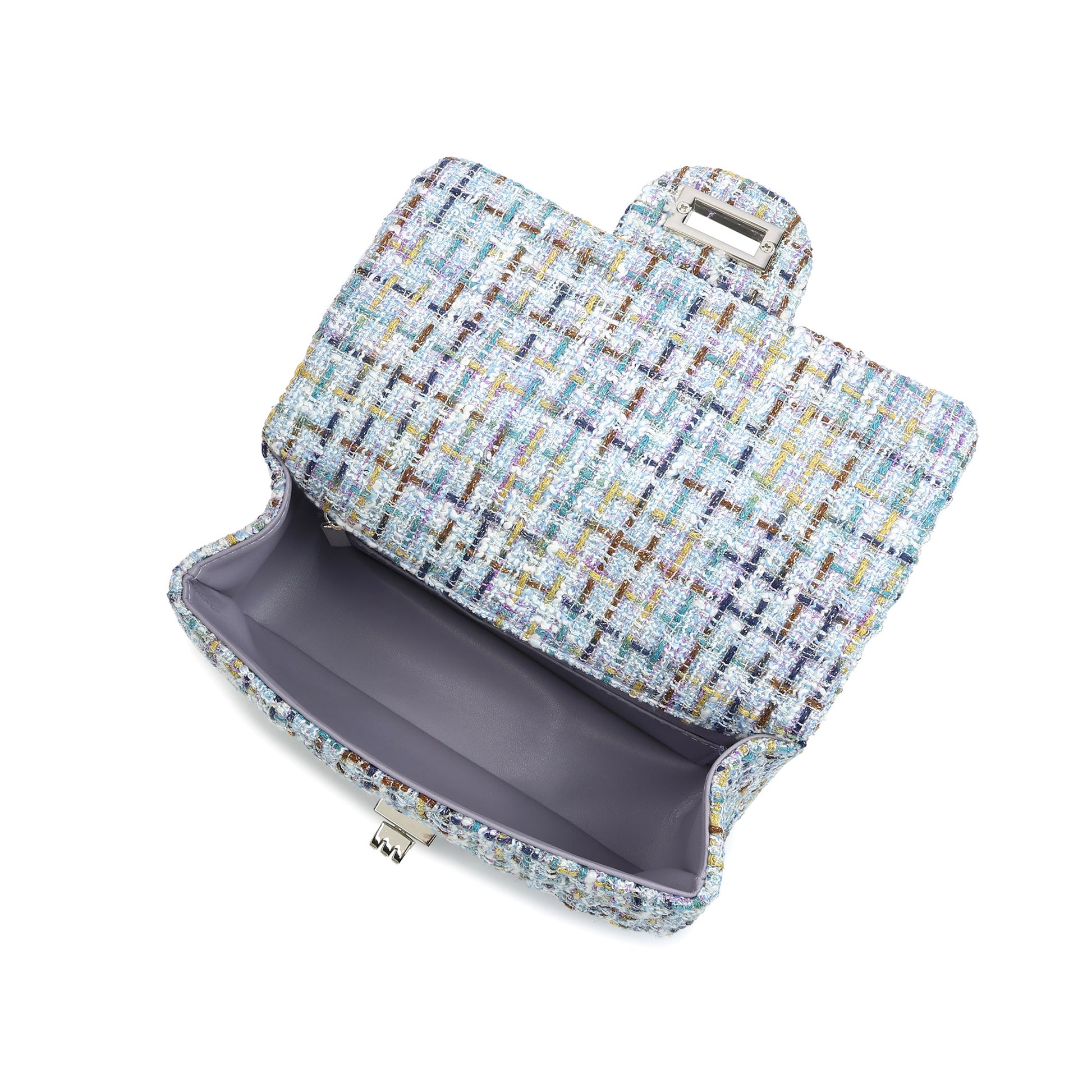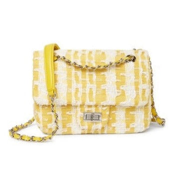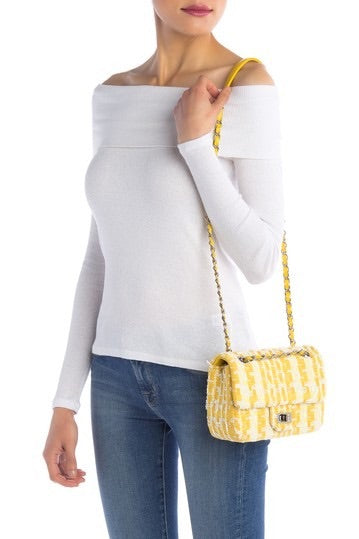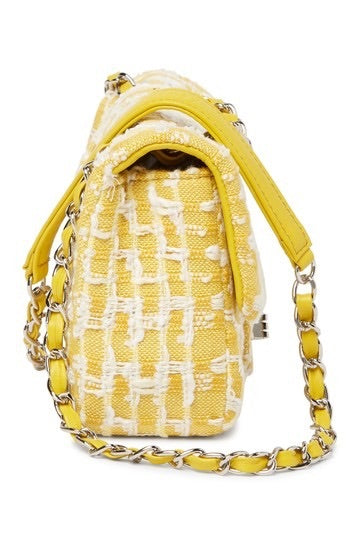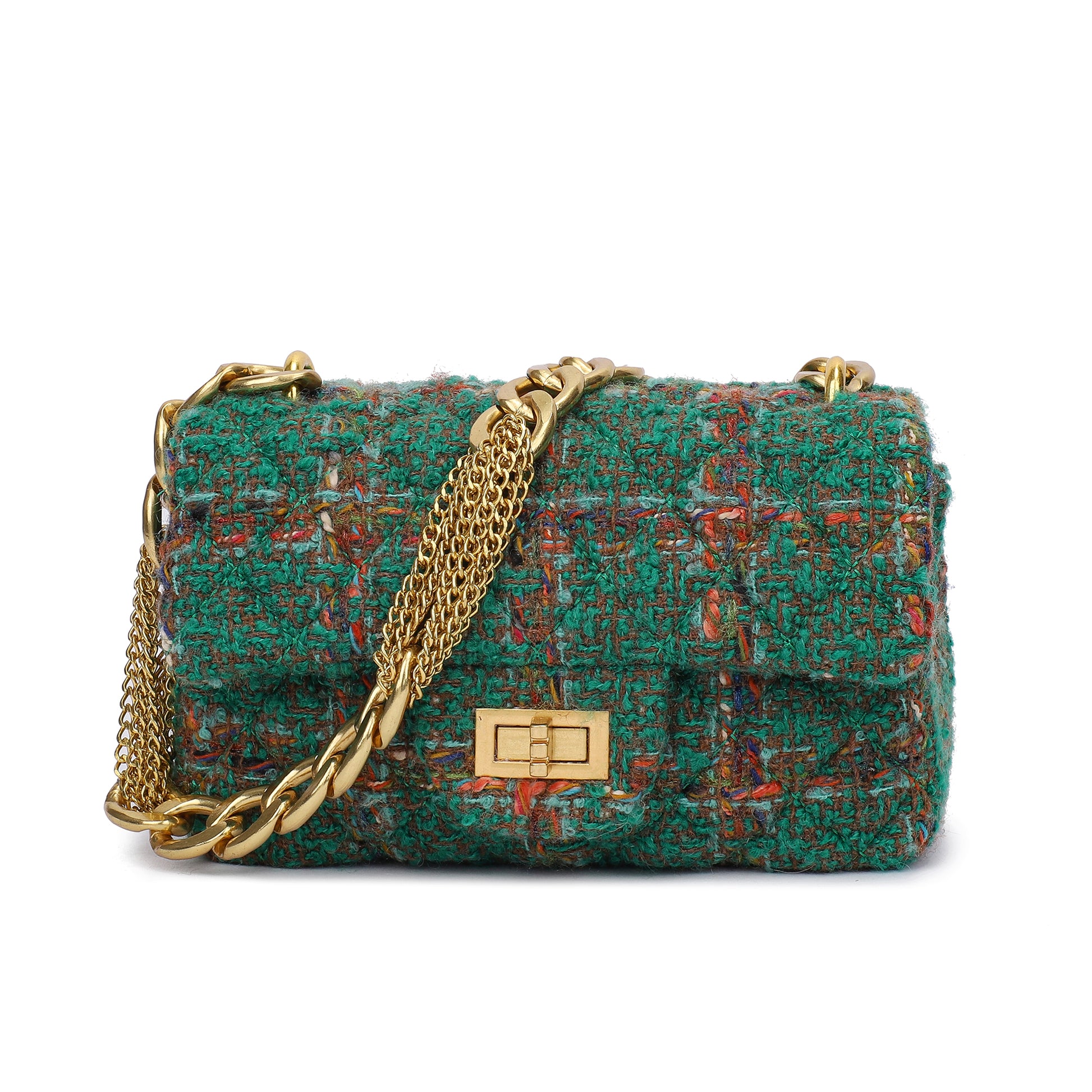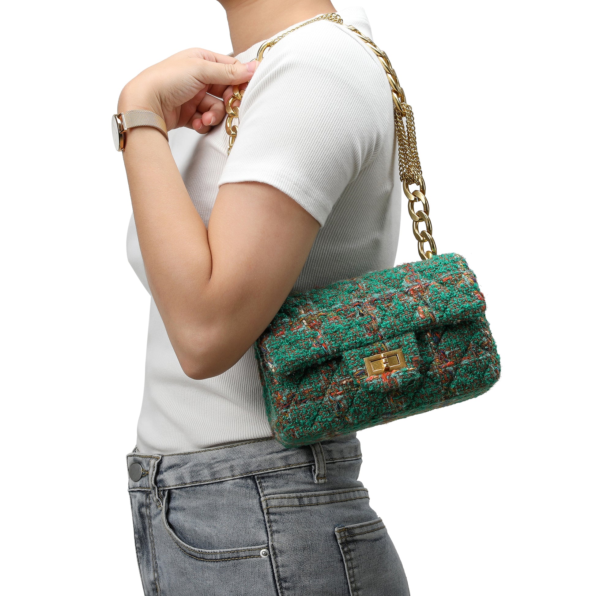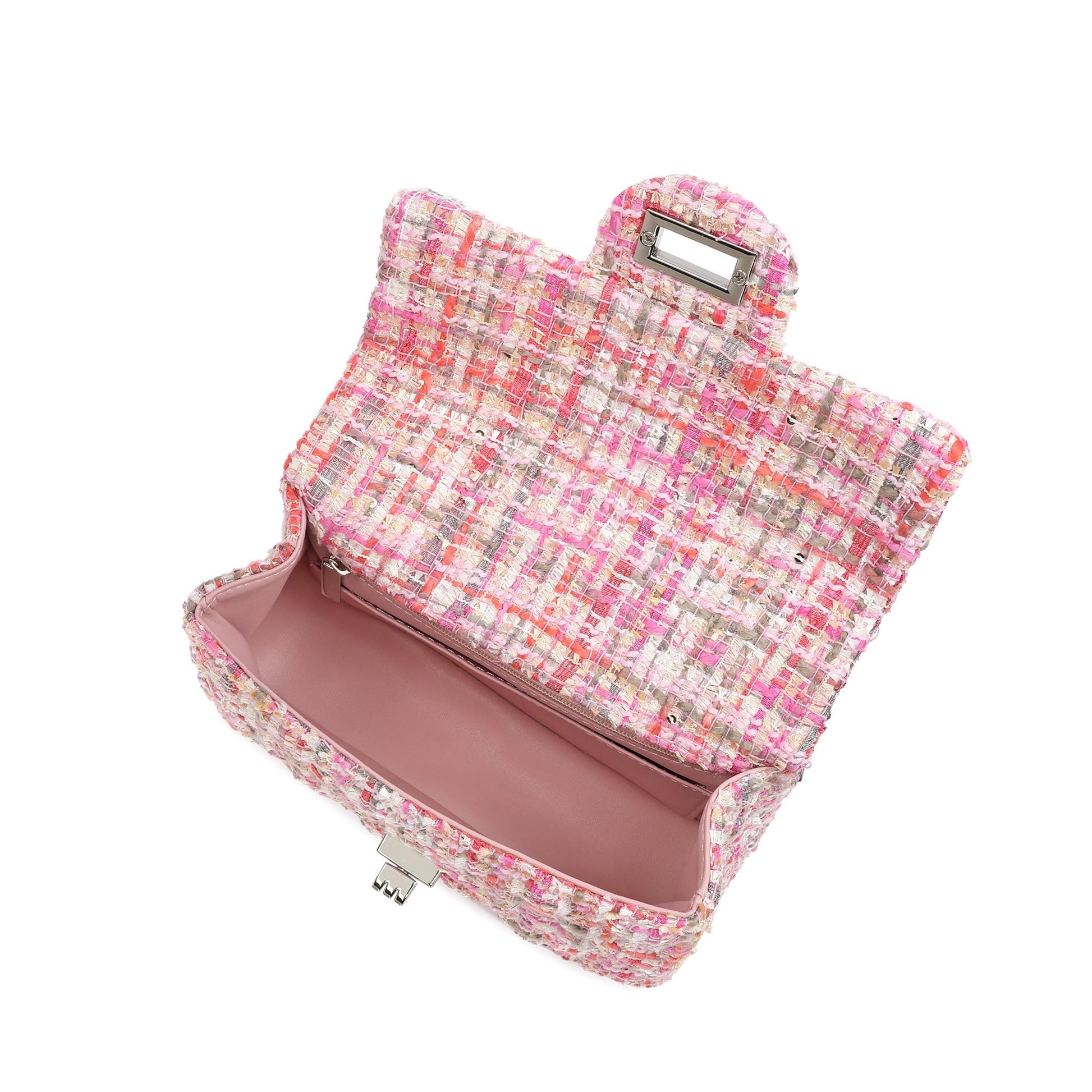 - Metallic tweed covers a classic crossbody bag style that is finished with a modern, leather and chain strap.