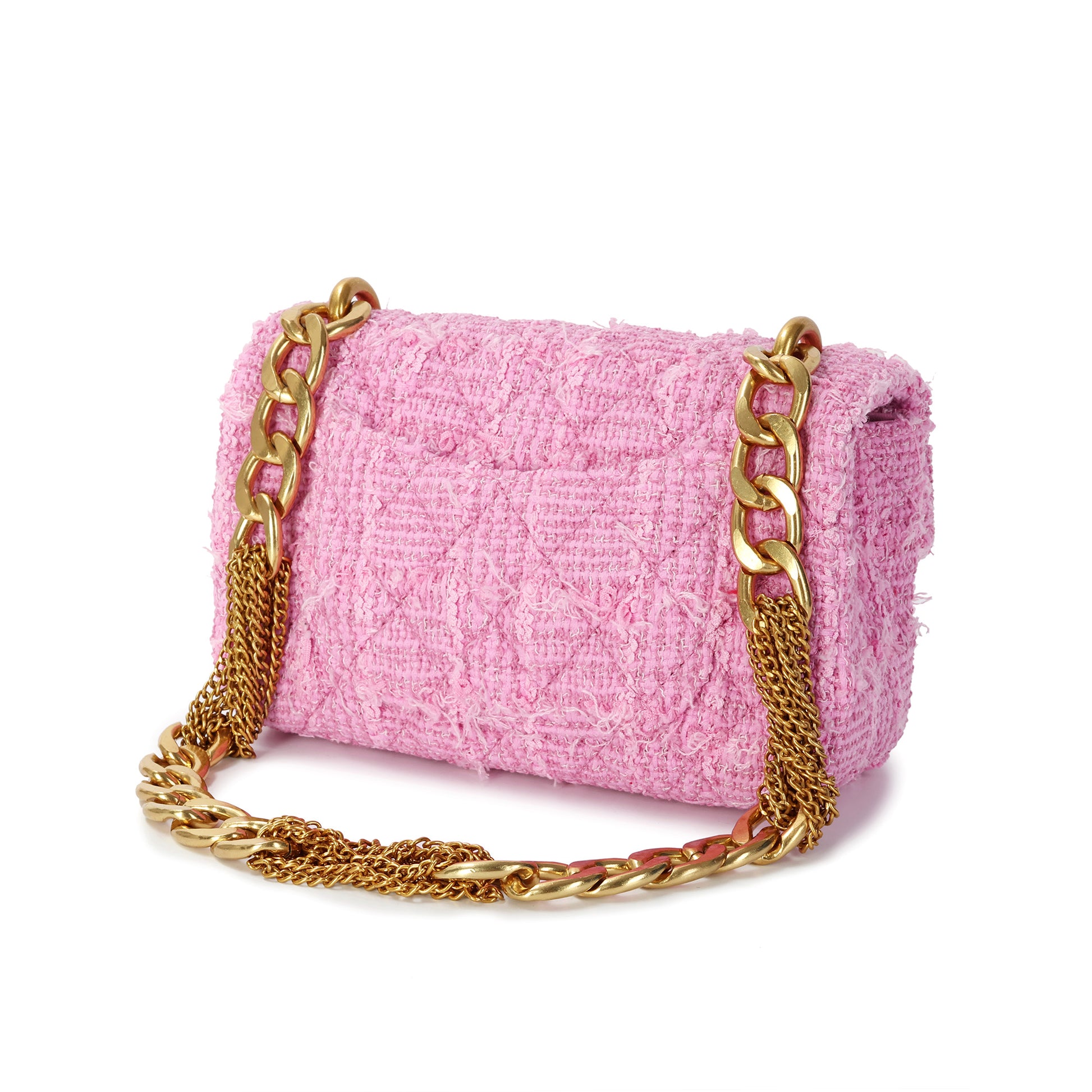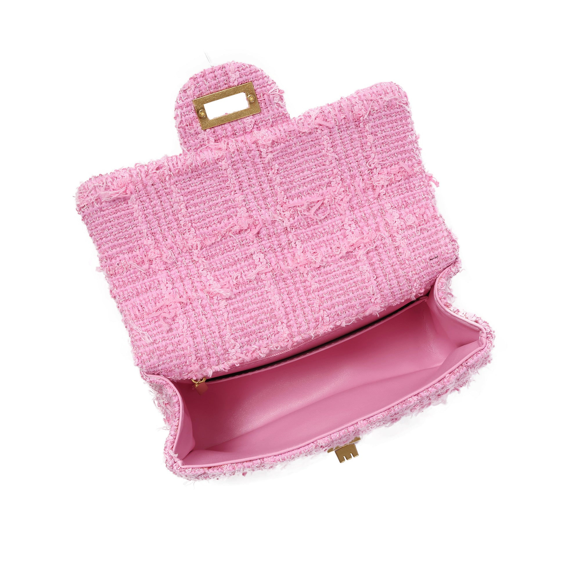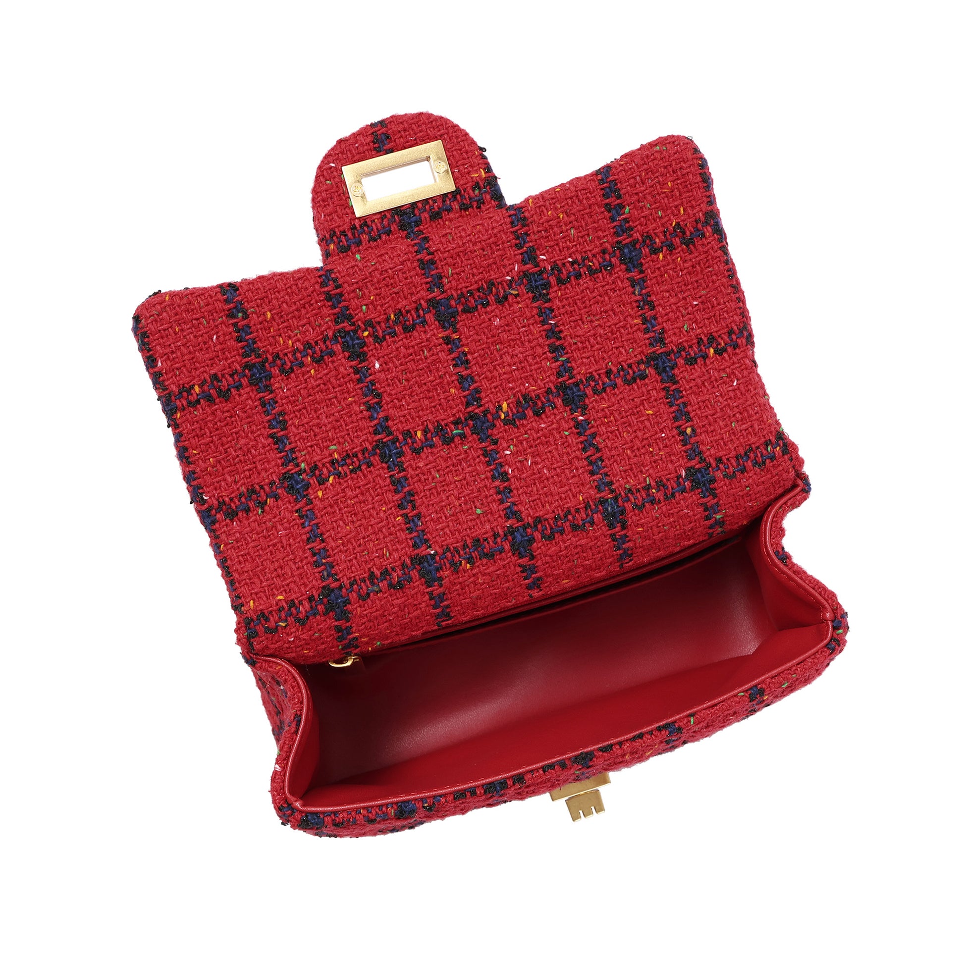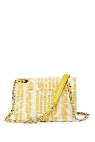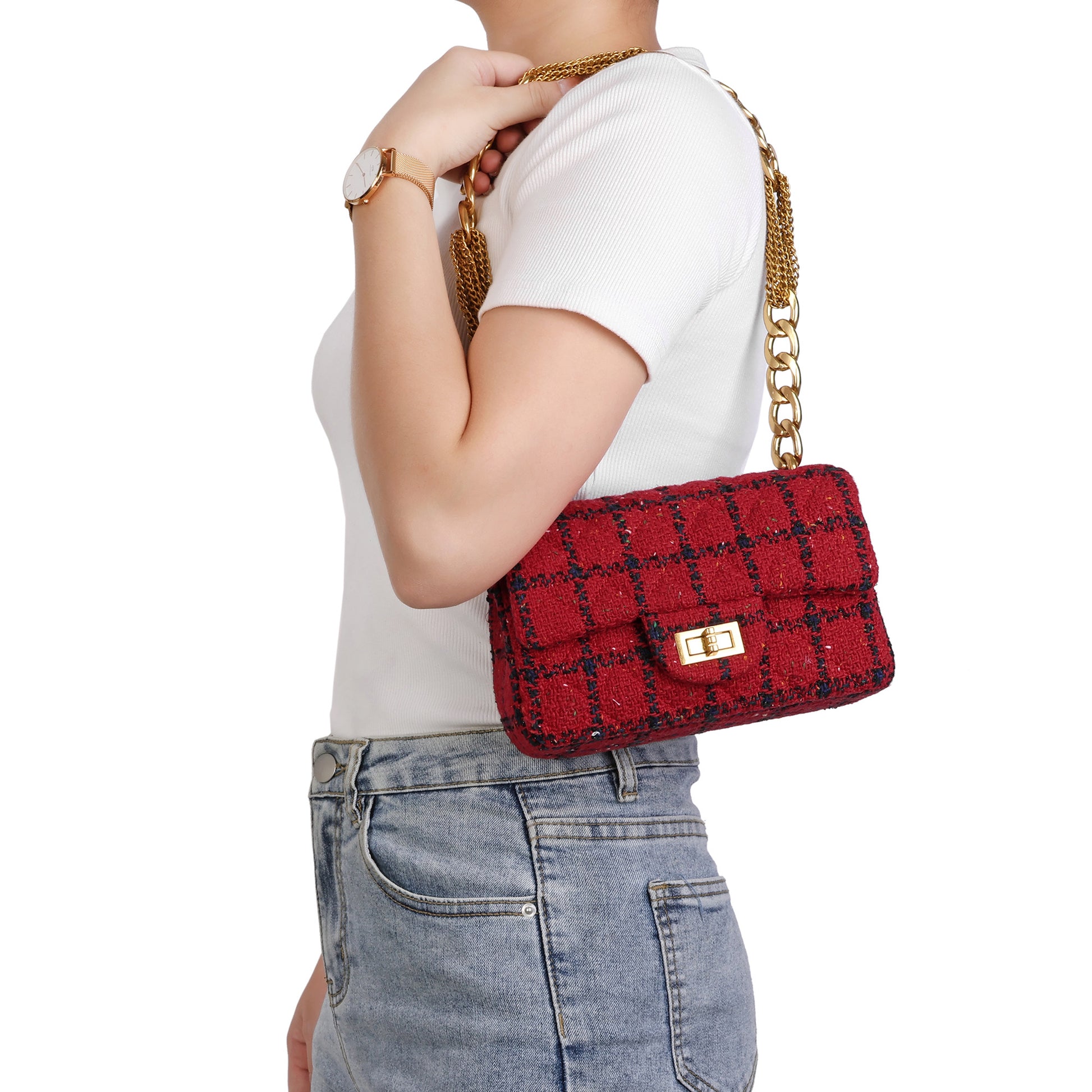 - Metallic tweed covers a classic crossbody bag style that is finished with a modern, leather and chain strap.