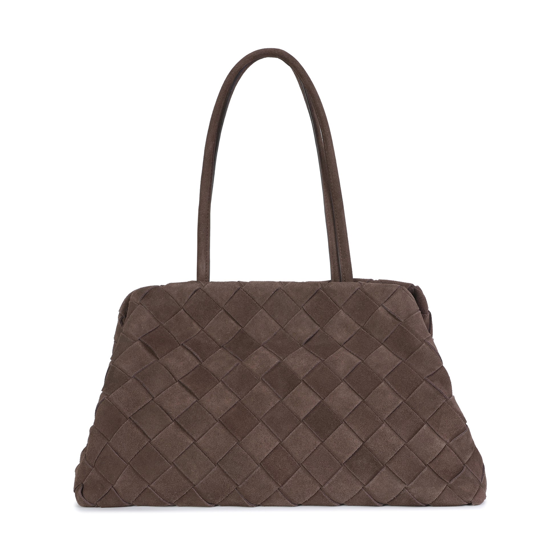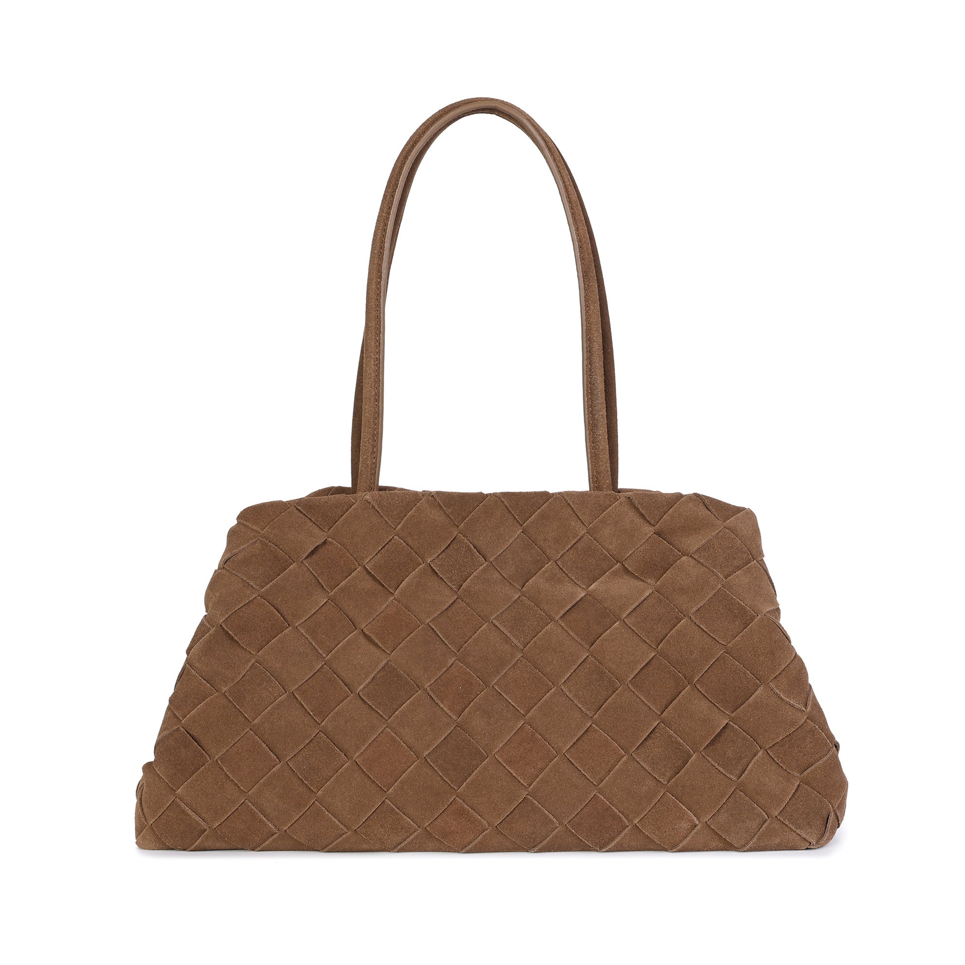 A sophisticated everyday tote crafted from luxuriously soft woven suede leather, designed with a relaxed yet polished silhouette. The intricate basket-weave construction adds rich texture and artisanal appeal, while the gently structured shape offers effortless elegance. Finished with comfortable shoulder straps, this tote is ideal for day-to-day wear, easily transitioning from casual outings to refined occasions. The spacious interior provides practical organization without compromising its refined aesthetic.